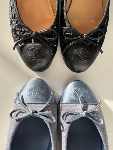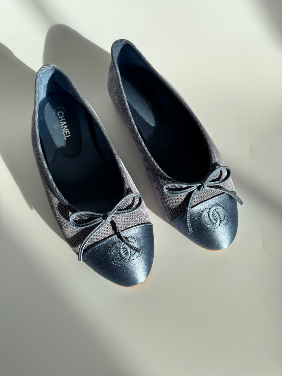 Authentic Chanel Satin Denim Ballet Flat, Blue (36.5)