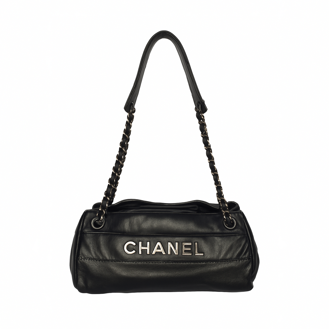 Rare Chanel Logo Shoulder Bag in Black Lambskin Leather