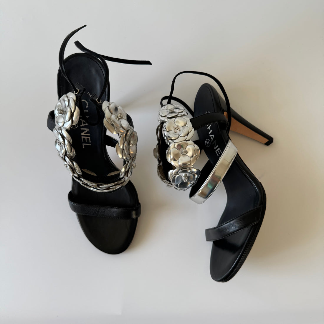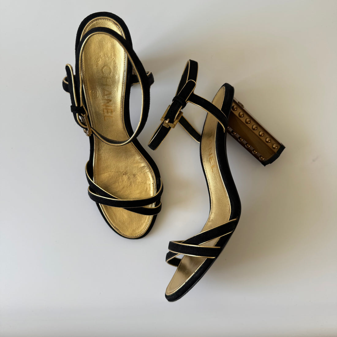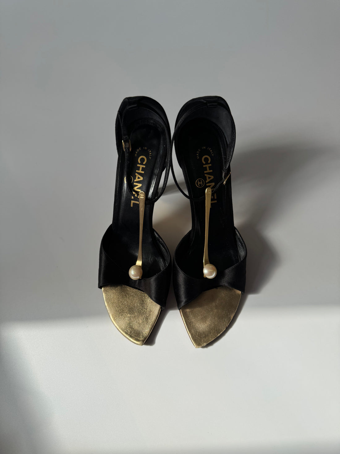 2000s Chanel Vintage Black Satin & Gold Pearl Detail Sandals Size 37.5 UK 4