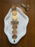 A unique vintage-style bracelet watch with shimmering abalone accents and warm amber-tone links — bold, artistic and beautifully statement-making. Its sculptural shape and jewel-like colours give it a refined, boho-luxury feel.