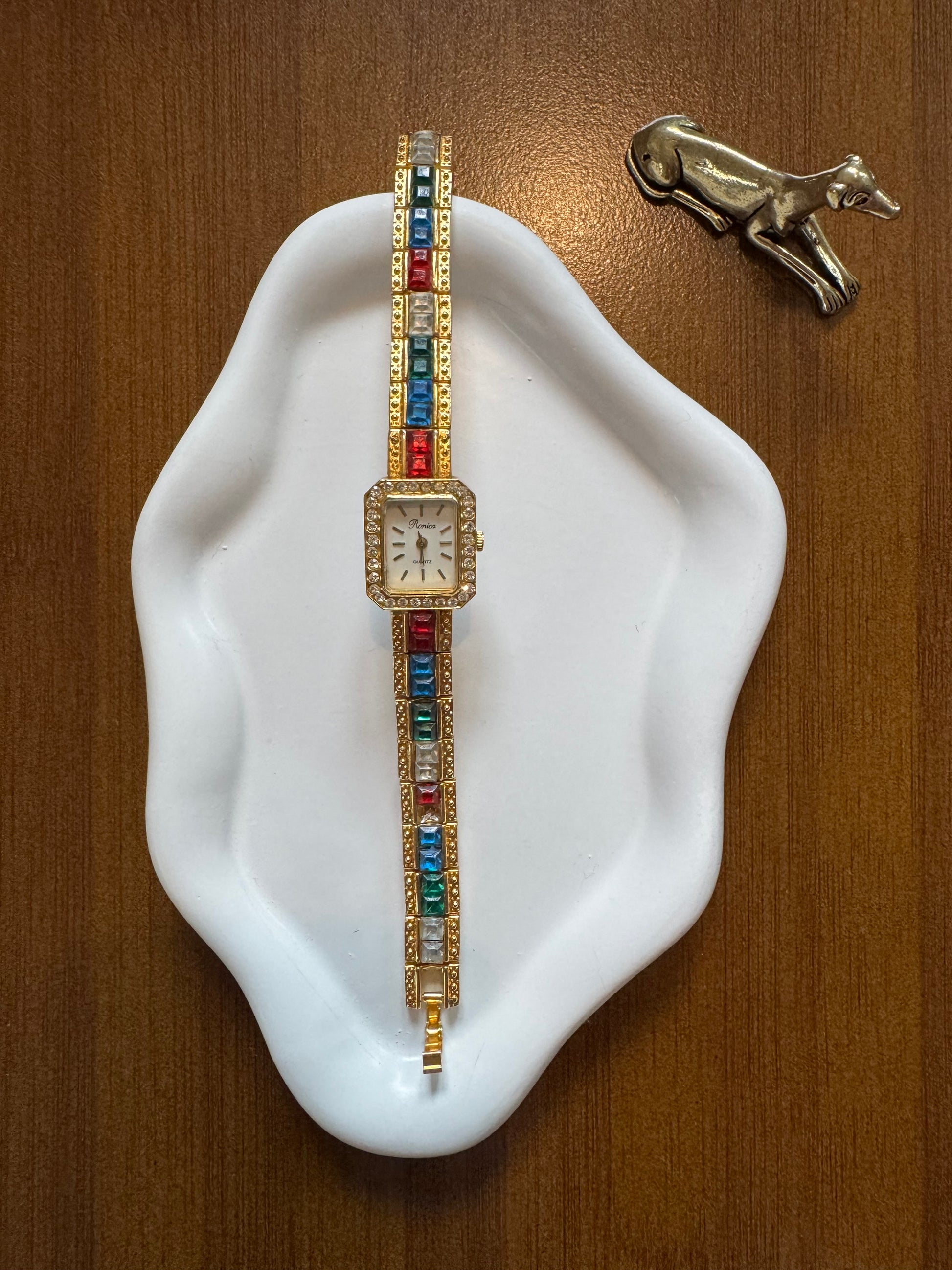 A sparkling gold-tone Rencia bracelet watch set with vibrant jewel-tone crystals — feminine, eye-catching and full of vintage-inspired charm. A perfect little statement piece for evenings or everyday glamour.