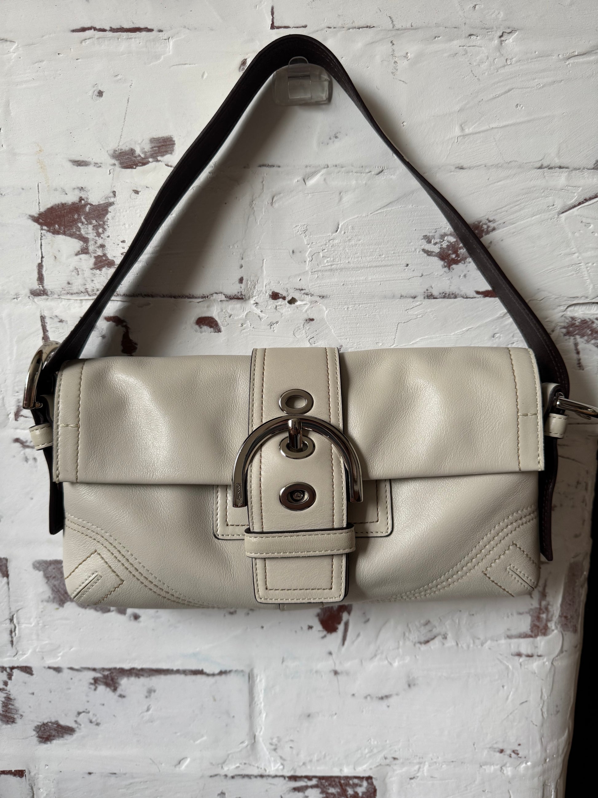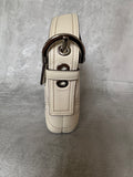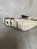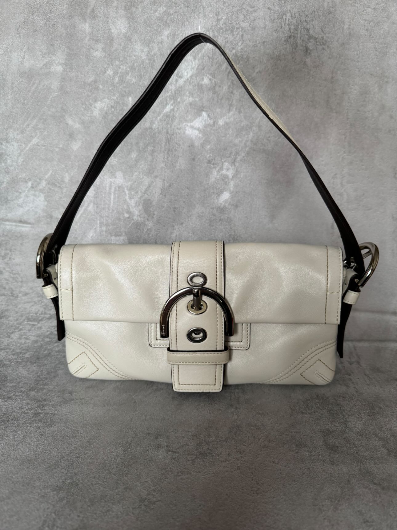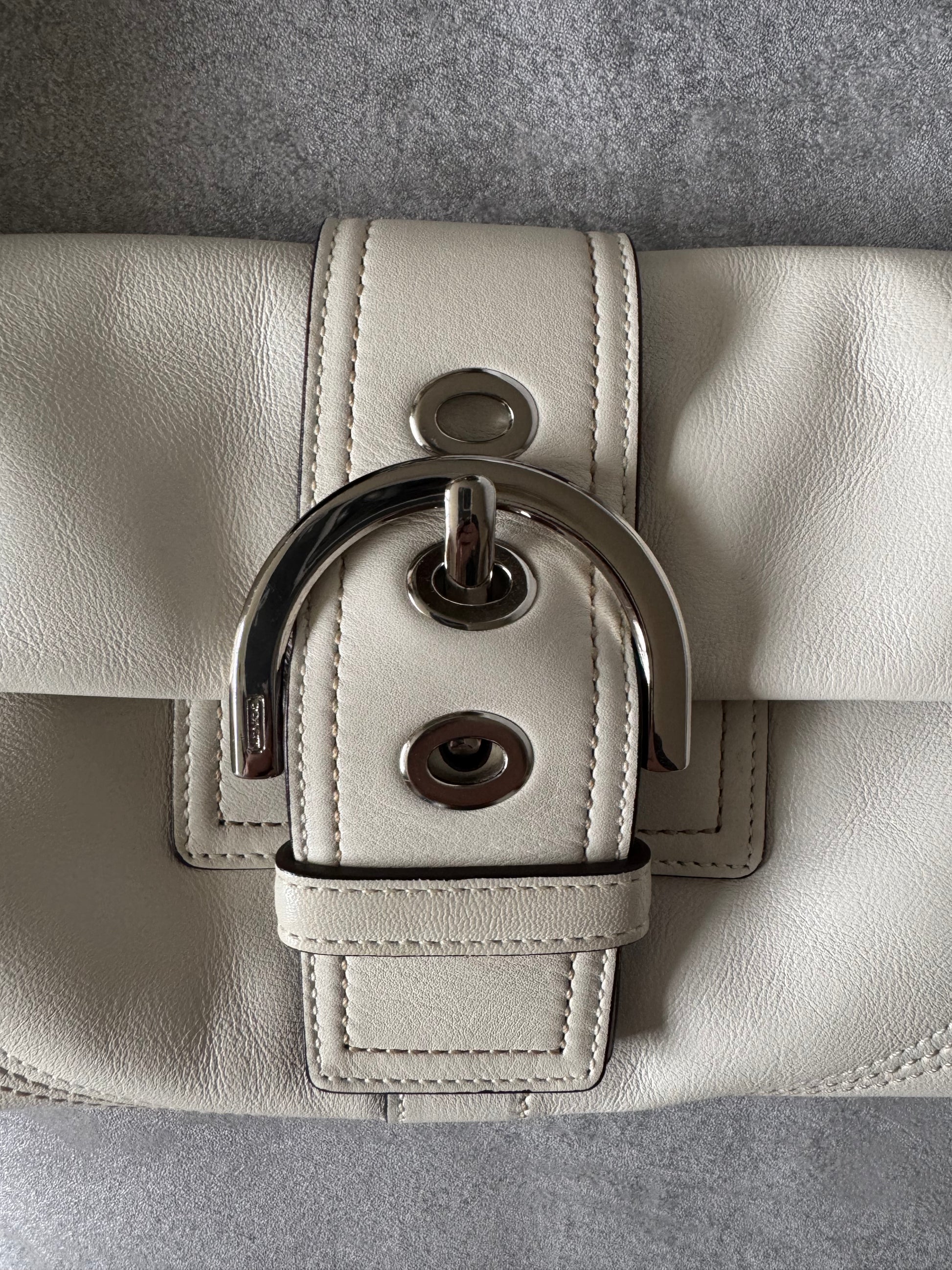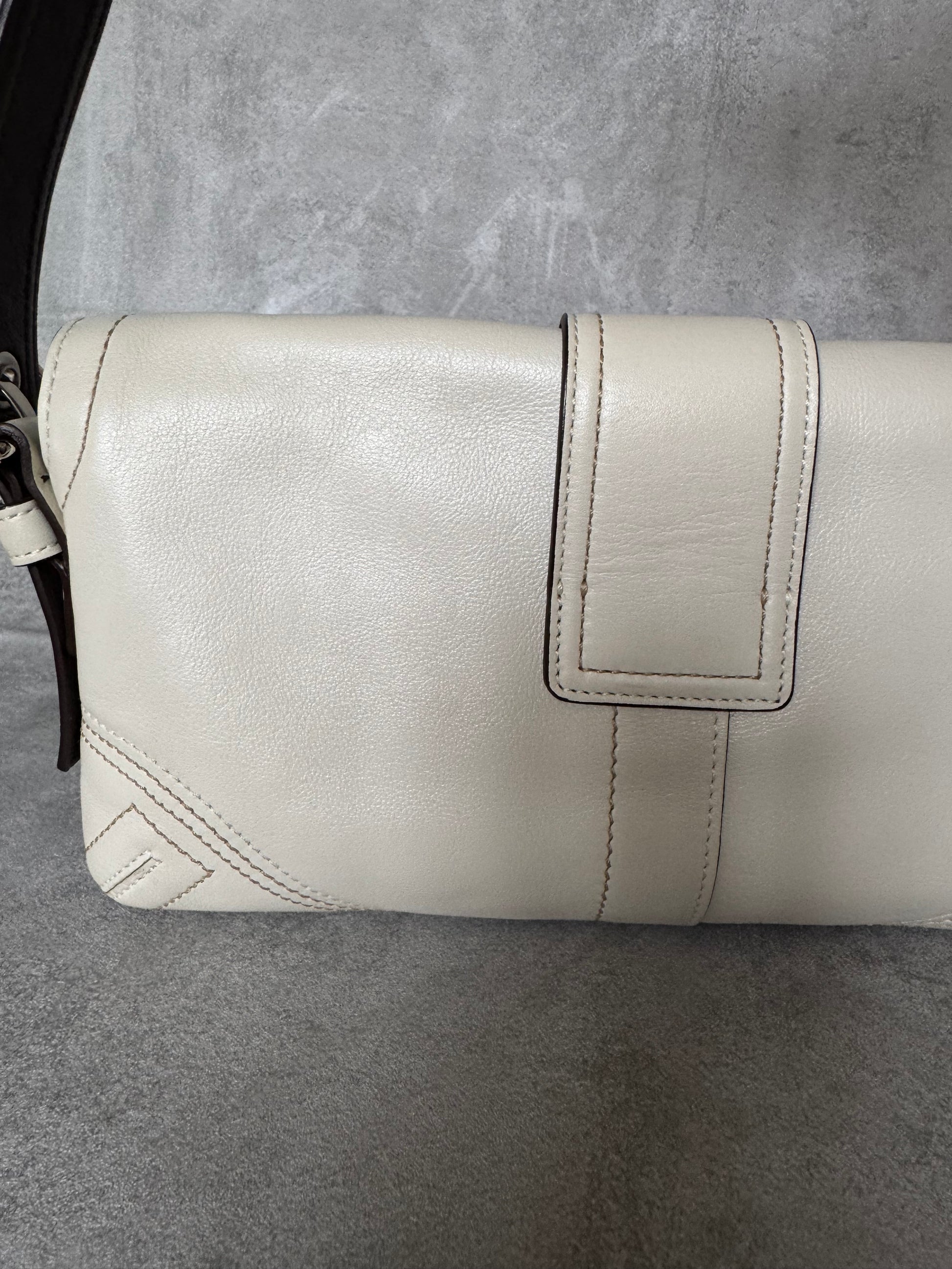 Supple white leather with bold contrast stitching and polished silver-tone hardware. Compact flap front with signature oversized buckle — minimalist, wearable, and timeless.
