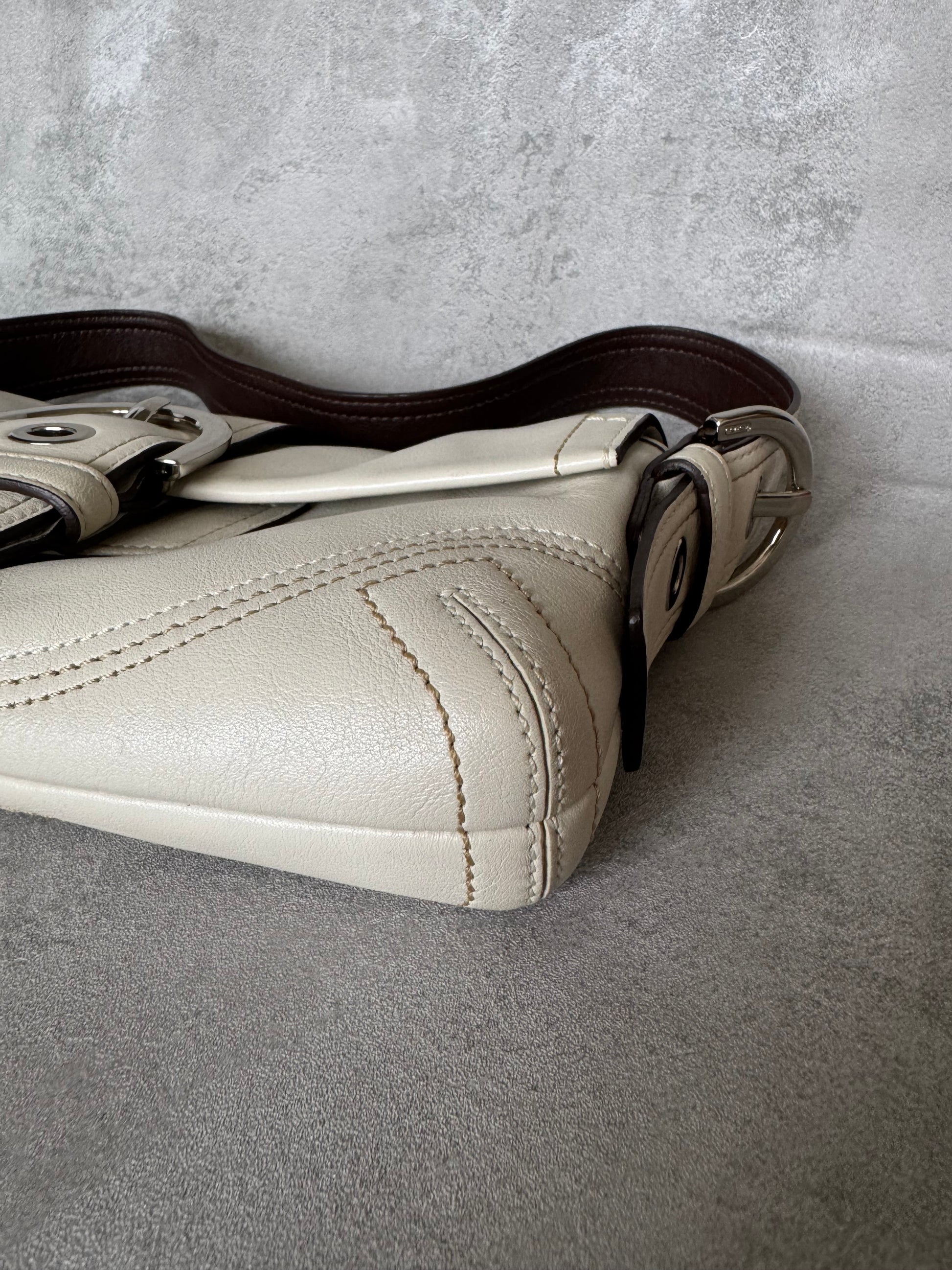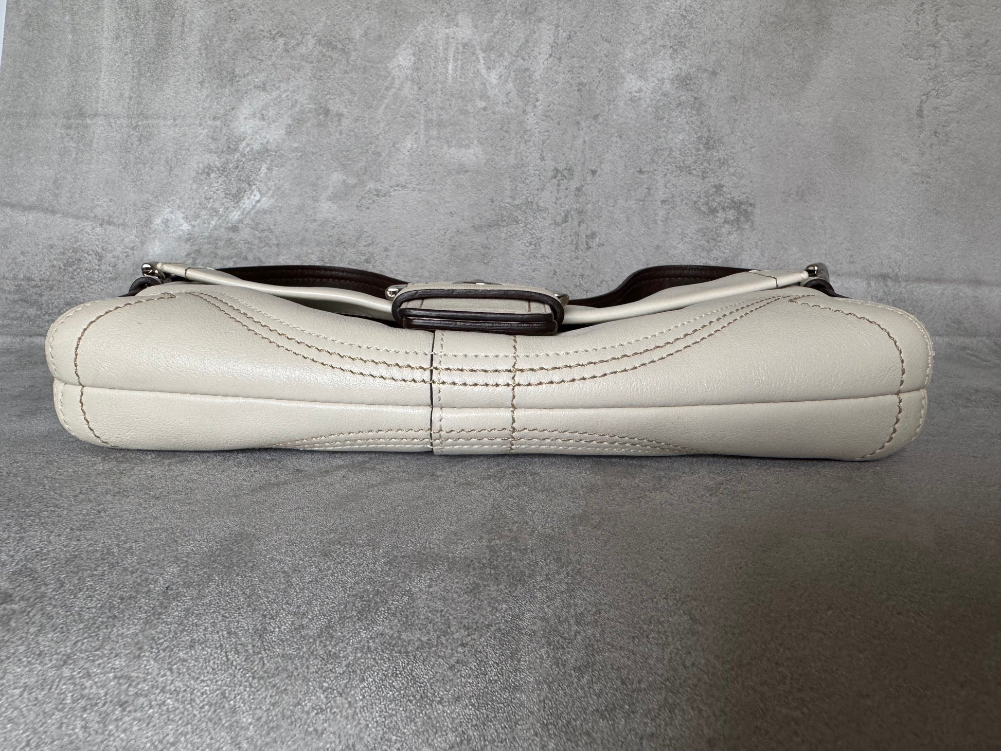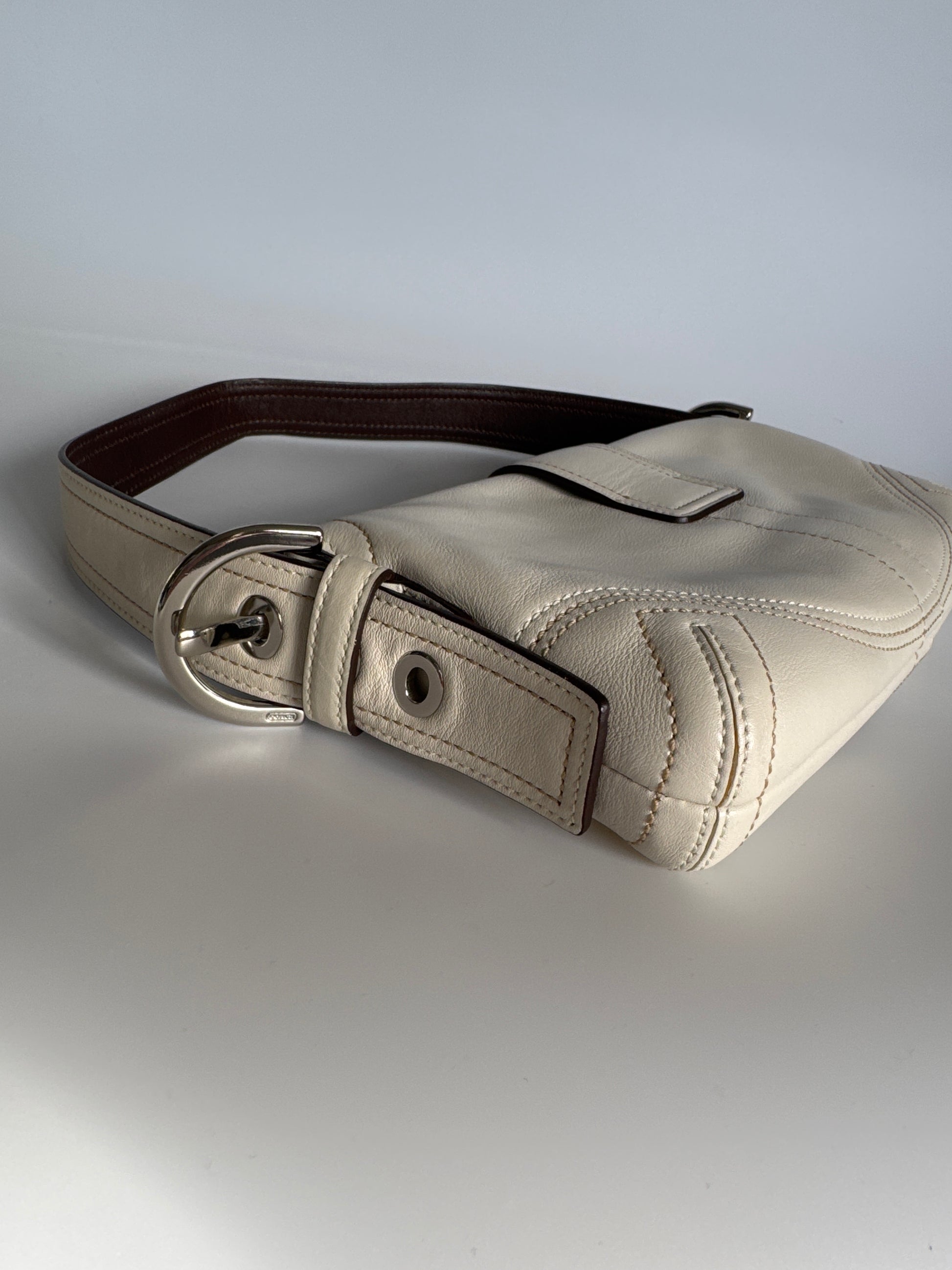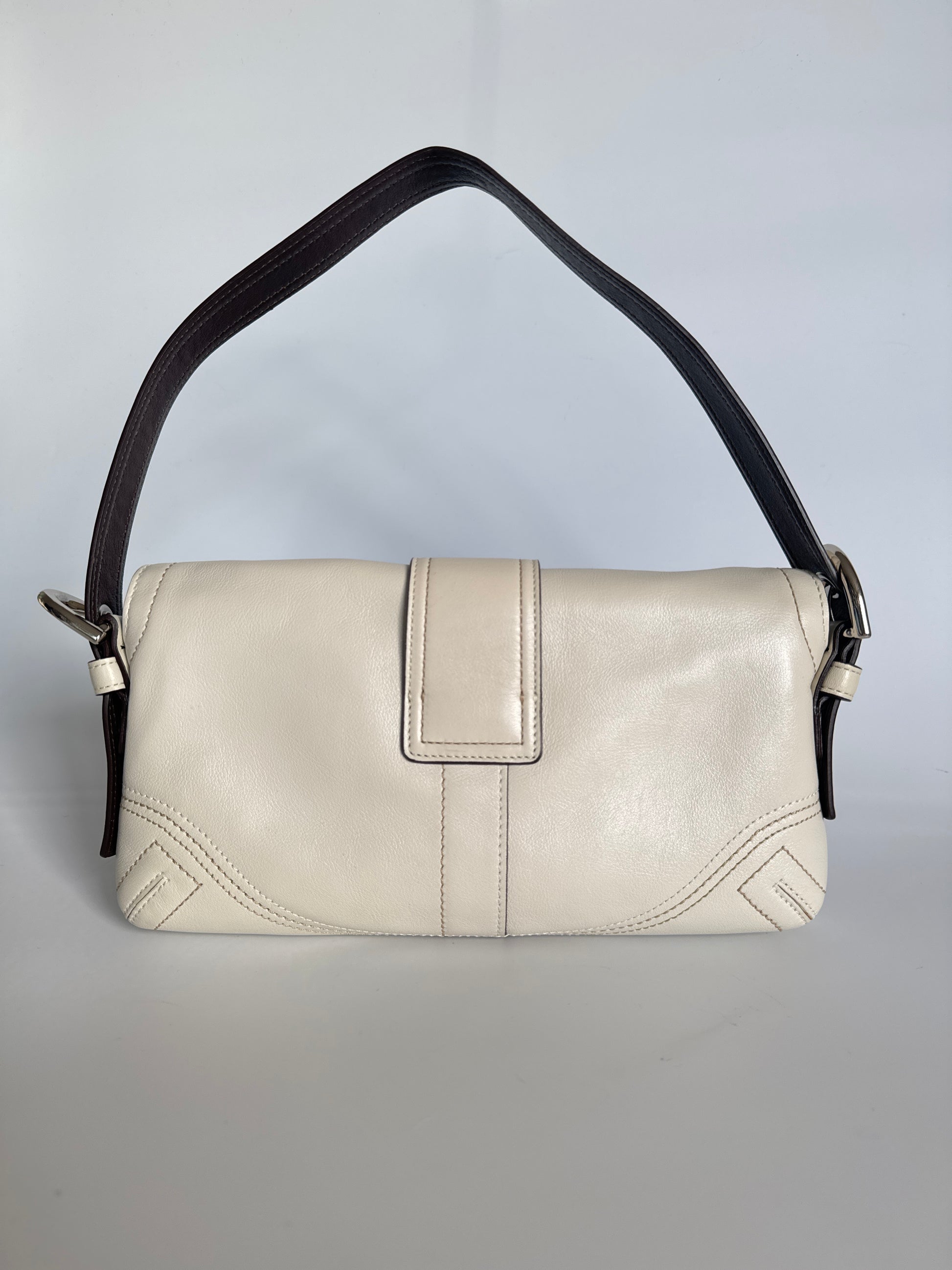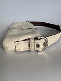 Supple white leather with bold contrast stitching and polished silver-tone hardware. Compact flap front with signature oversized buckle — minimalist, wearable, and timeless.