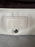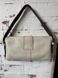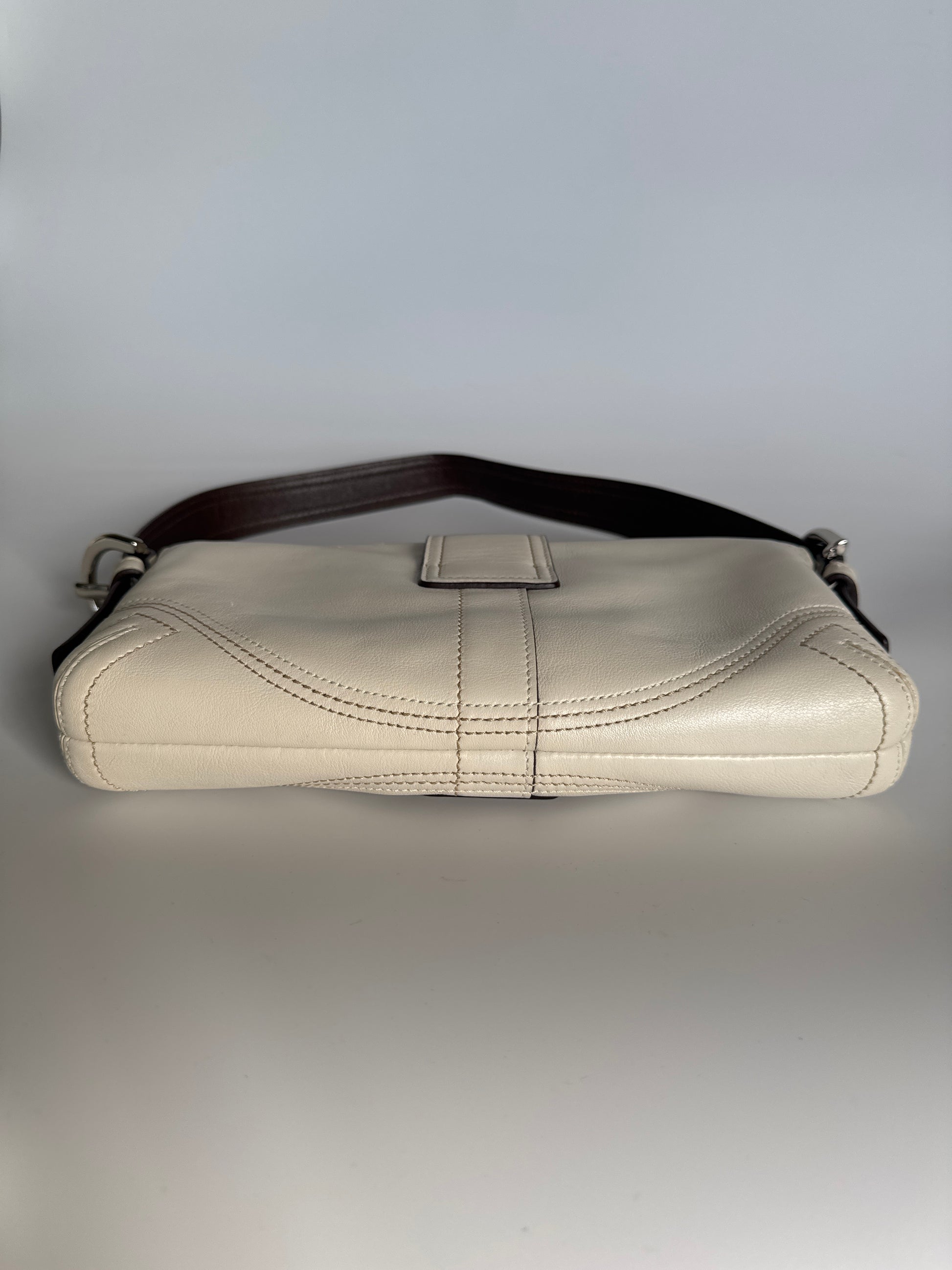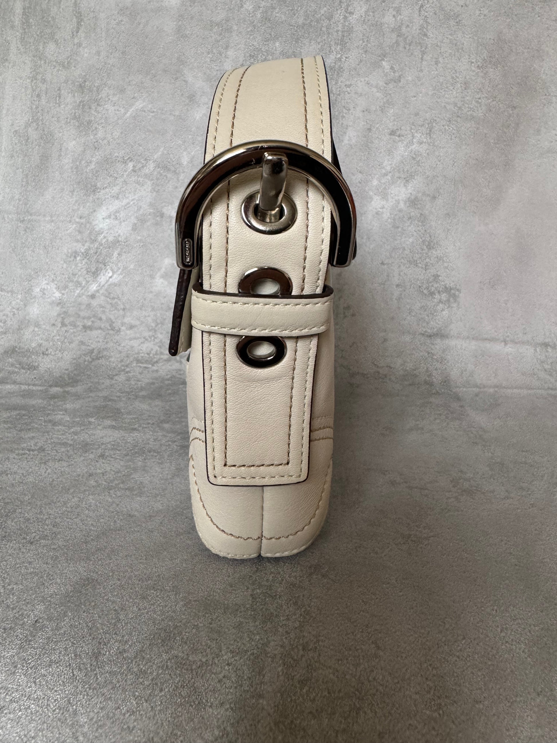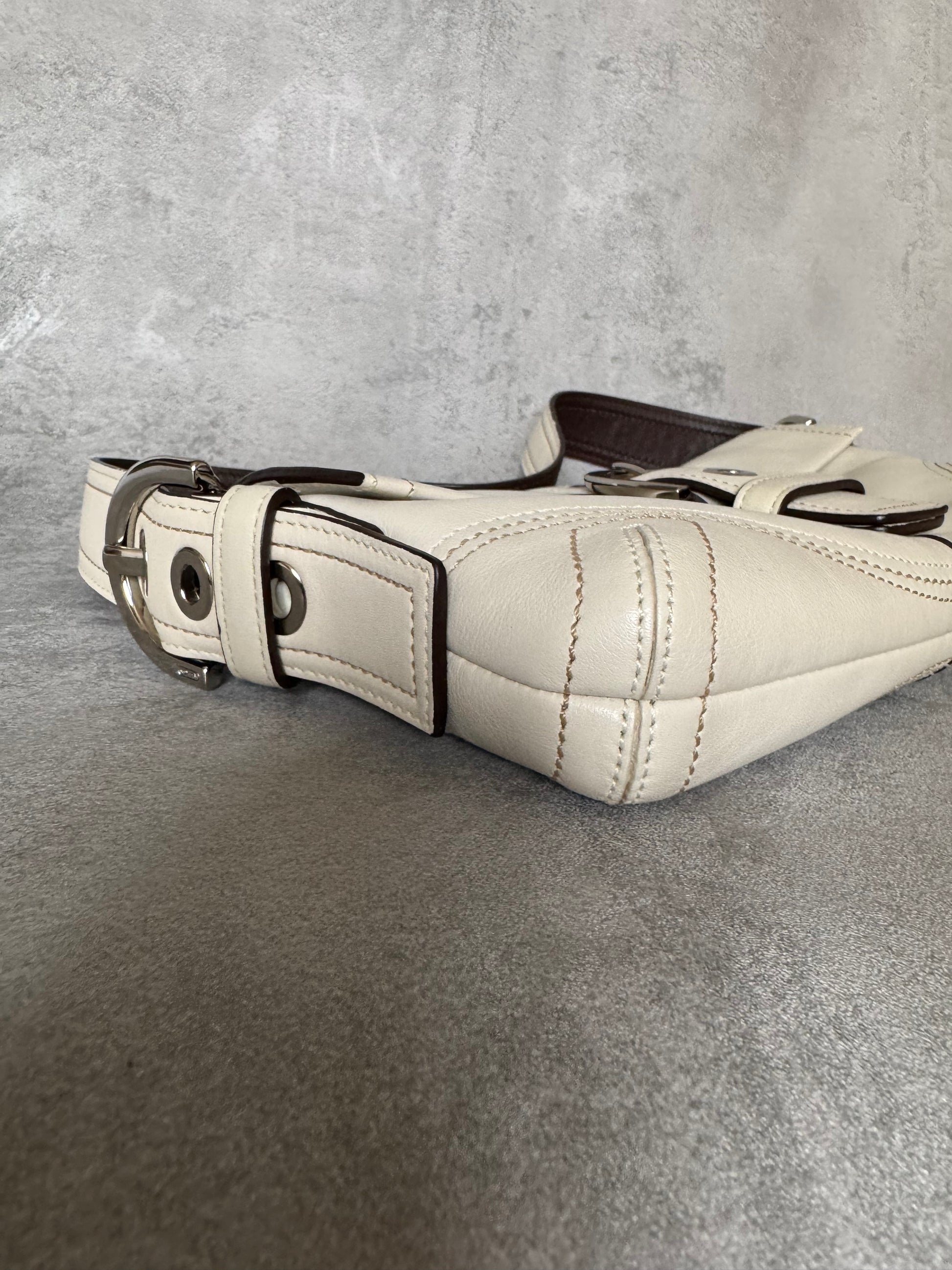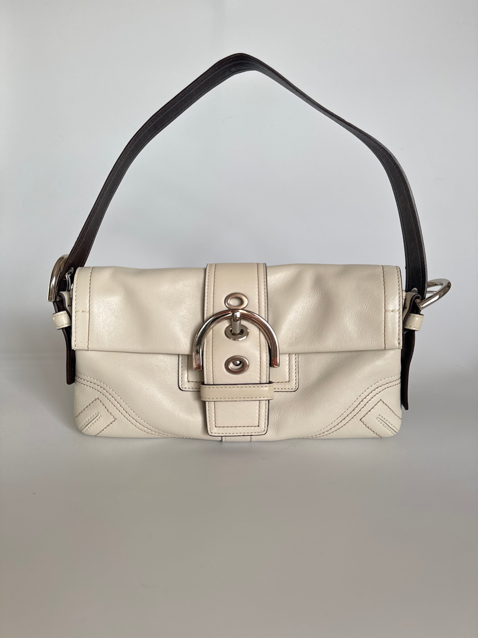 Supple white leather with bold contrast stitching and polished silver-tone hardware. Compact flap front with signature oversized buckle — minimalist, wearable, and timeless.