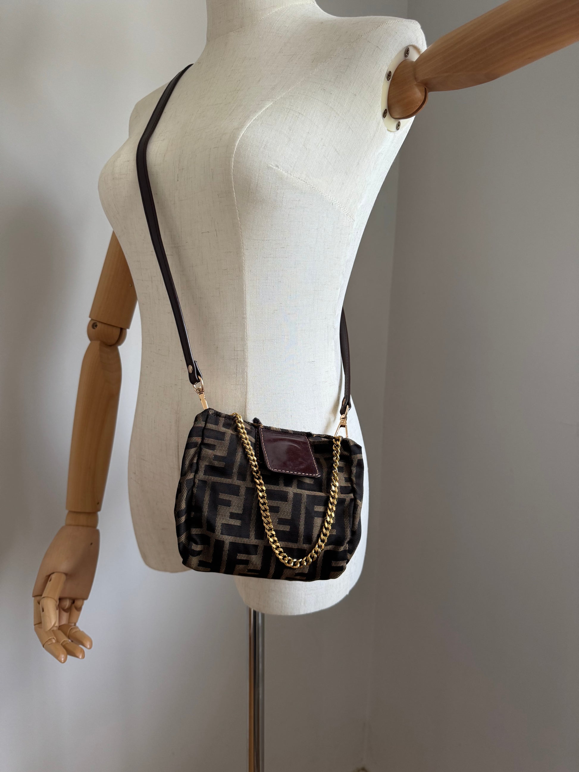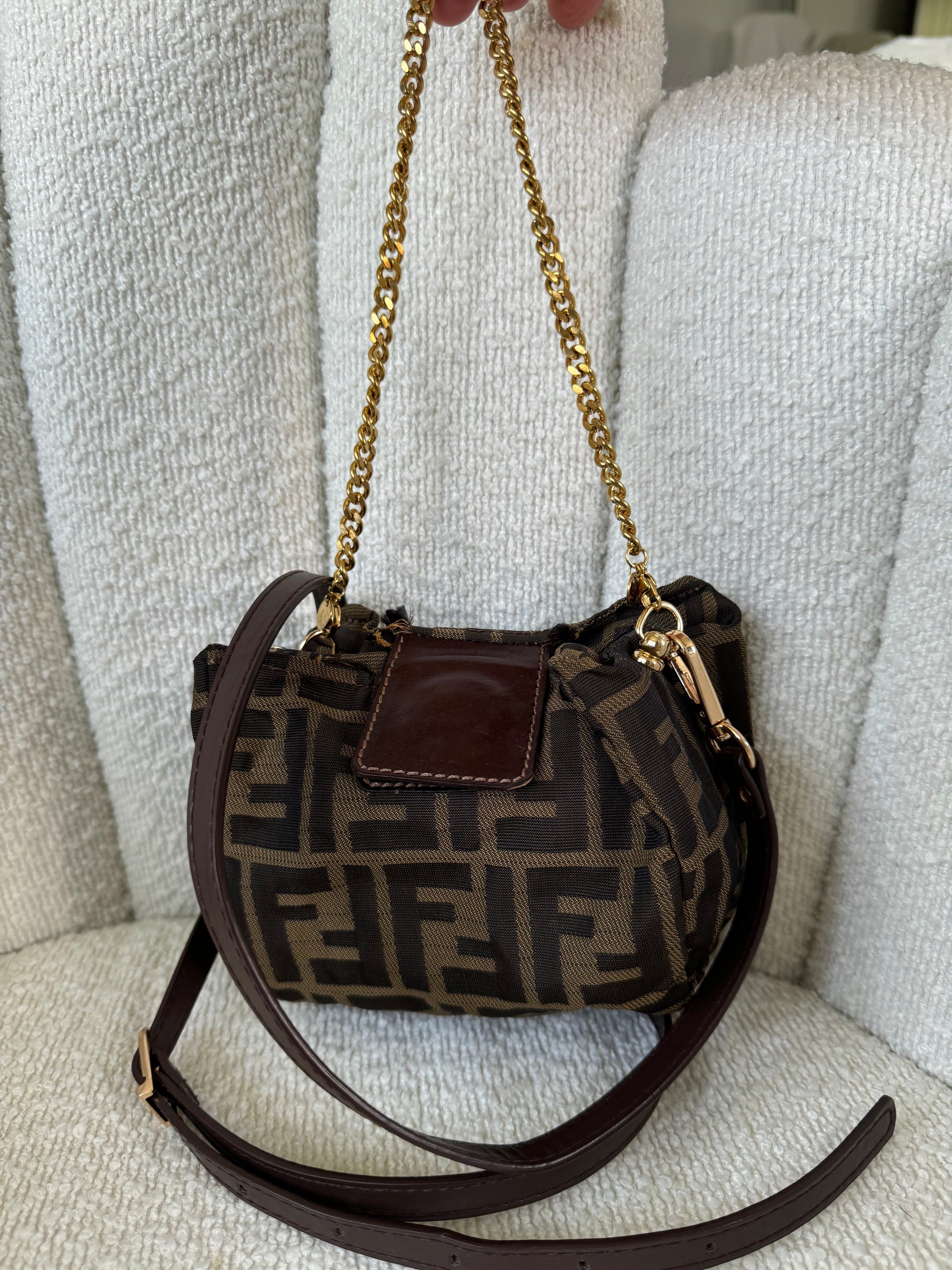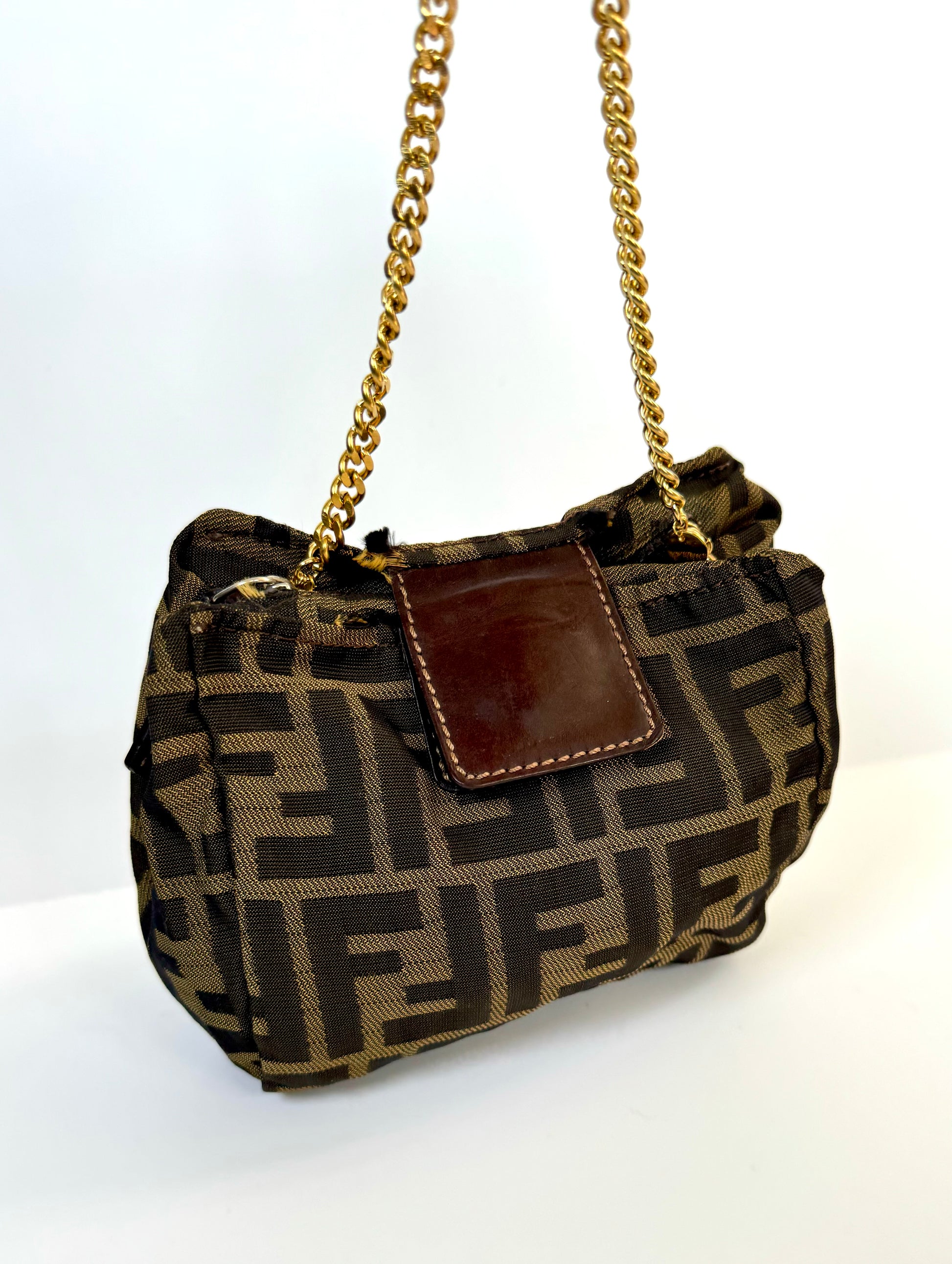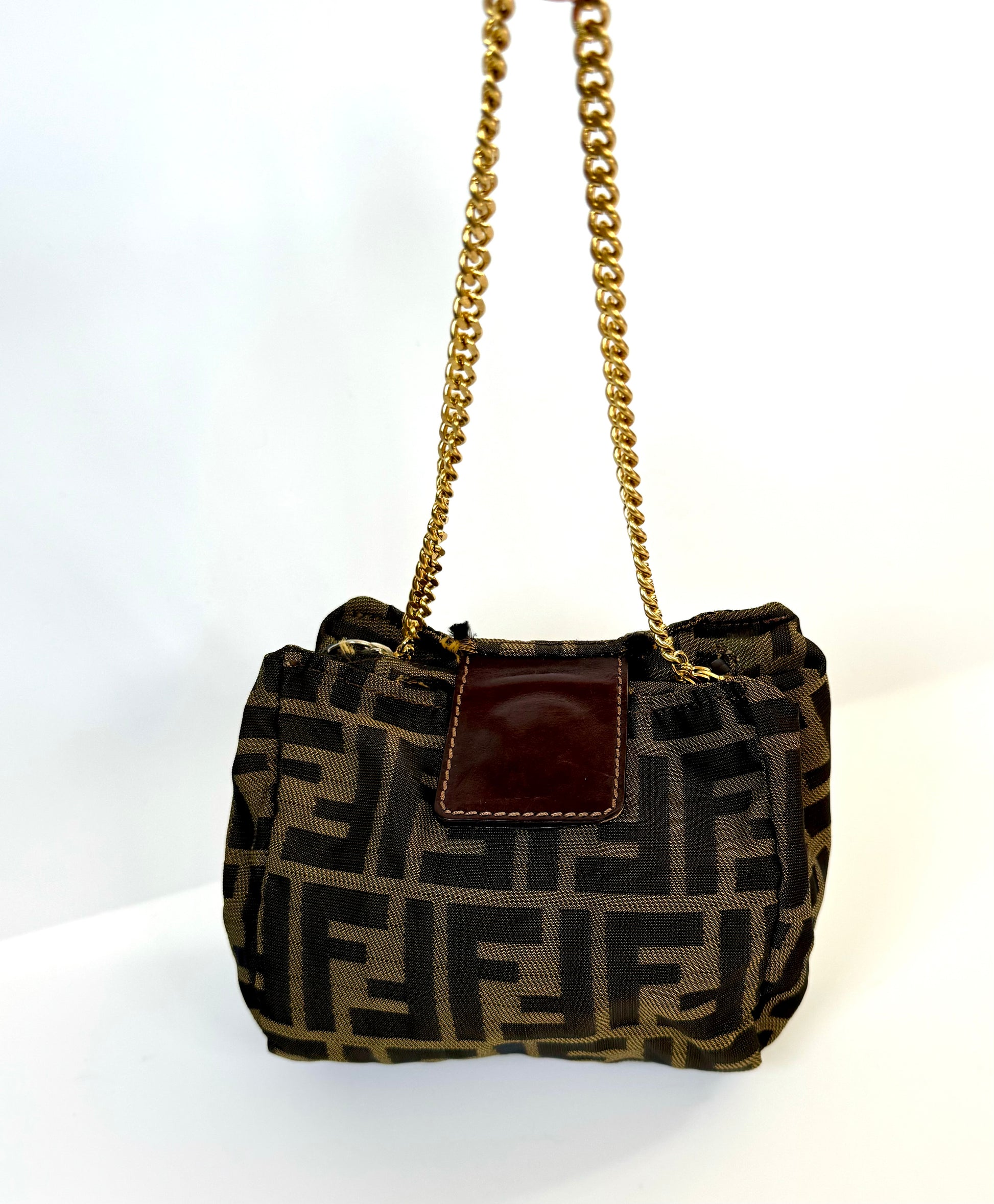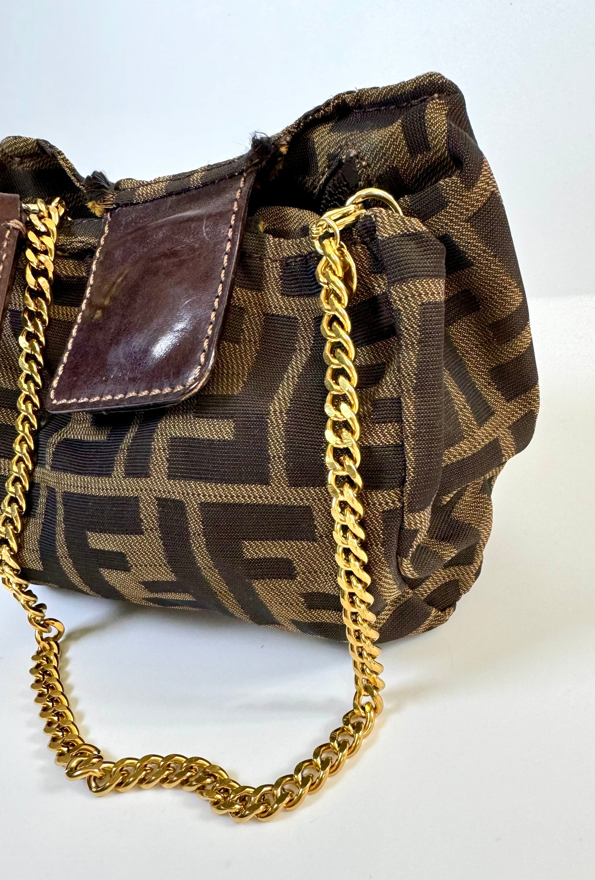 Brown FF Zucca canvas with soft pleating, leather detailing, and a gold-tone chain strap — compact, versatile, and perfect as a mini shoulder bag or statement clutch.