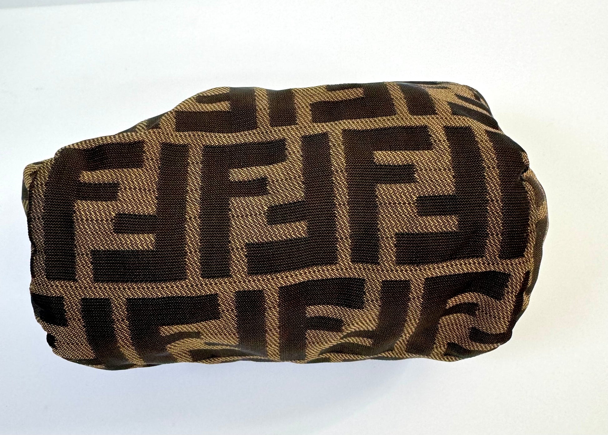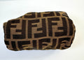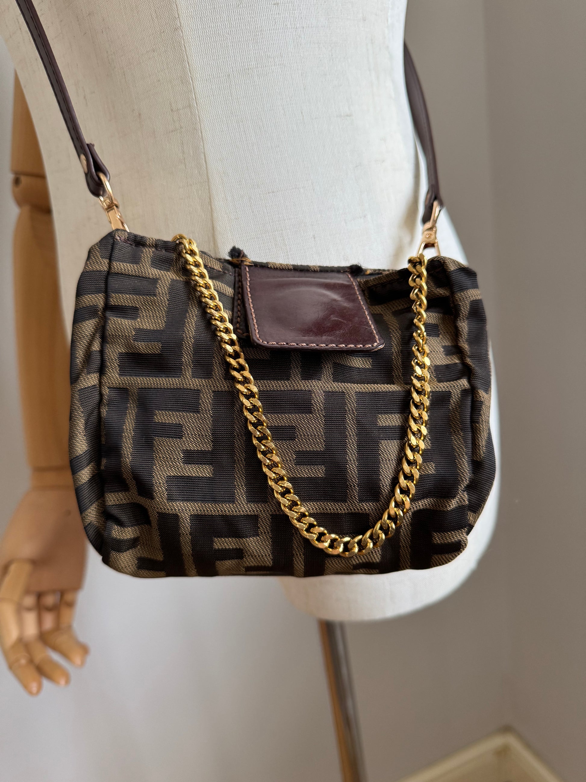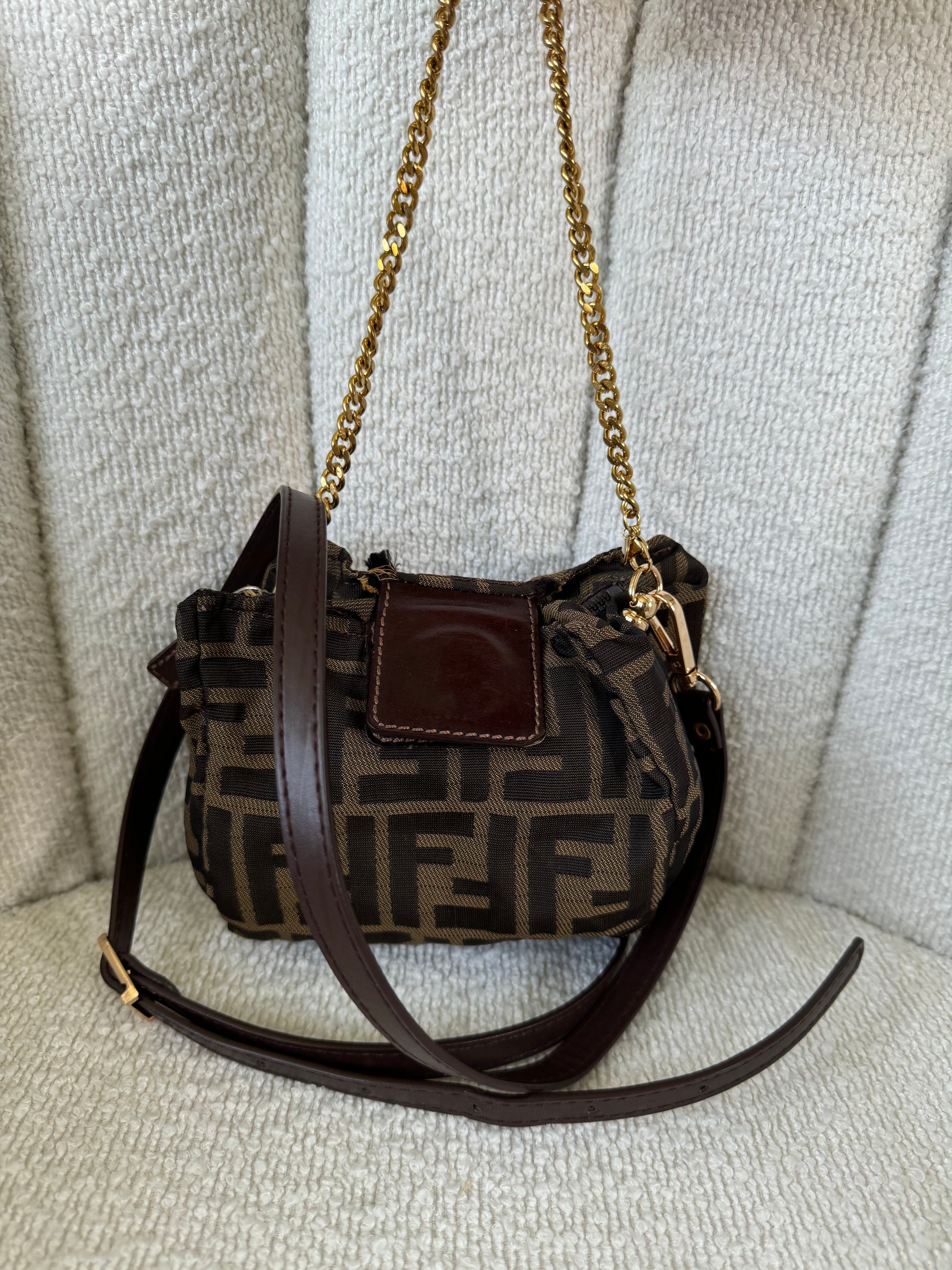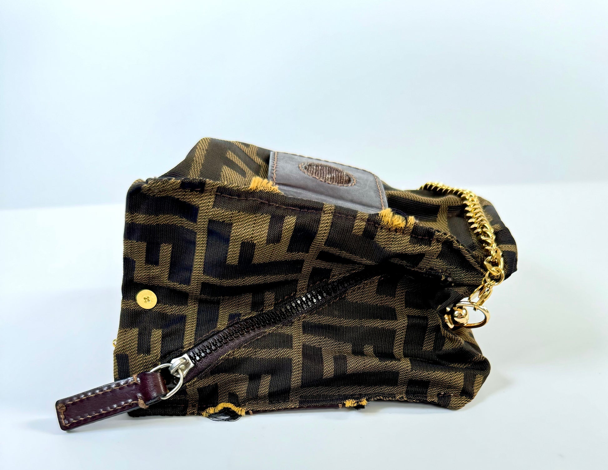 Brown FF Zucca canvas with soft pleating, leather detailing, and a gold-tone chain strap — compact, versatile, and perfect as a mini shoulder bag or statement clutch.