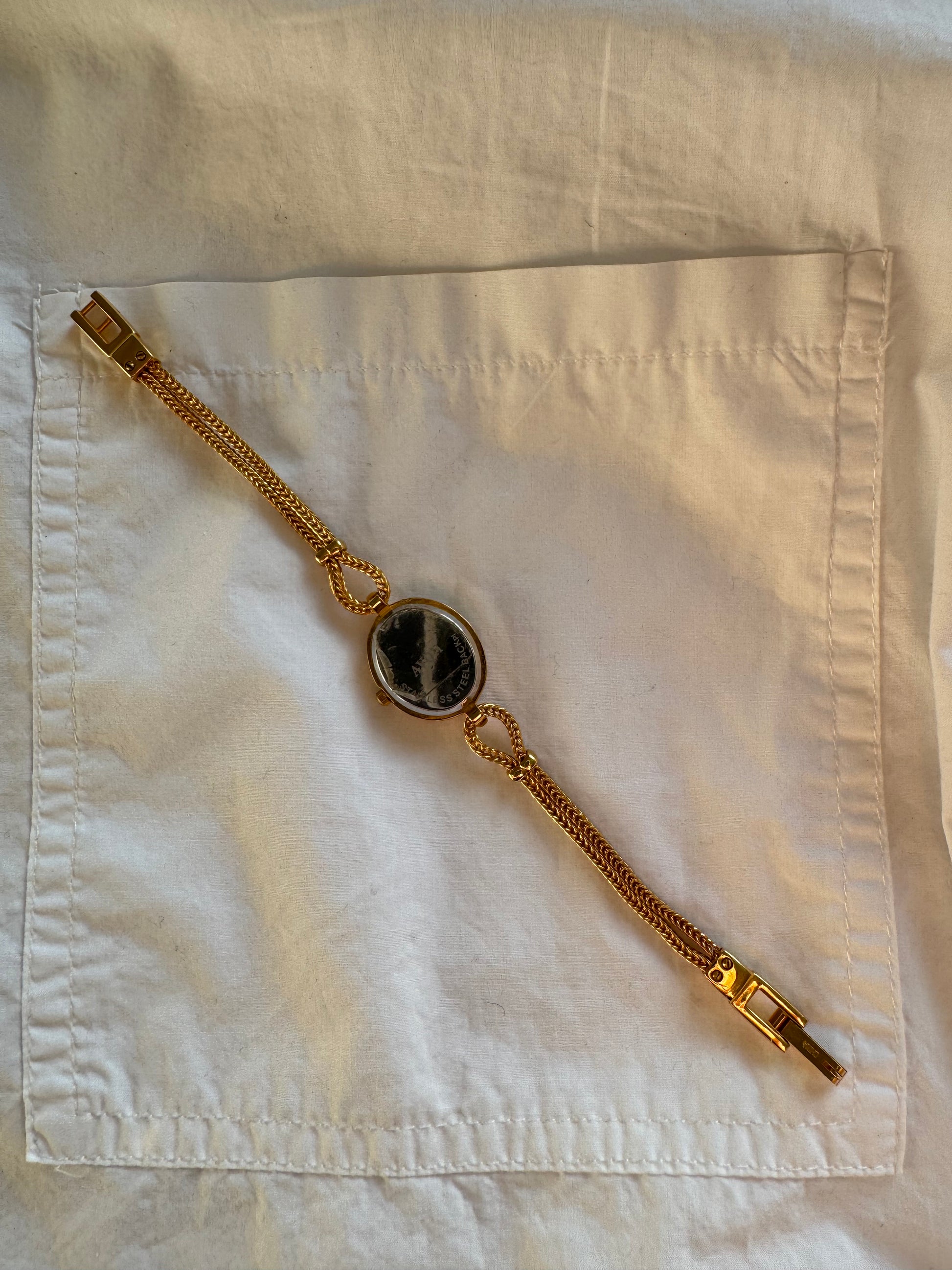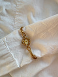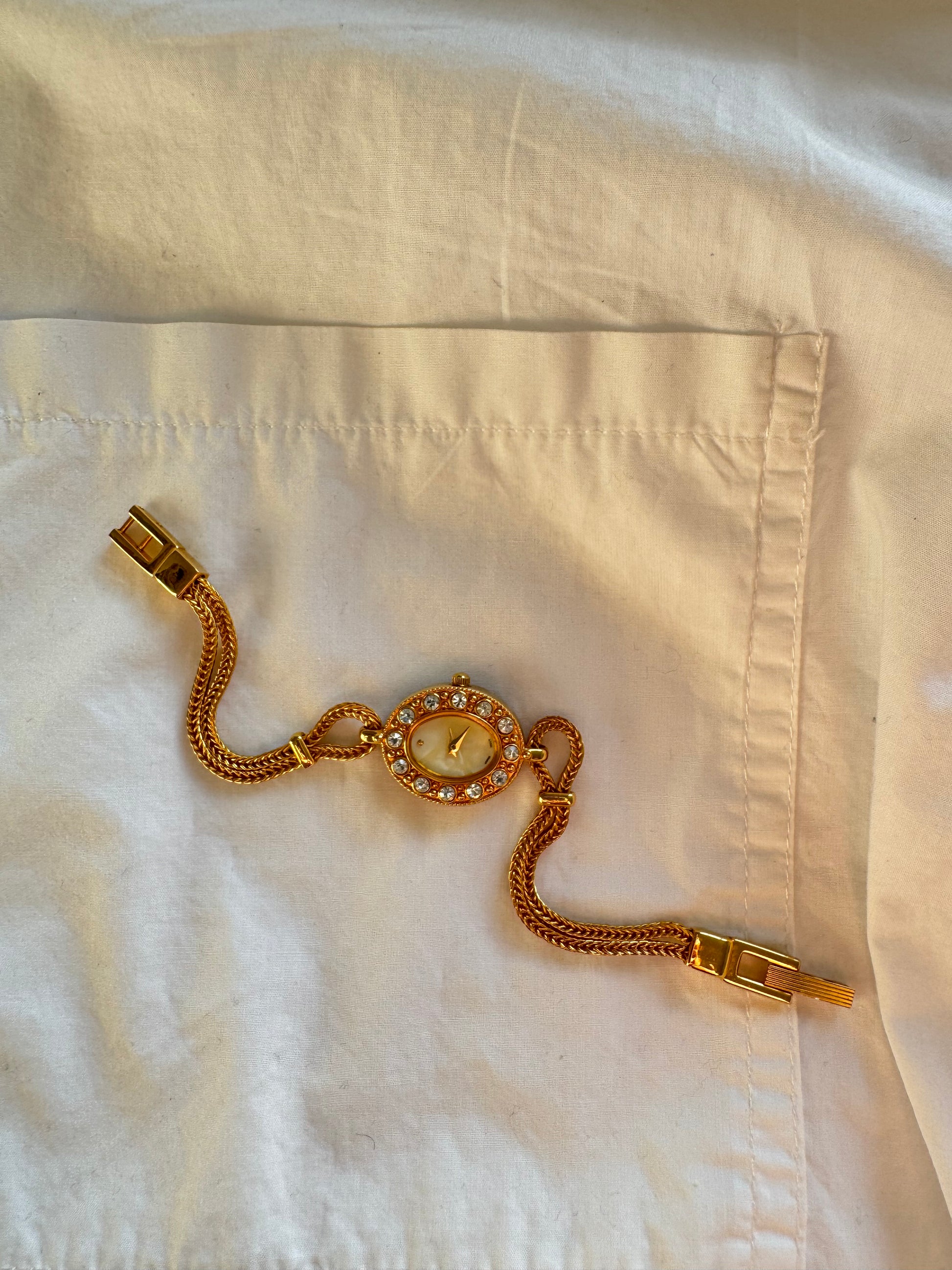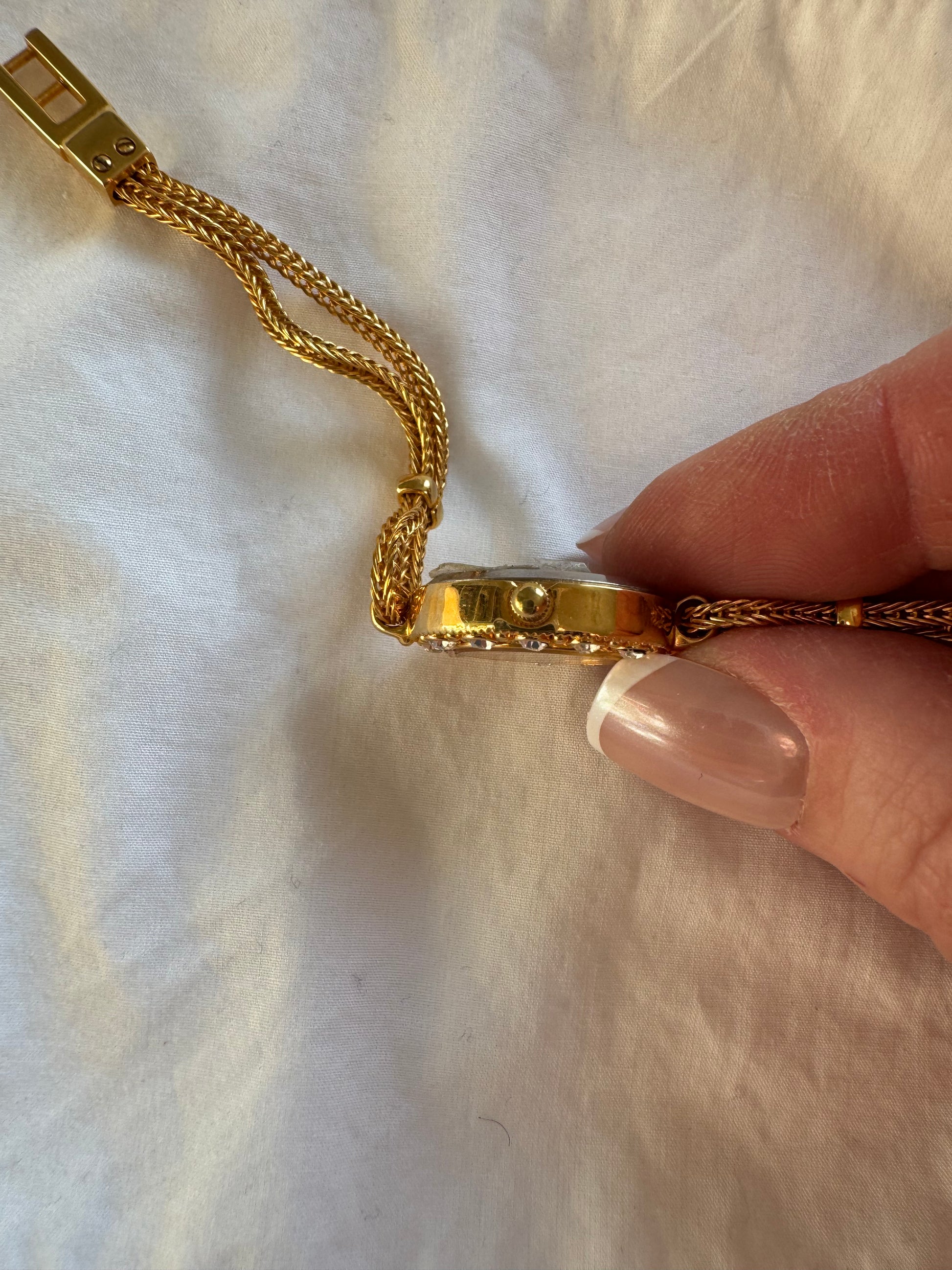 A delicate gold-tone Avon bracelet watch with an oval crystal-set bezel and slim braided links — feminine, sparkling and beautifully vintage-inspired. A charming piece that adds a soft touch of evening elegance to any look.