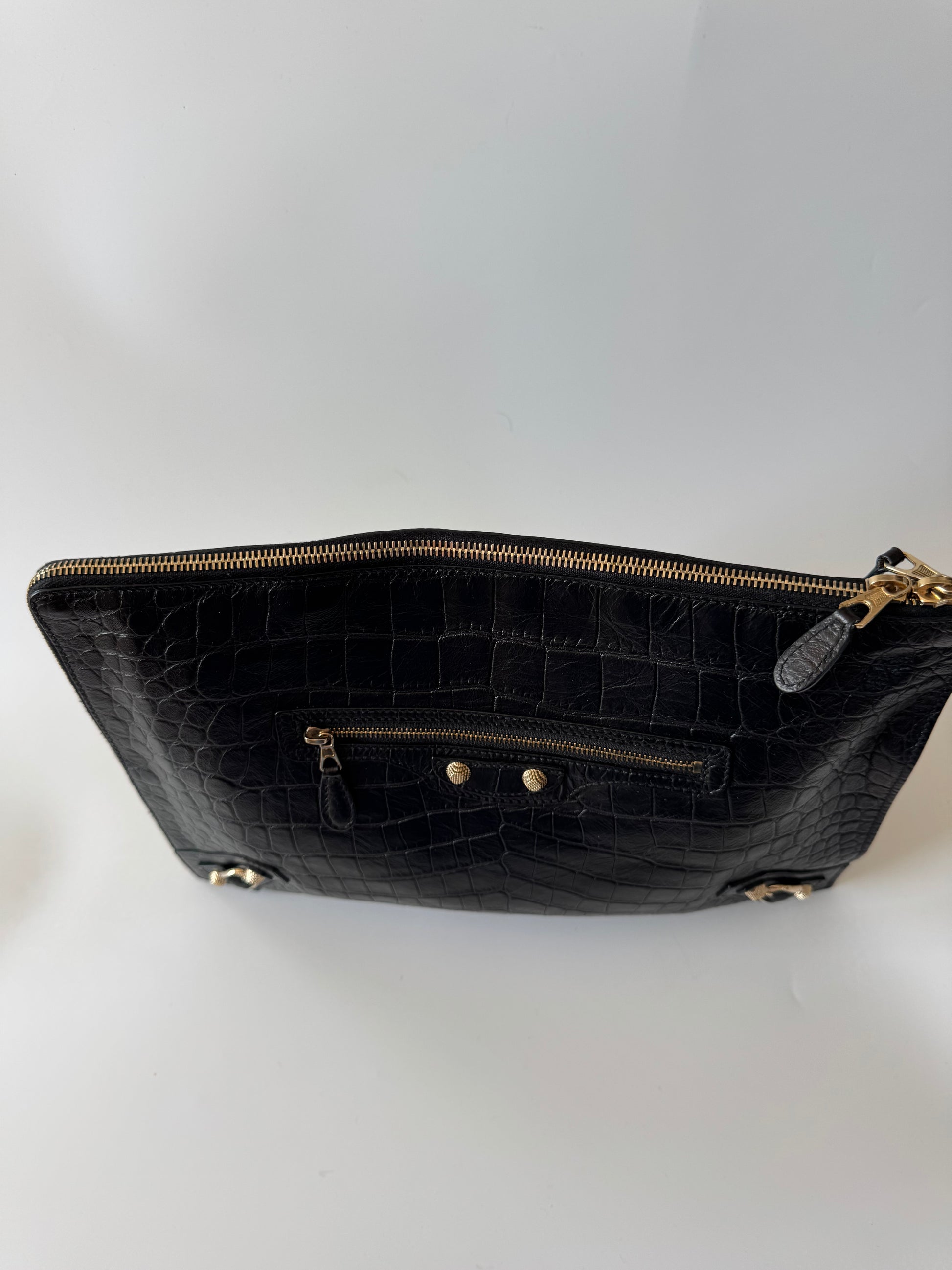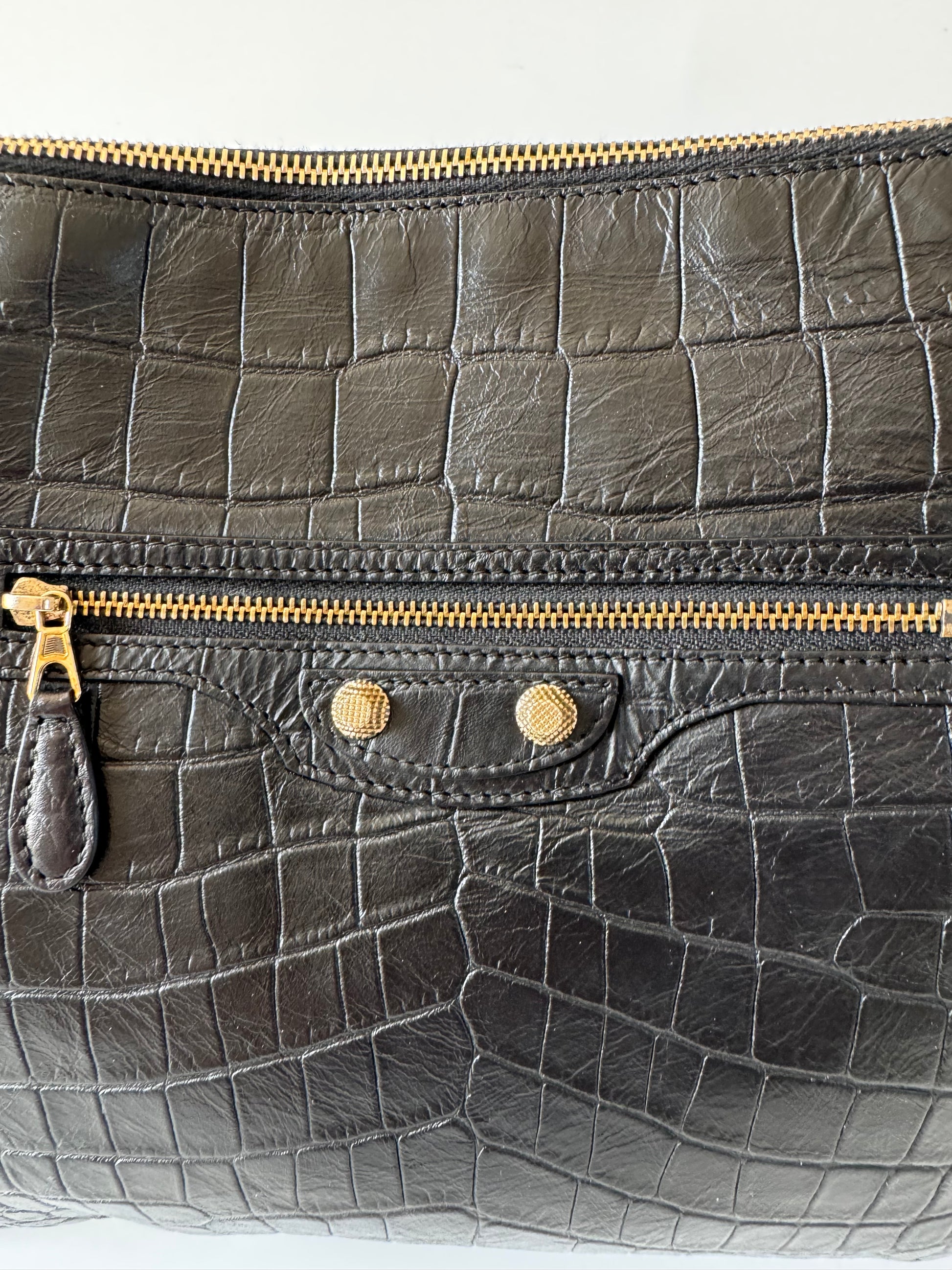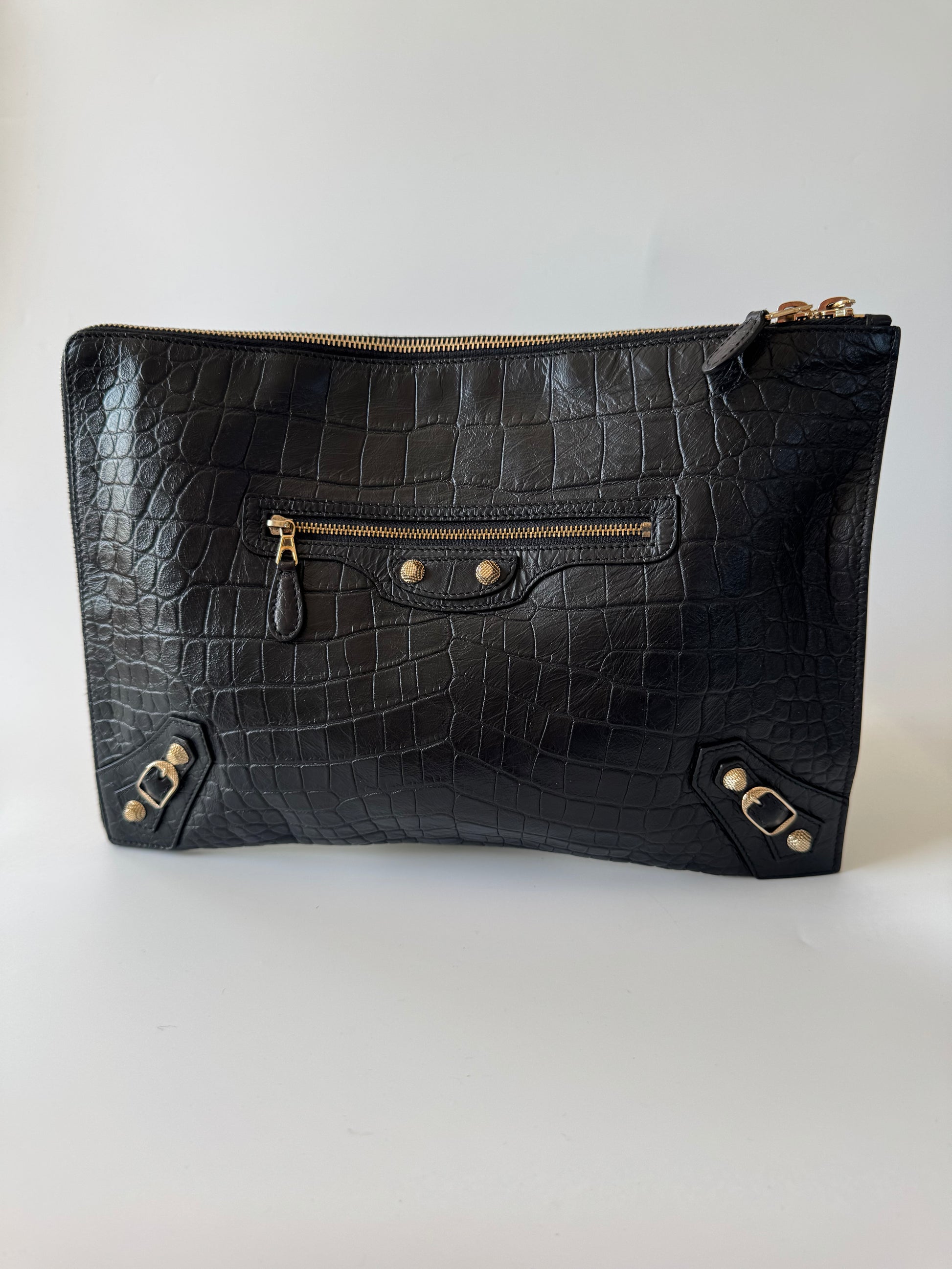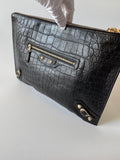 Details: Sleek clutch design in croc-embossed leather with signature Balenciaga front zip pocket and stud detailing. Zip closure.