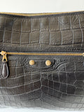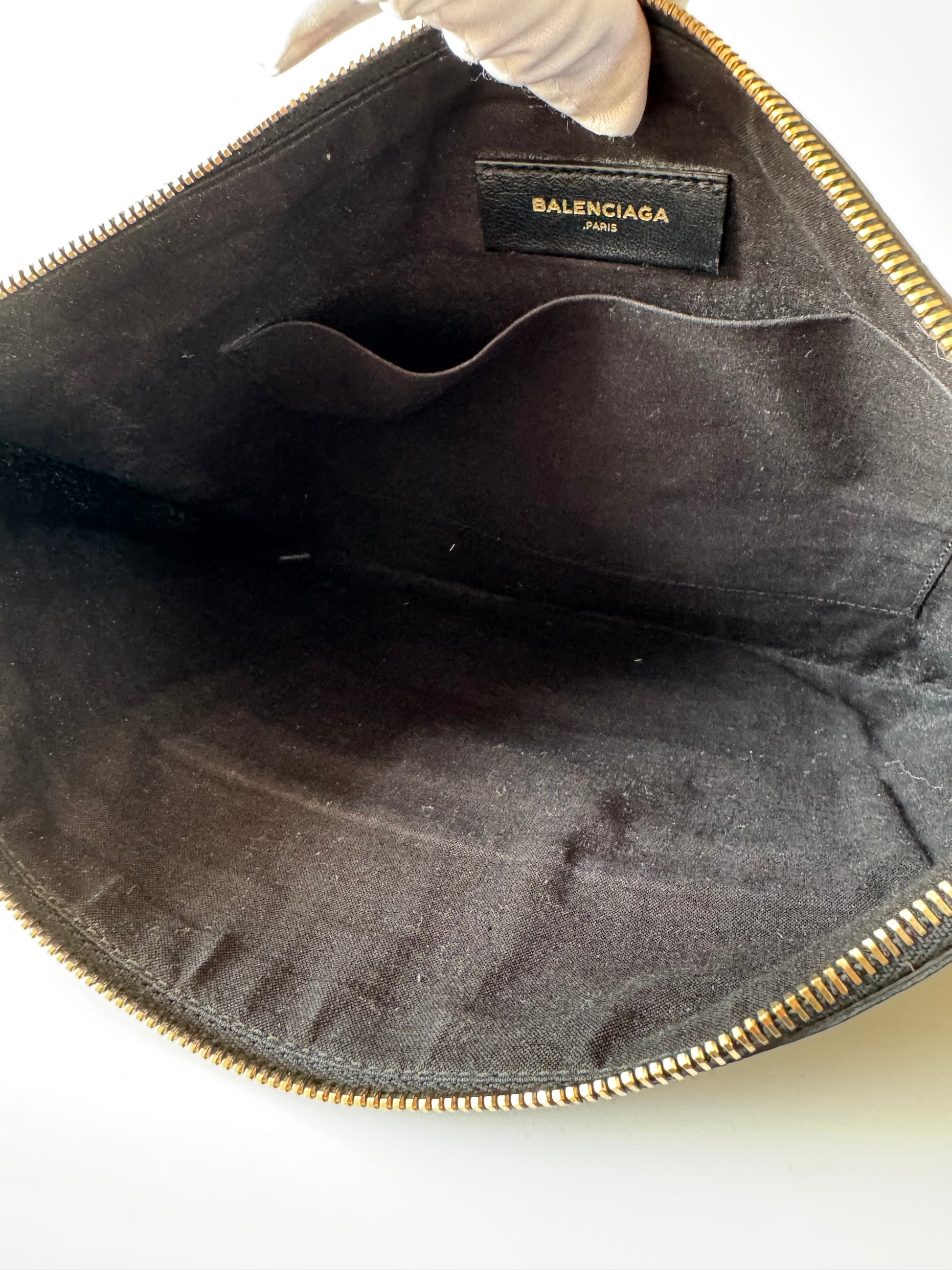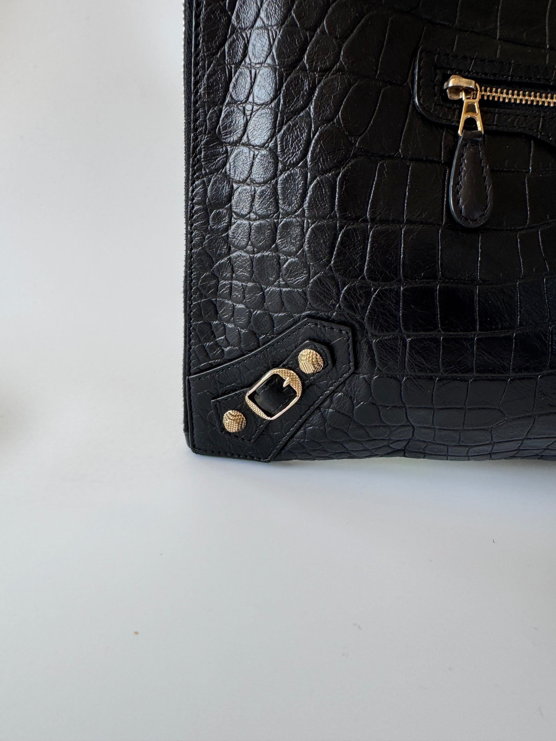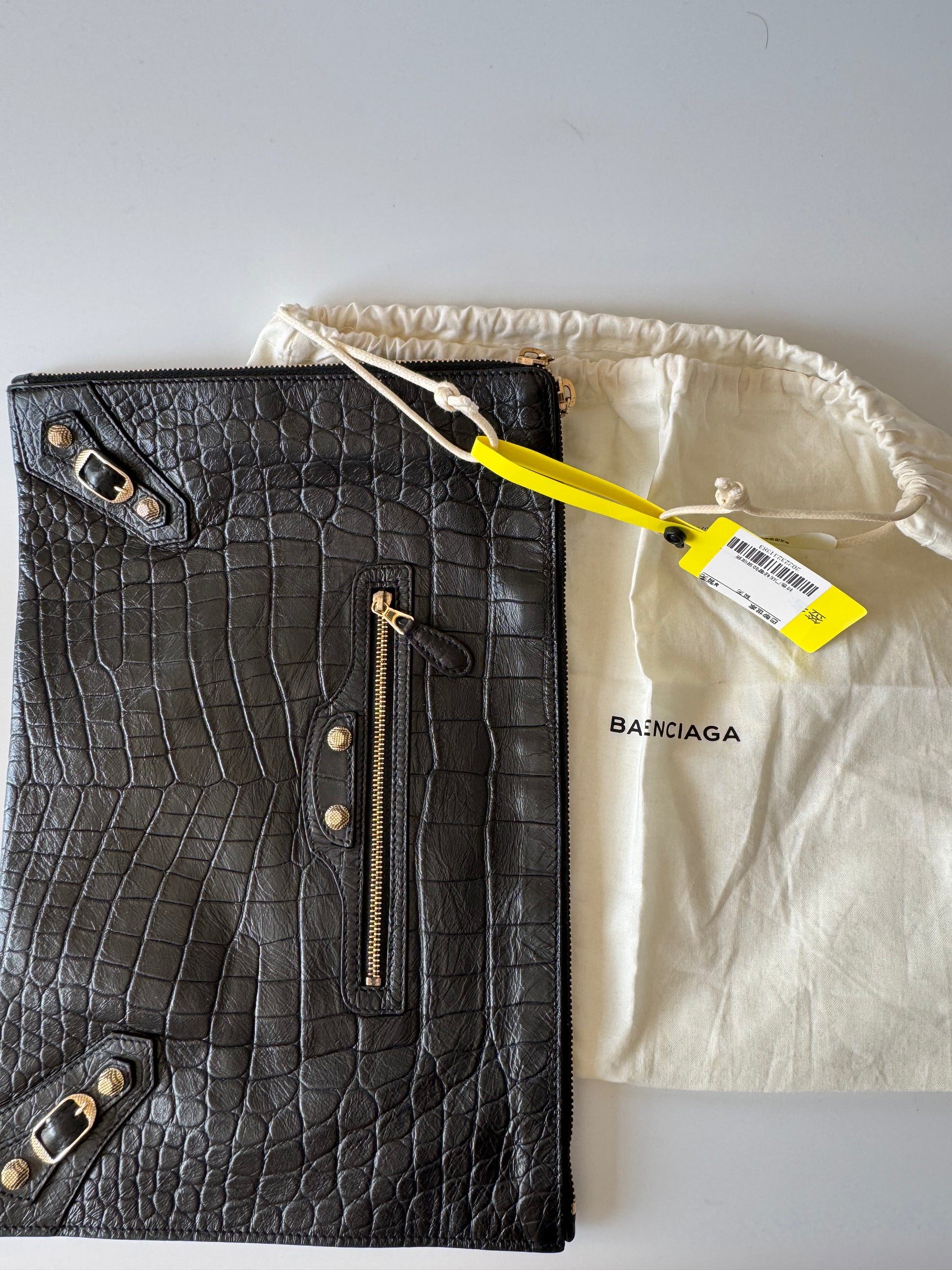 Details: Sleek clutch design in croc-embossed leather with signature Balenciaga front zip pocket and stud detailing. Zip closure.