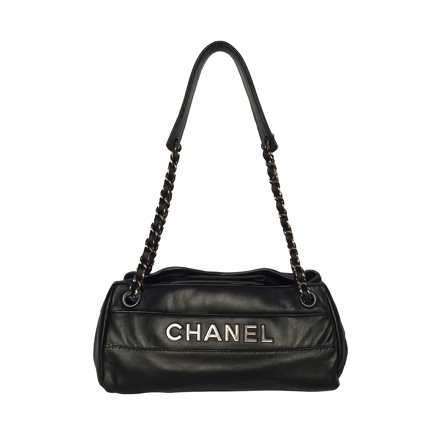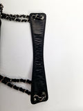 Smooth black lambskin with an oversized CHANEL logo and leather-woven chain straps — structured yet soft, delivering bold Parisian flair with modern edge.