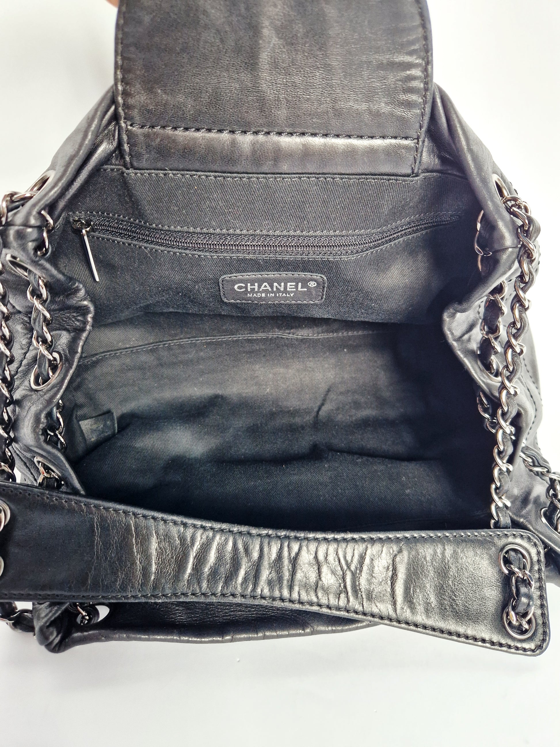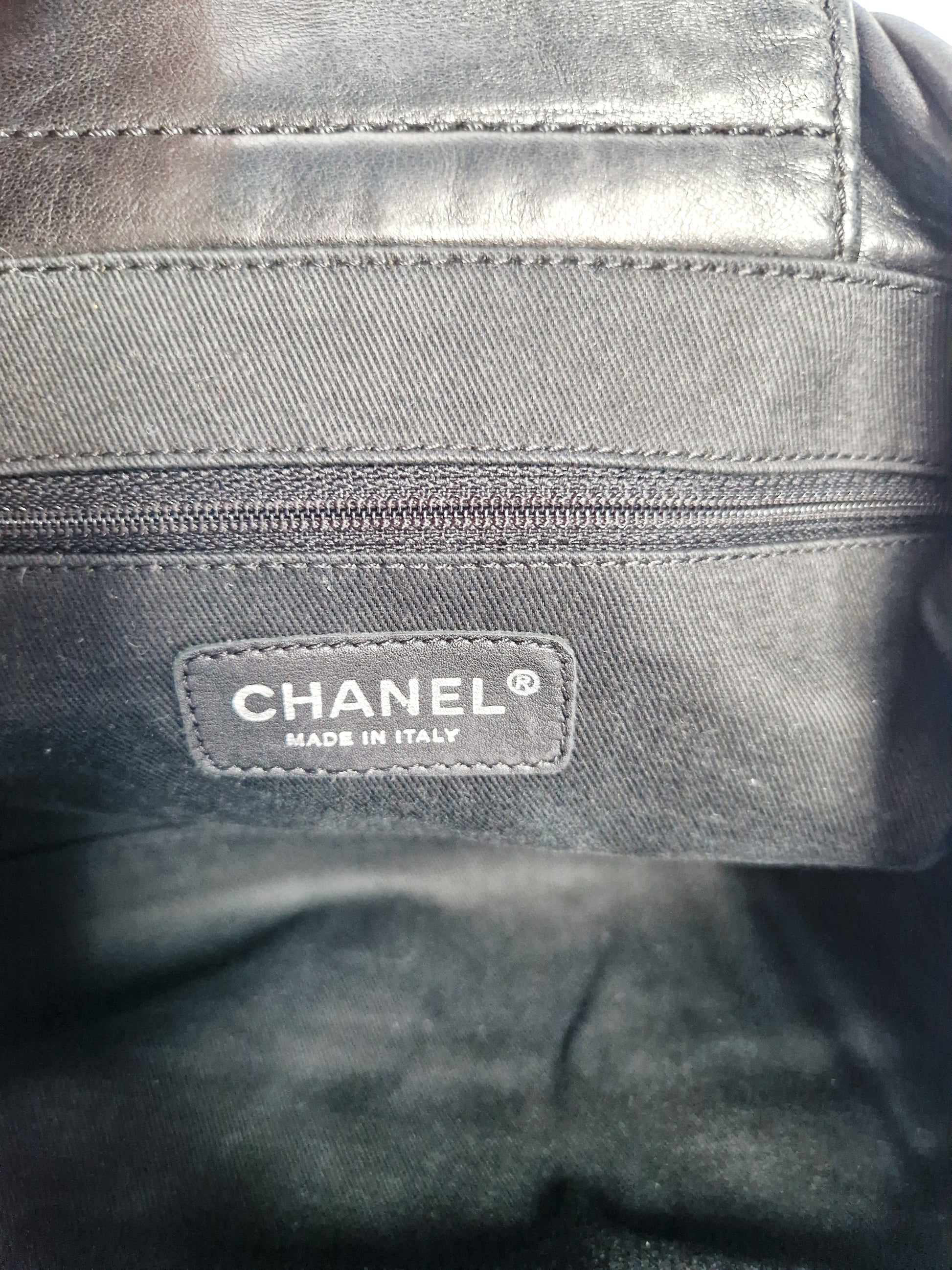 Lambskin leather; oversized silver-tone CHANEL logo
