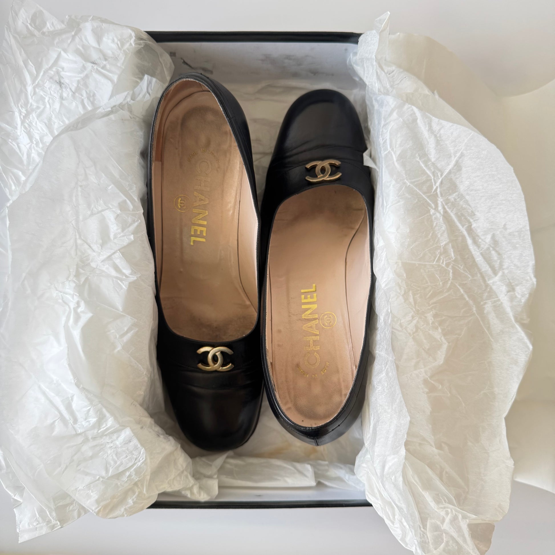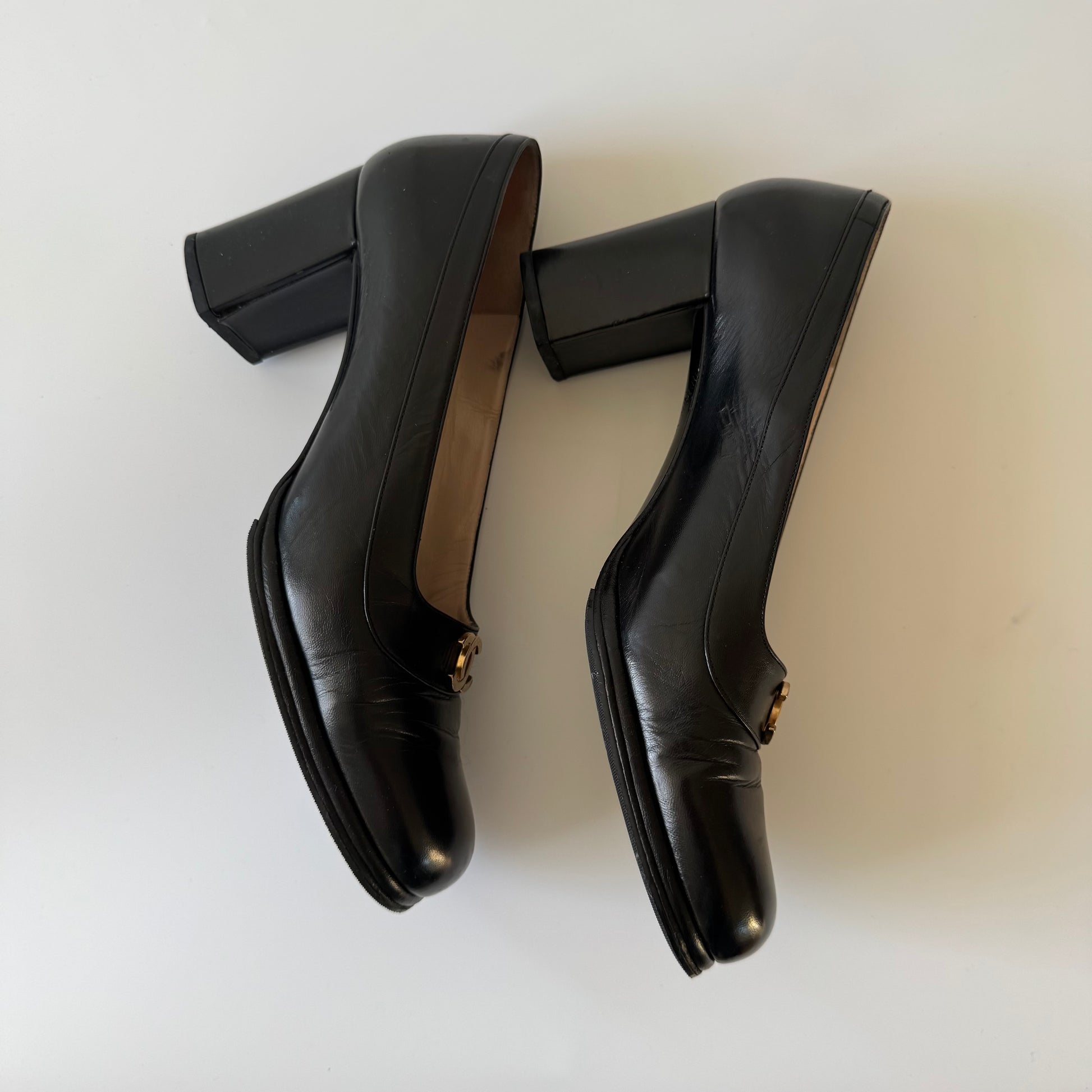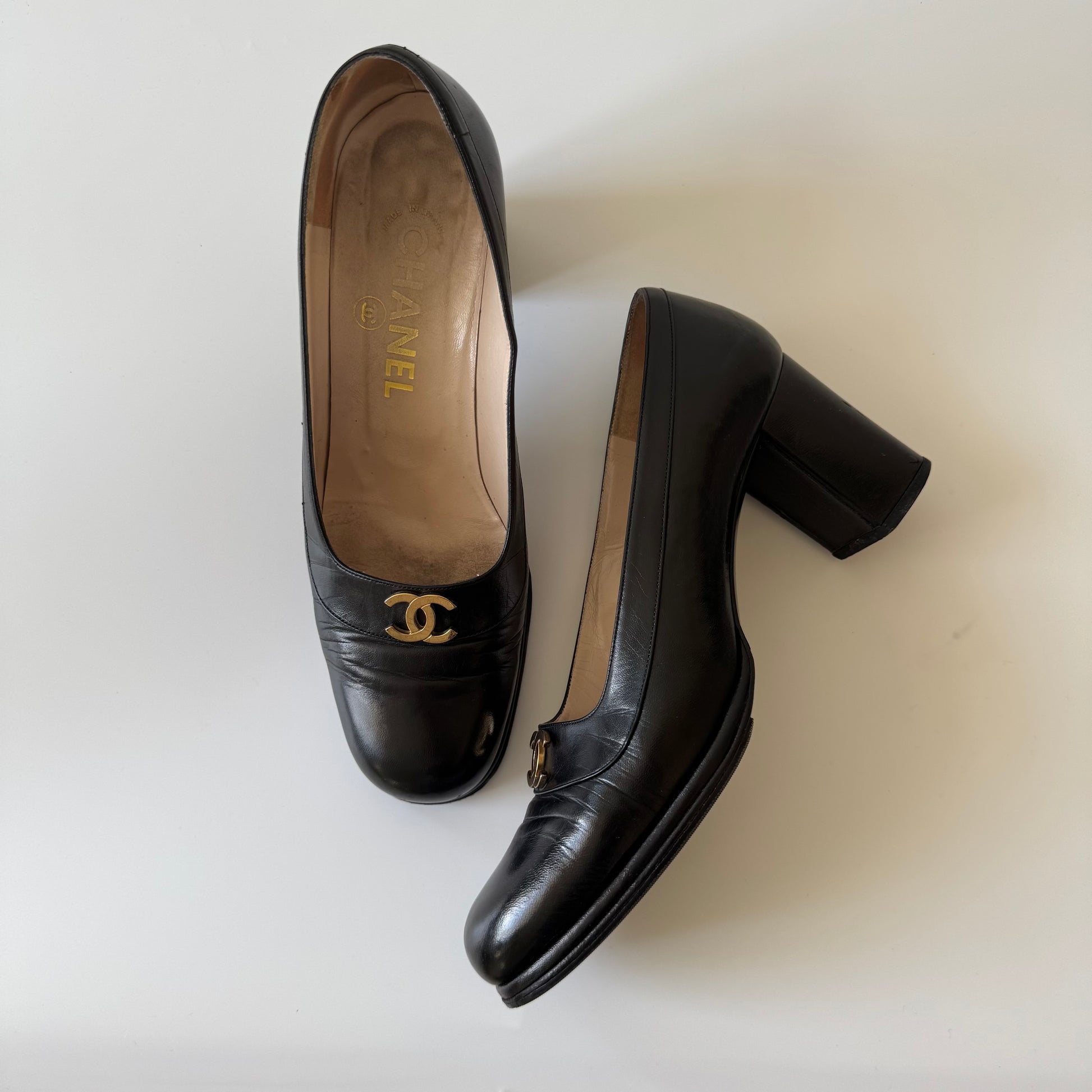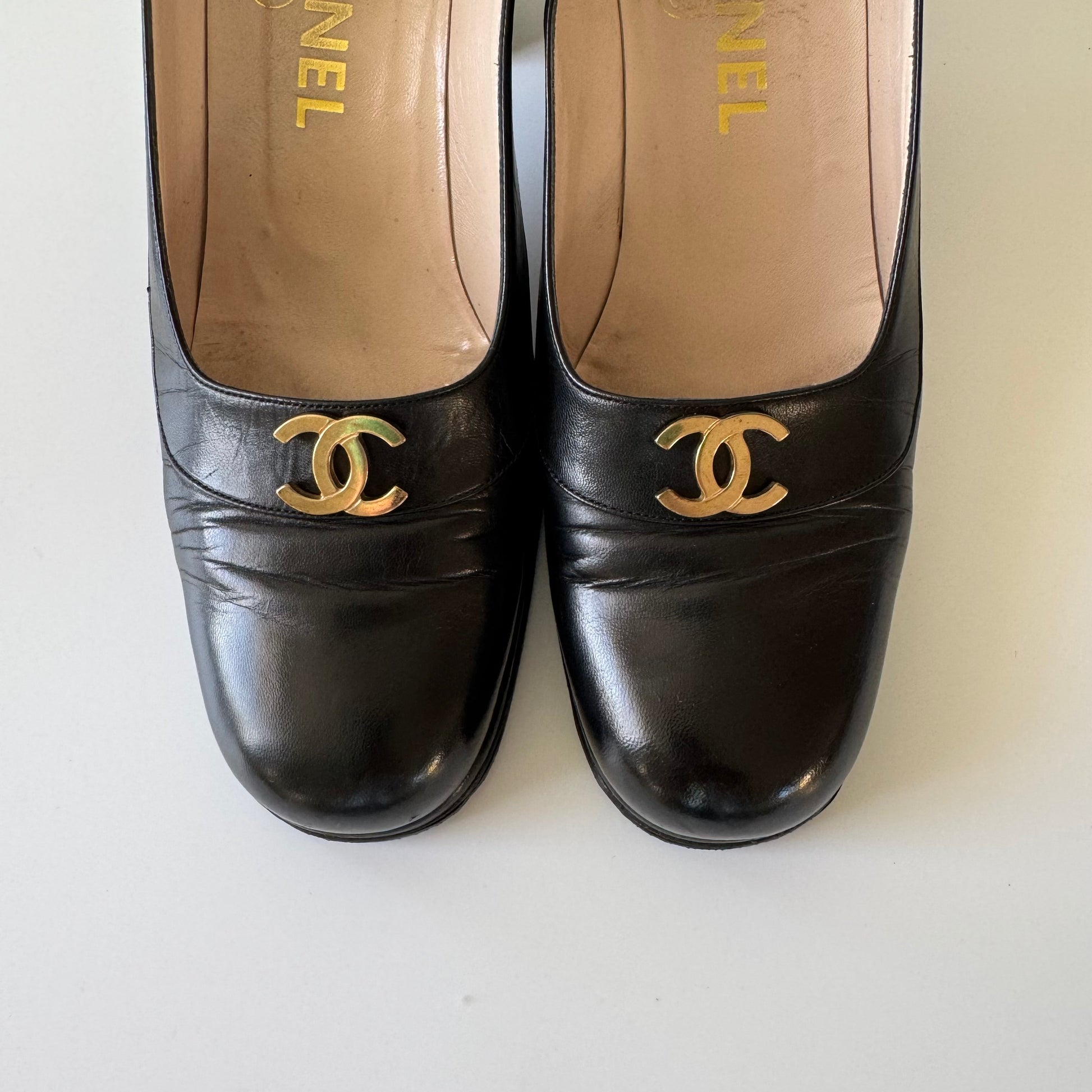Elegant and timeless Chanel pumps in classic black with signature gold CC logo detailing. A beautifully structured silhouette with that unmistakable Parisian sophistication — perfect for both day and evening wear. A true wardrobe staple with iconic appeal.