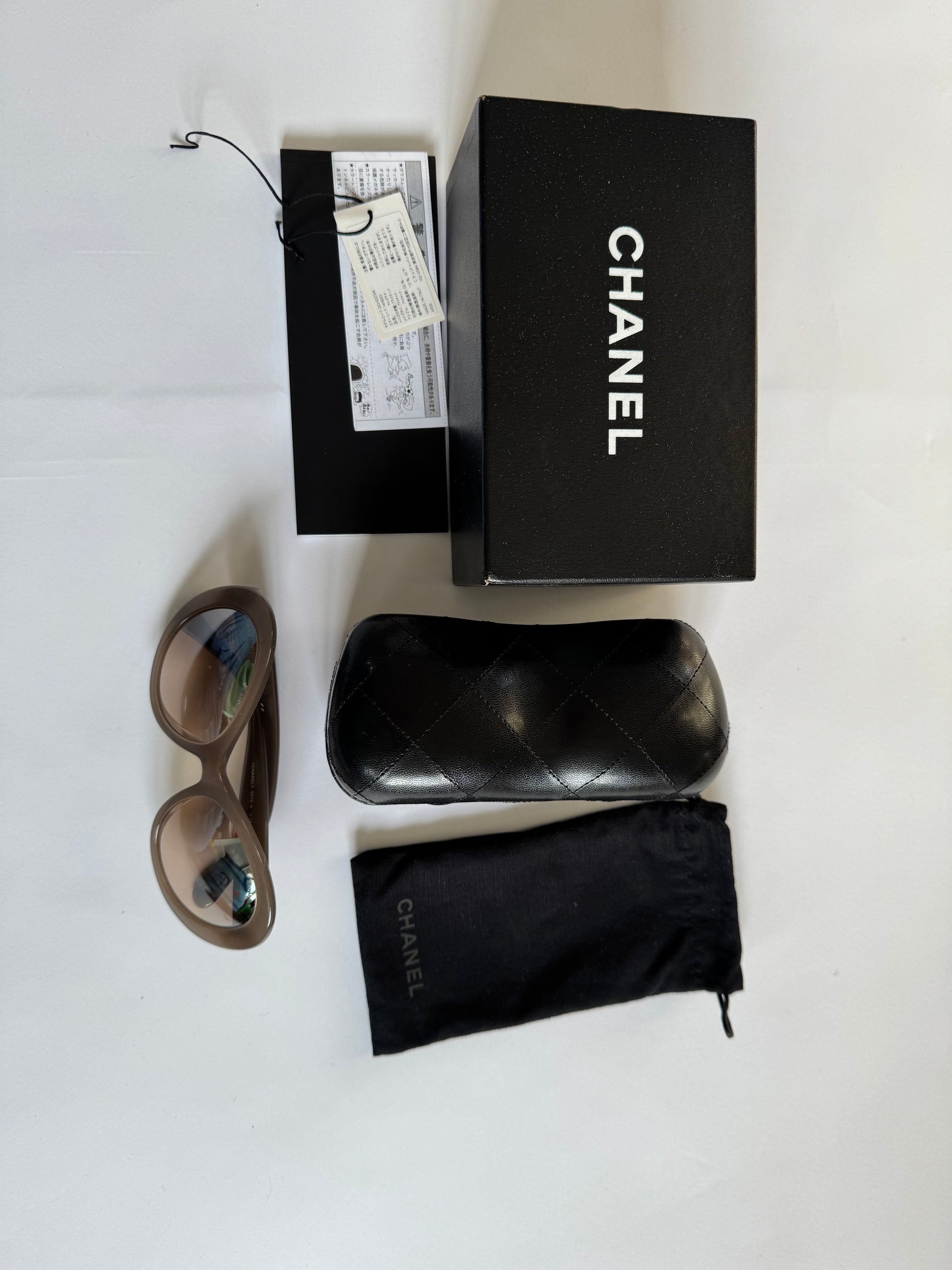 Details: Oversized Chanel sunglasses, model 5372, featuring a bold rounded silhouette and tinted lenses with subtle Chanel branding.