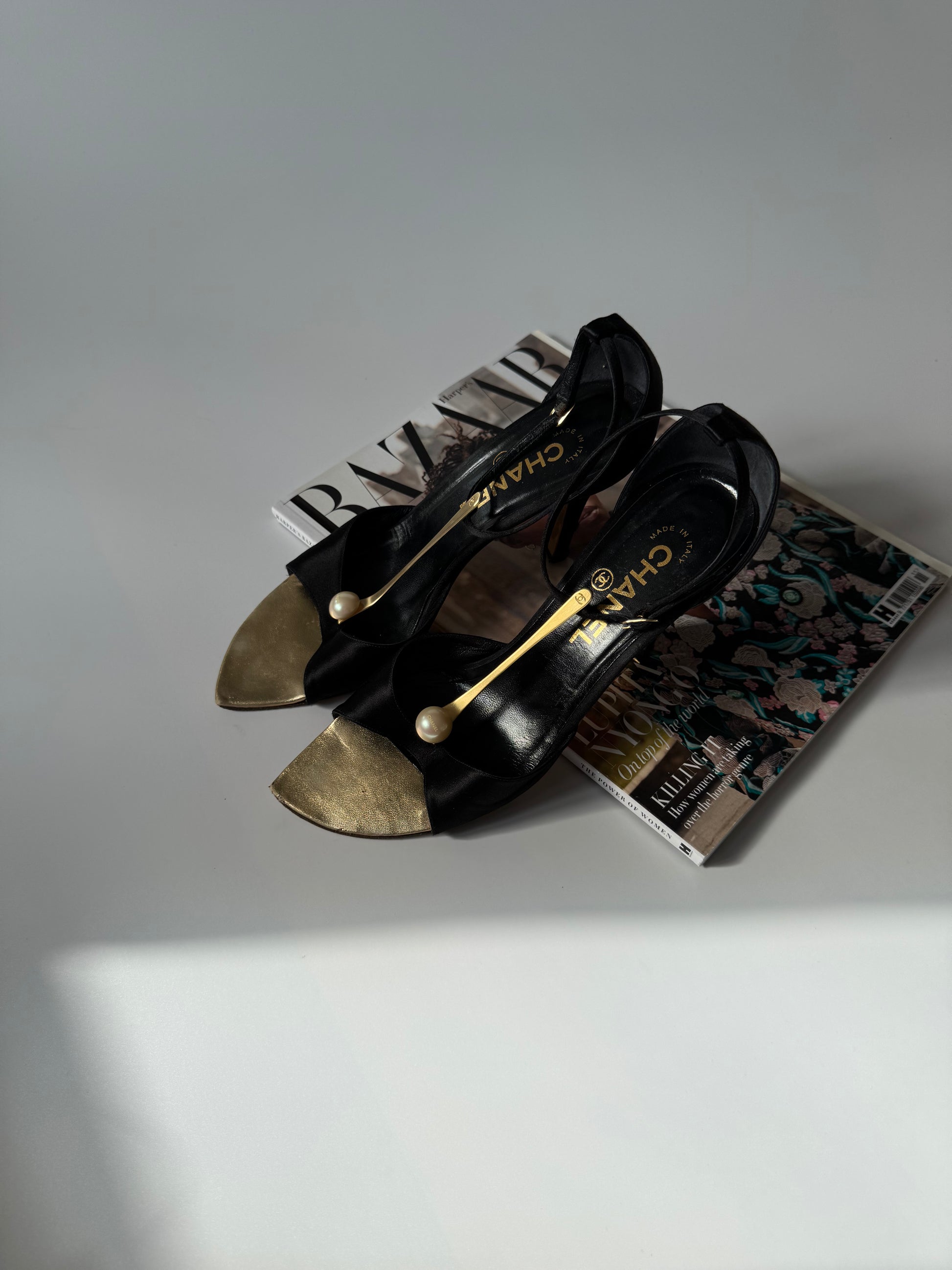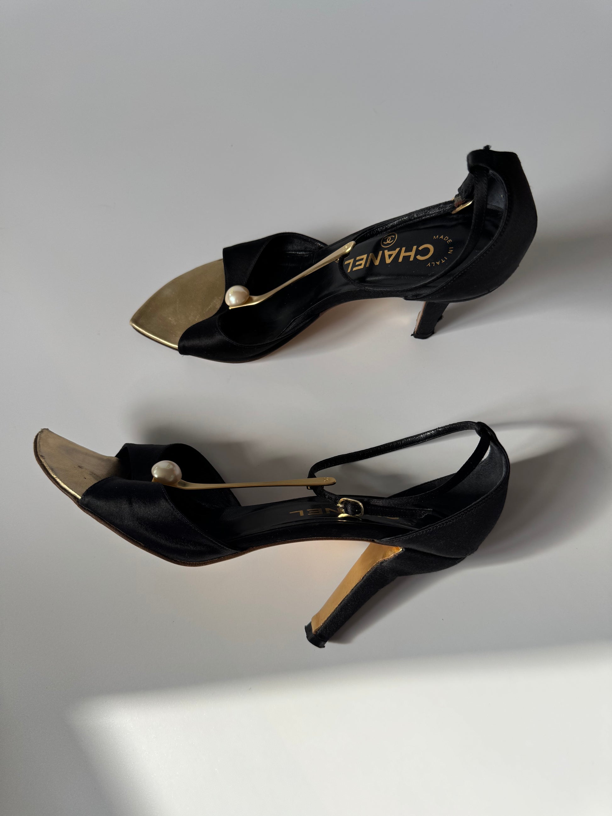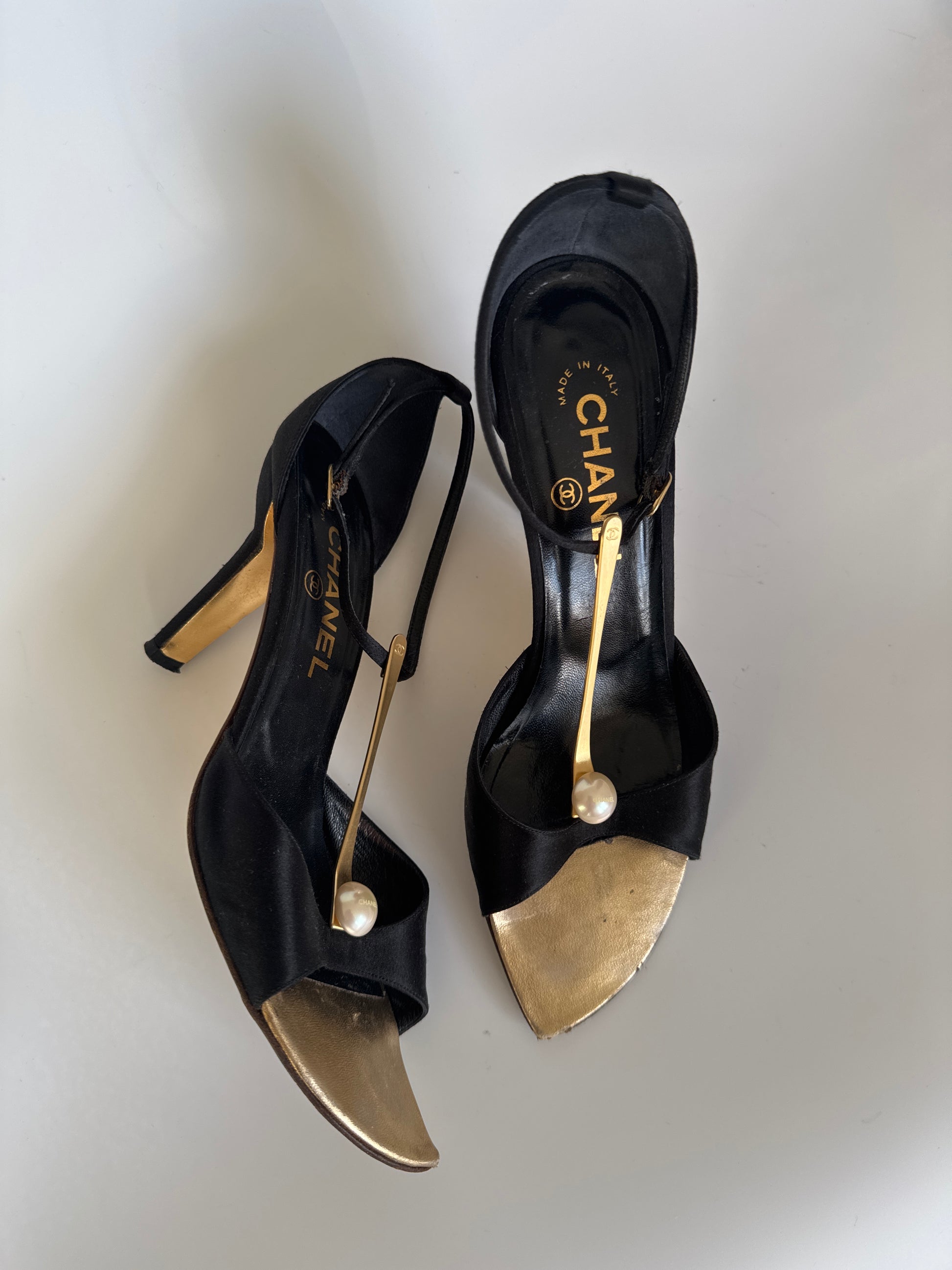 2000s Chanel Vintage Black Satin & Gold Pearl Detail Sandals Size 37.5 UK 4