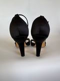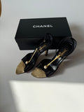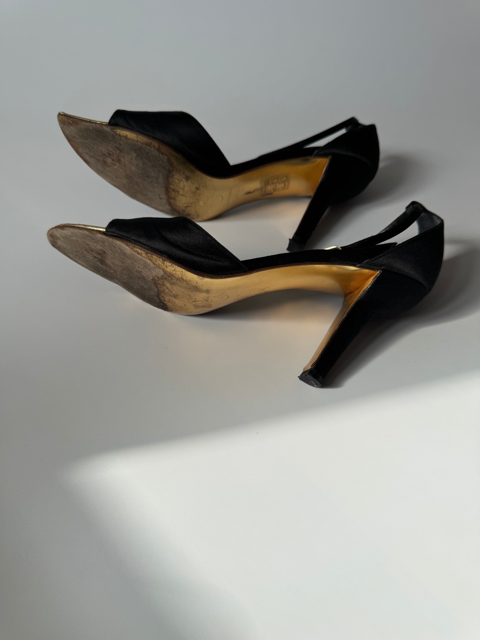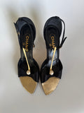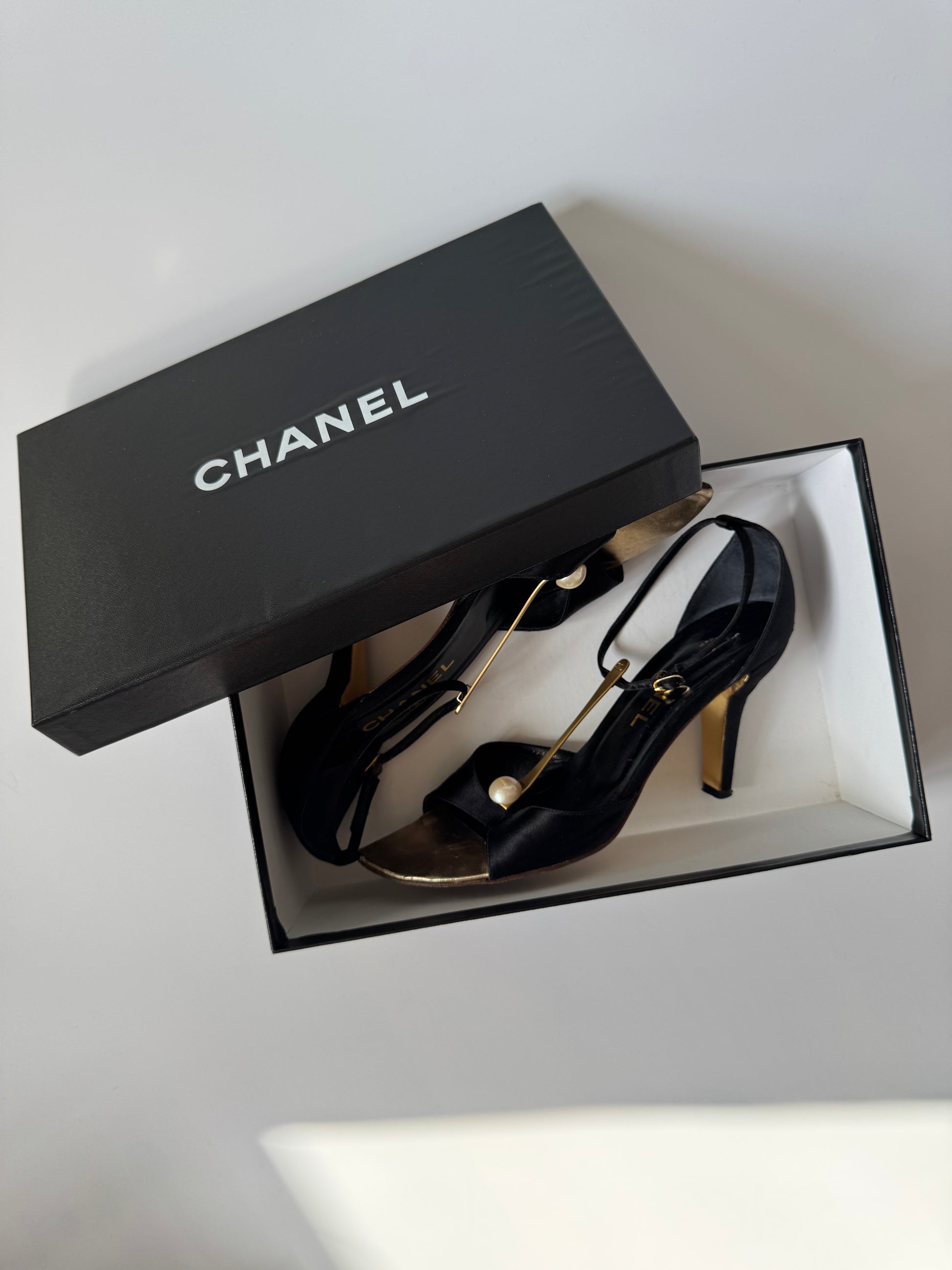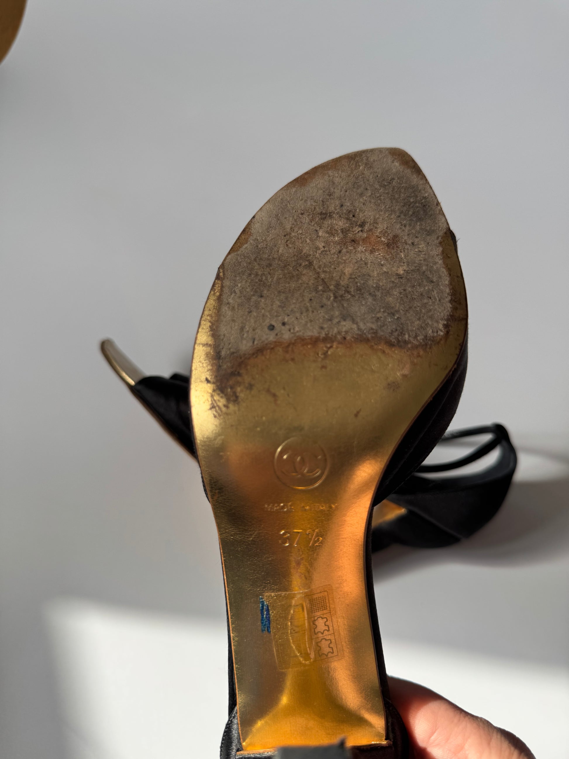 2000s Chanel Vintage Black Satin & Gold Pearl Detail Sandals Size 37.5 UK 4