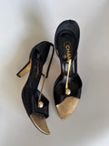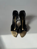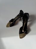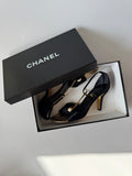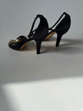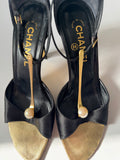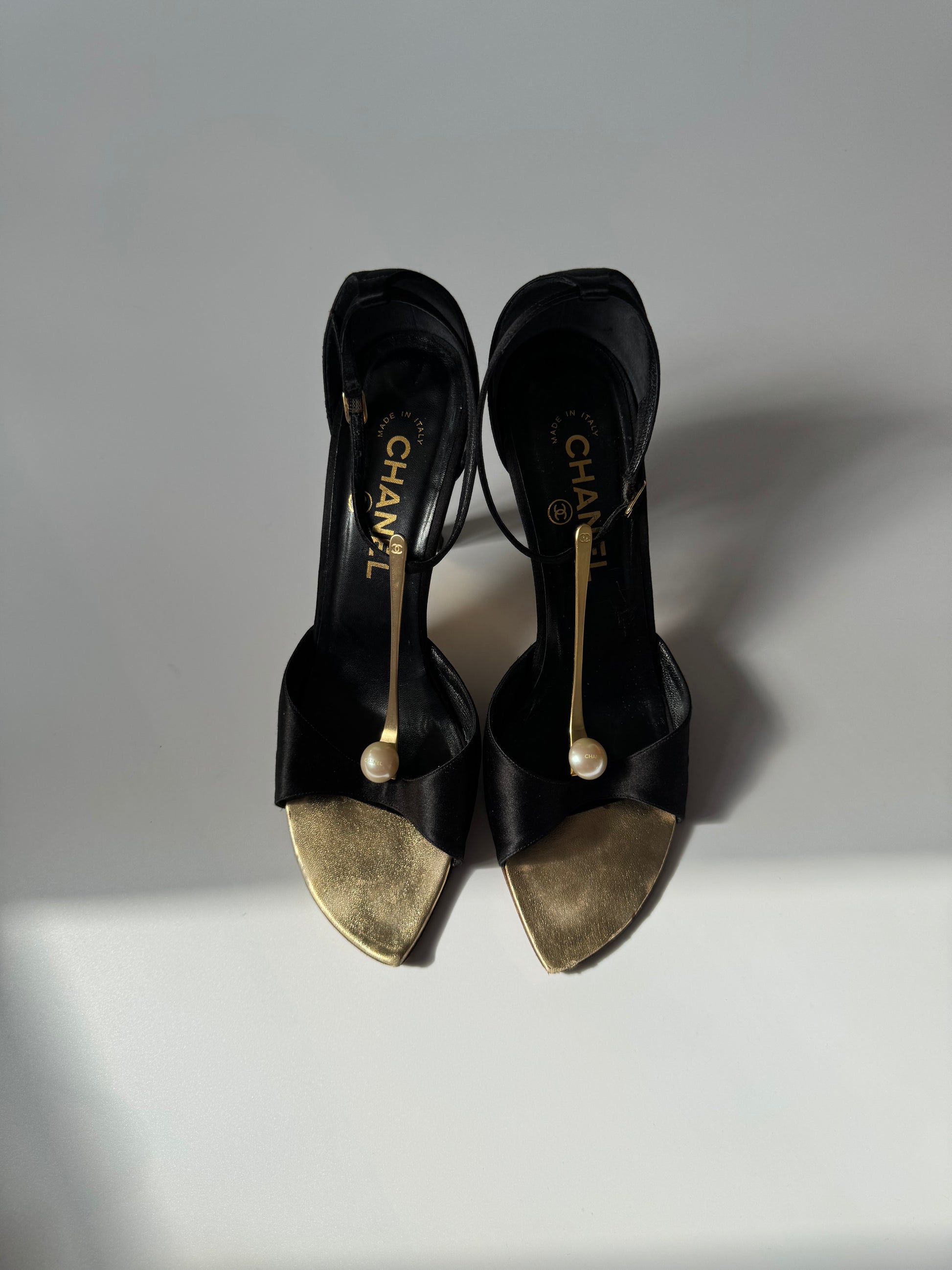 Crafted in luxurious black satin with striking gold pointed toes, these Chanel heels exude timeless elegance. The refined T-bar strap is finished with the house’s signature pearl detail, adding a touch of classic sophistication. Perfect for evening occasions or chic events.
