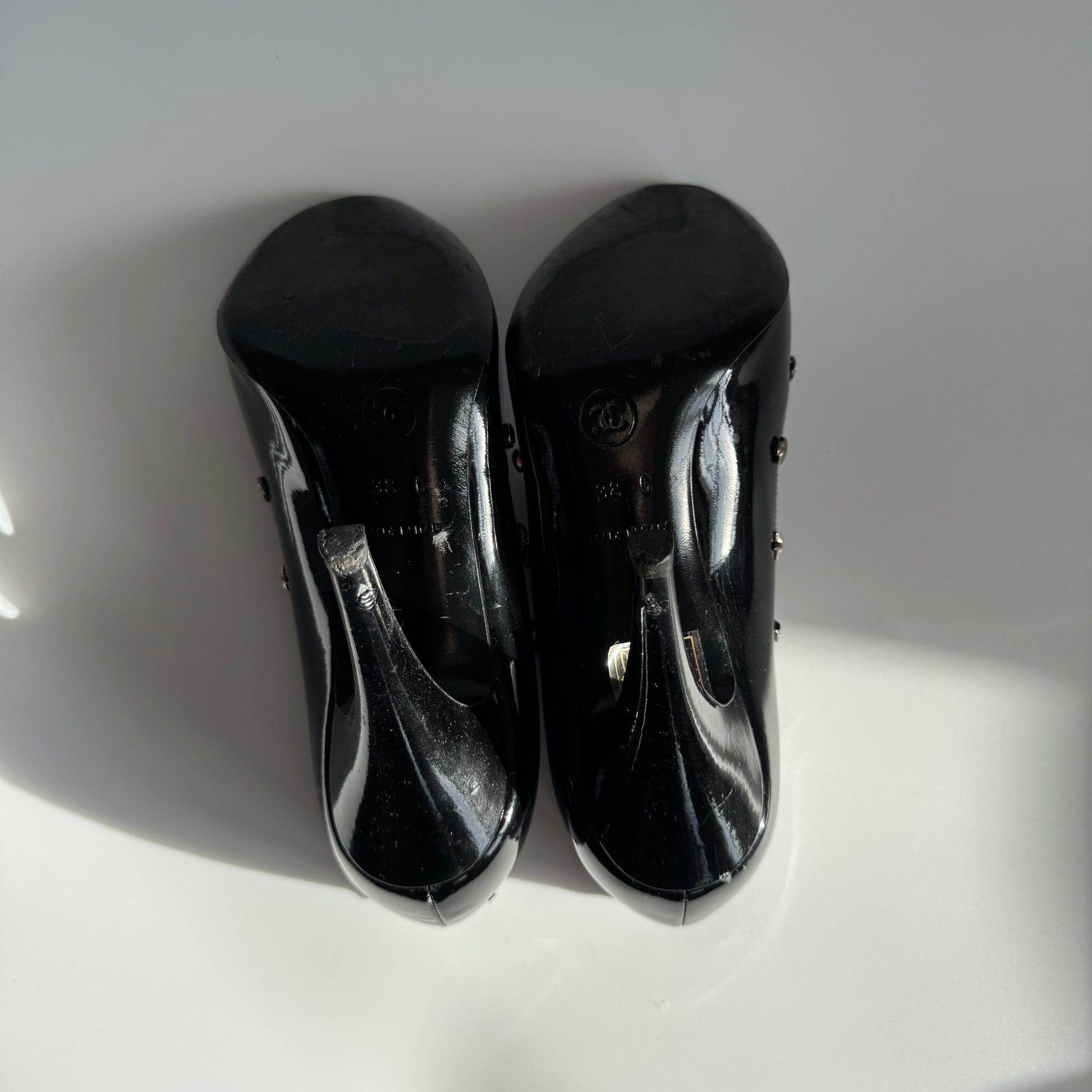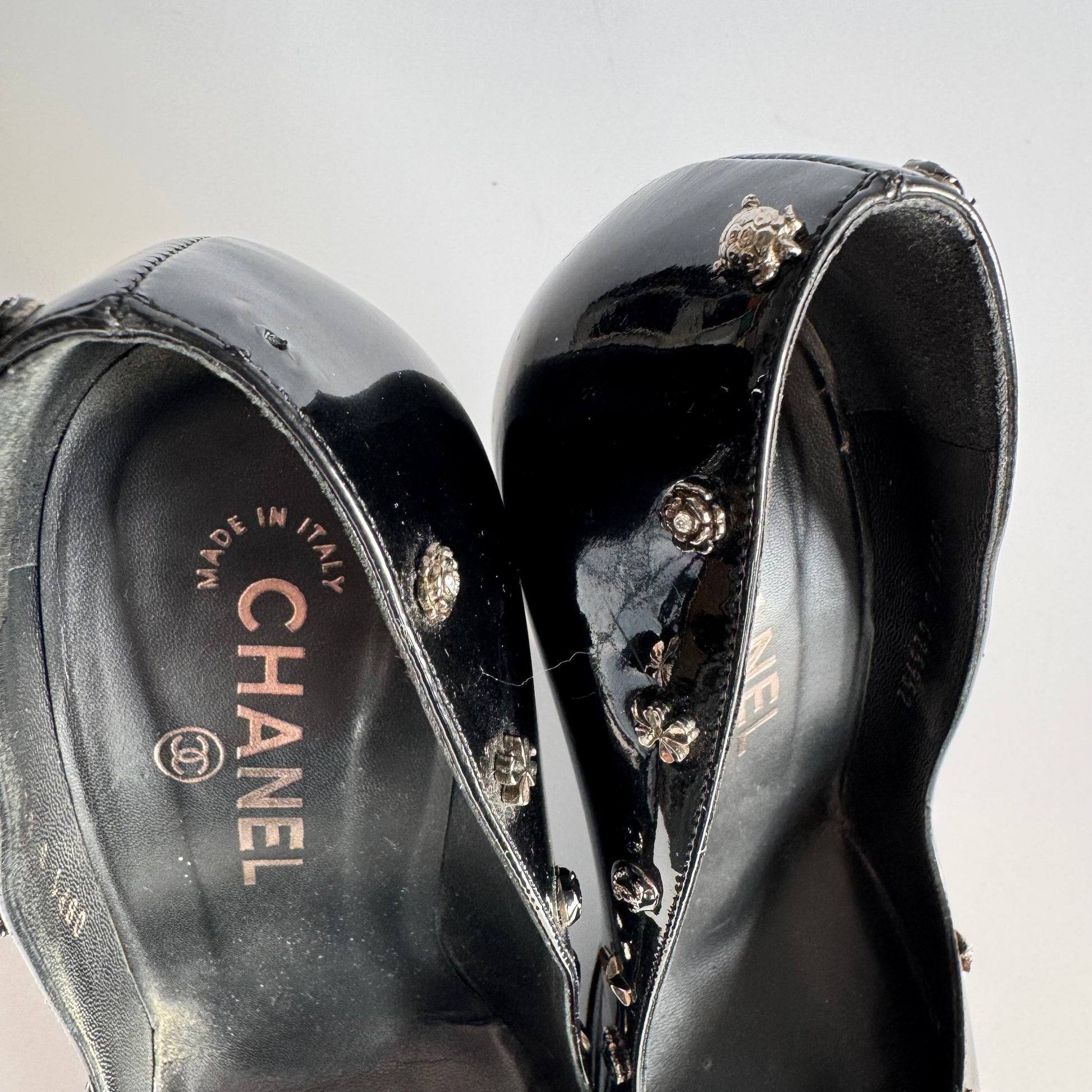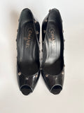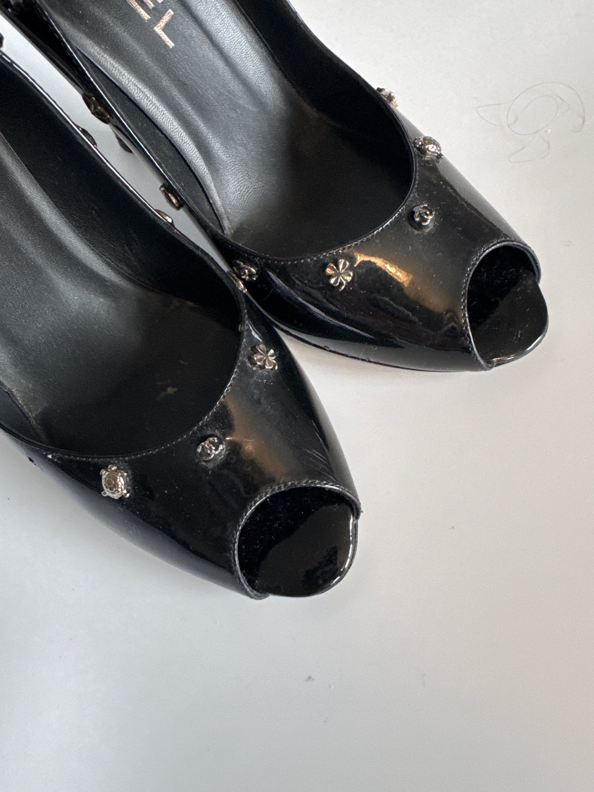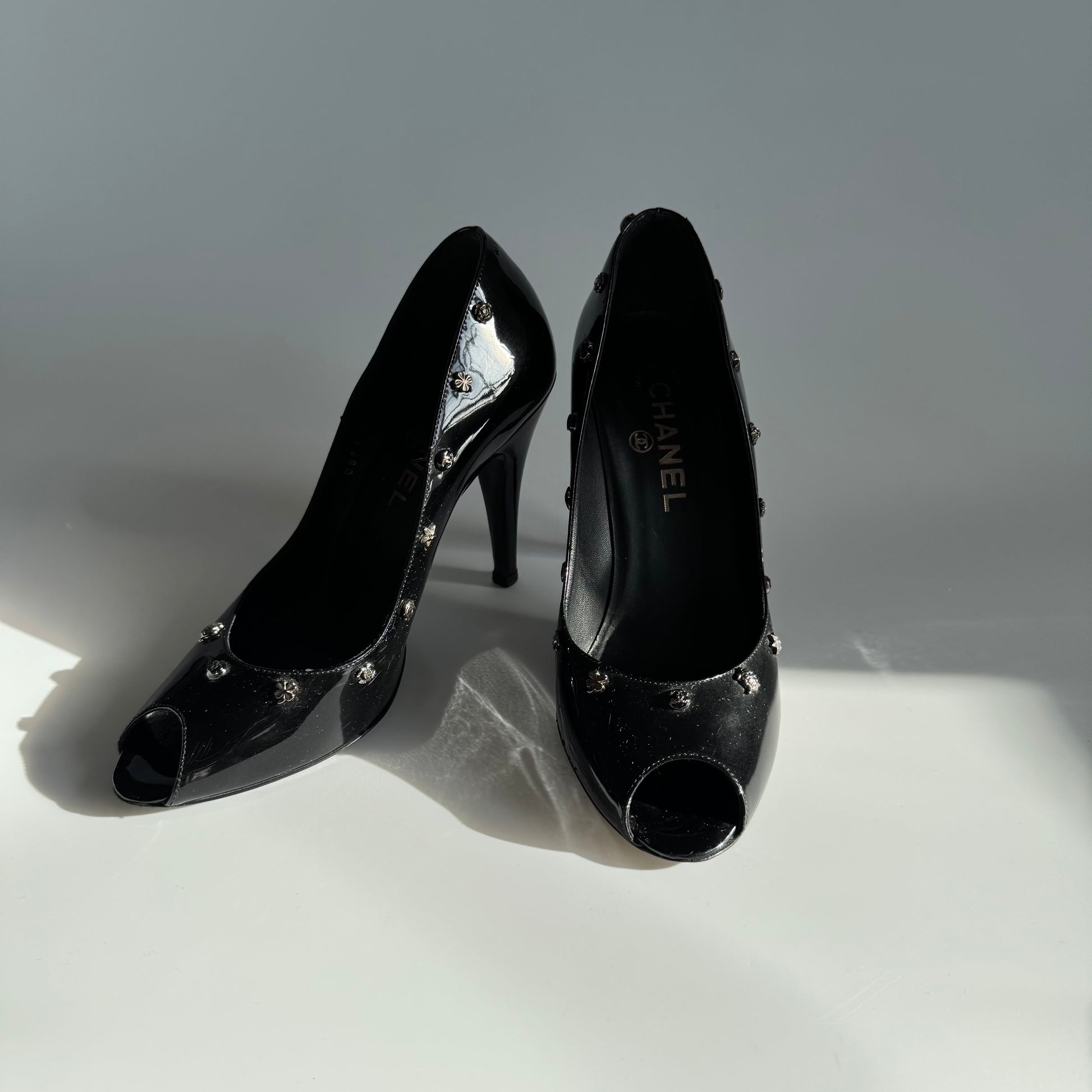 Chanel Black Patent Peep-Toe Pumps with Crystal CC Detail