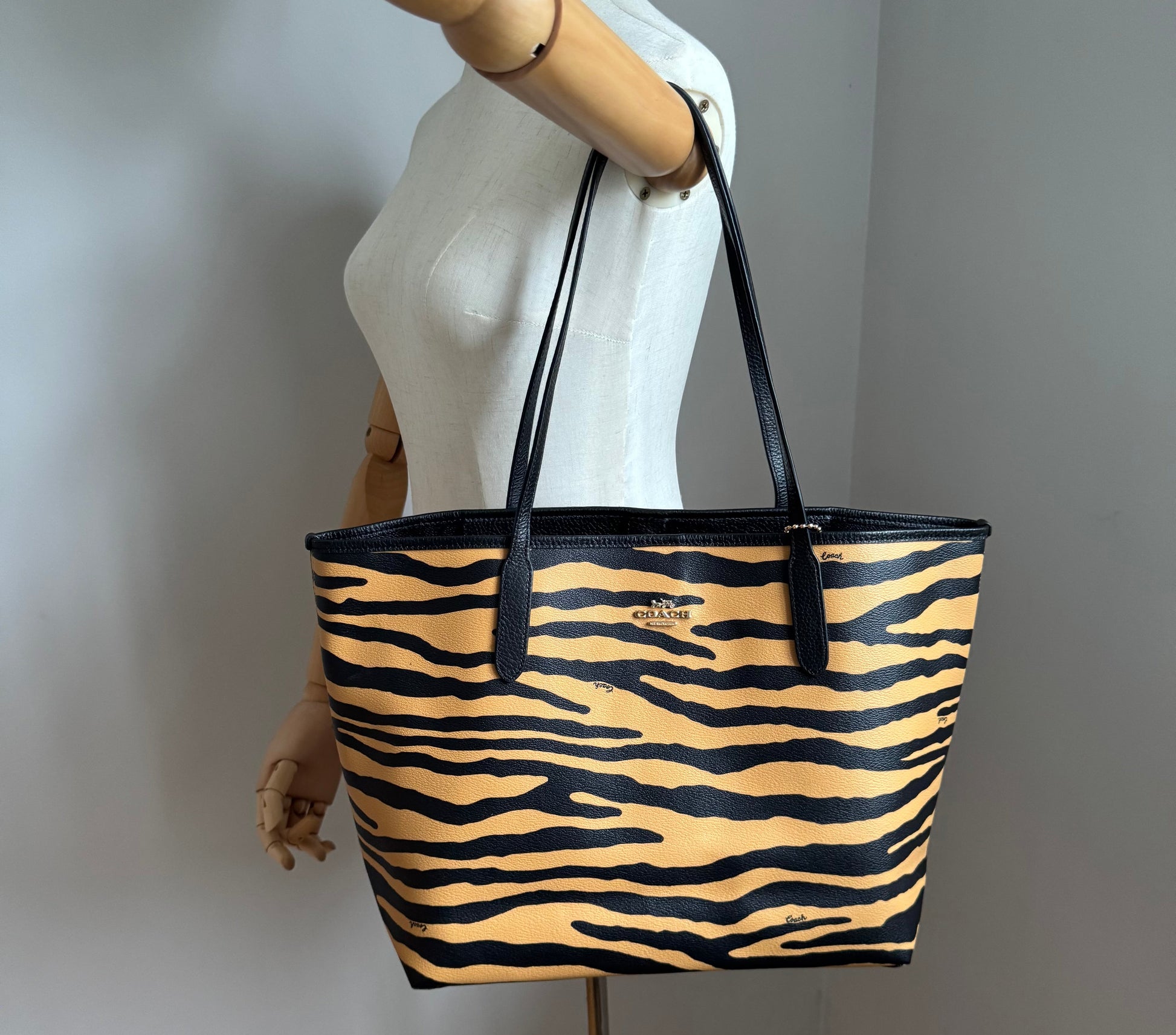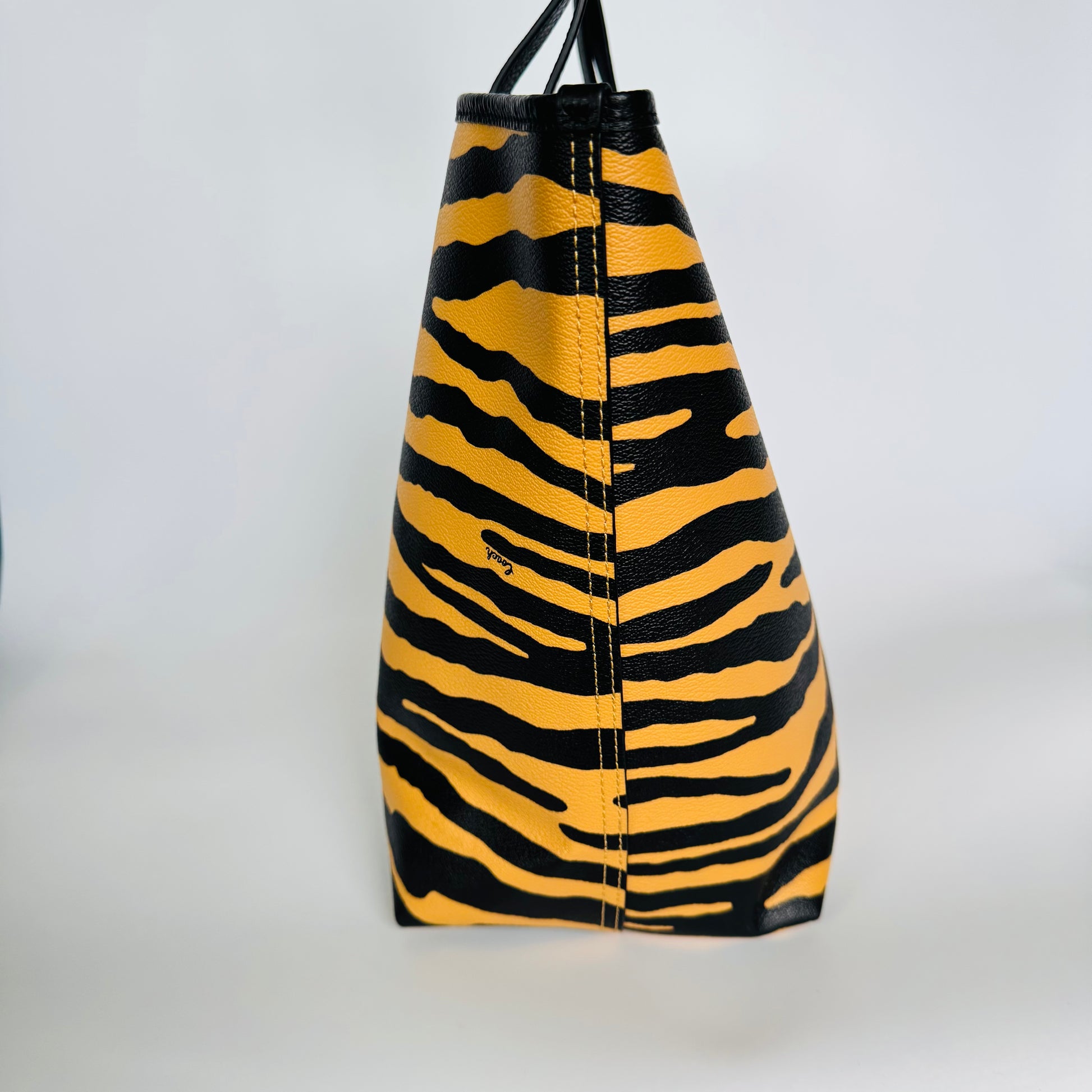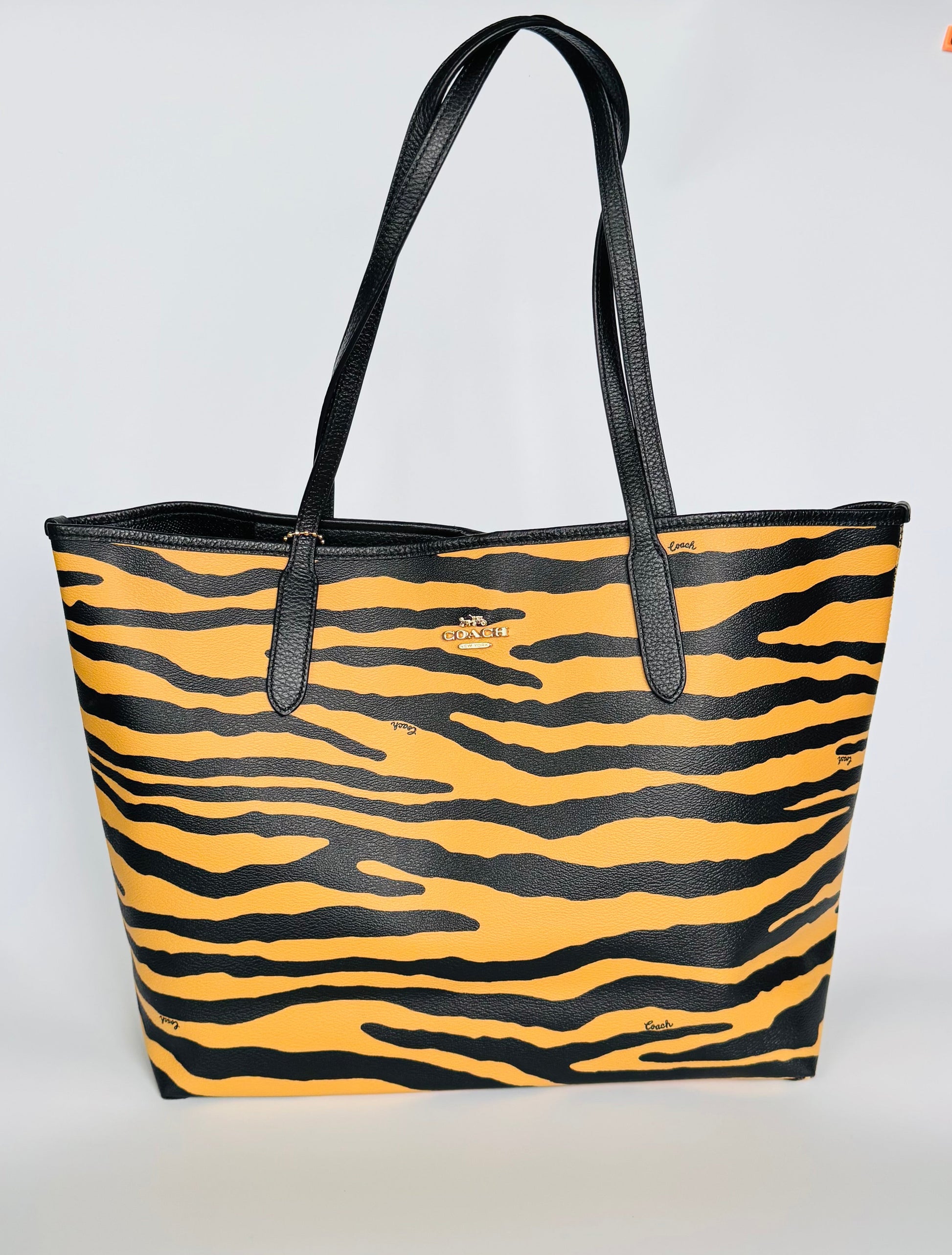 Crafted in coated canvas with a bold tiger-stripe print and black leather handles, this Coach tote brings a confident twist to everyday sophistication. Spacious, structured, and effortlessly chic — ideal for work, travel, or statement styling on the go.