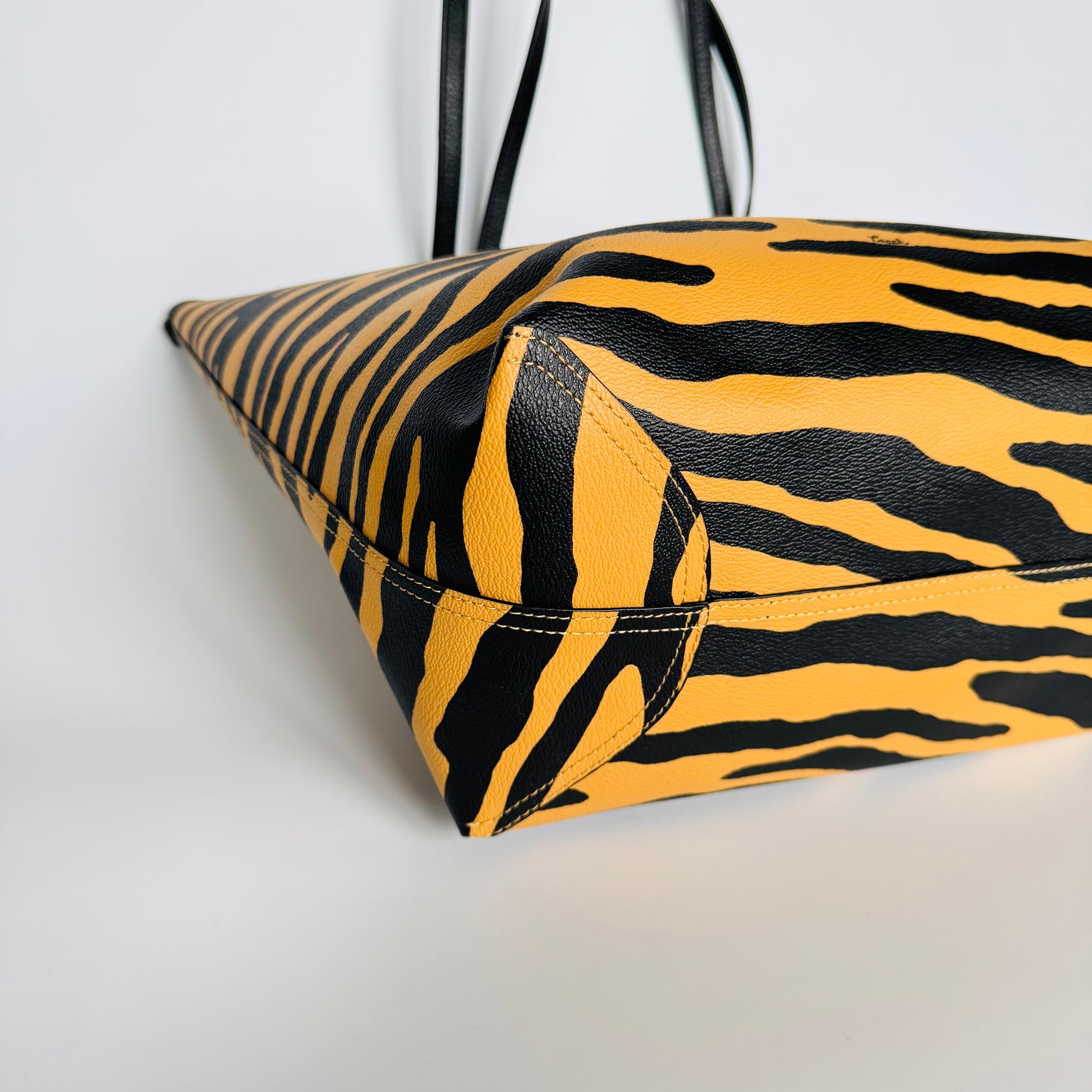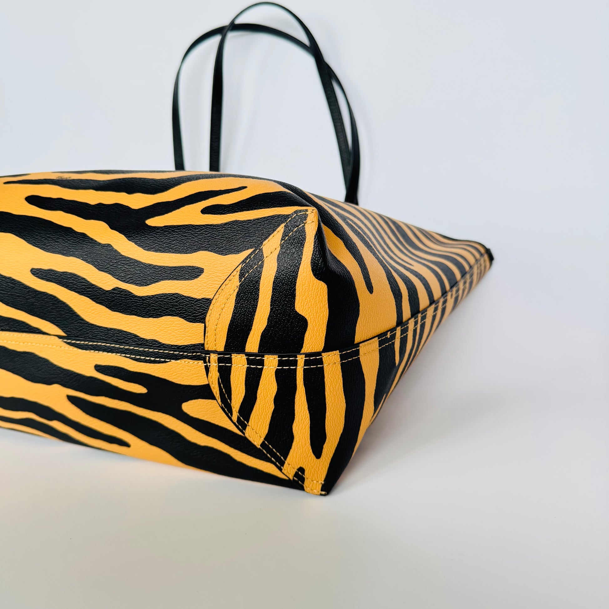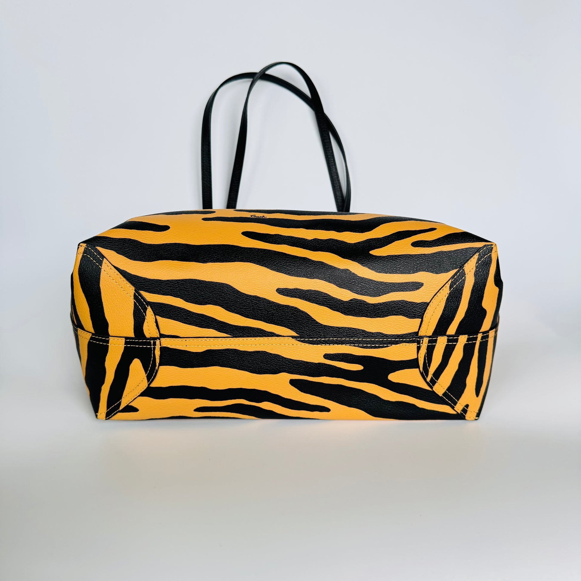 Crafted in coated canvas with a bold tiger-stripe print and black leather handles, this Coach tote brings a confident twist to everyday sophistication. Spacious, structured, and effortlessly chic — ideal for work, travel, or statement styling on the go.