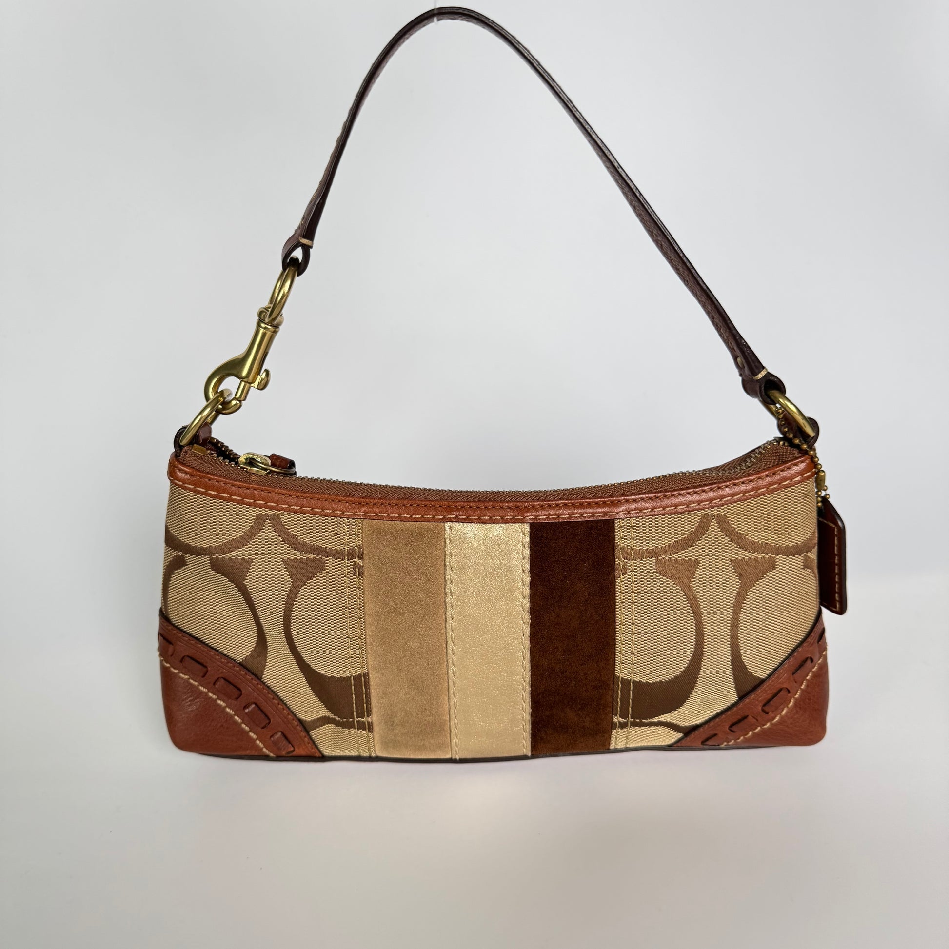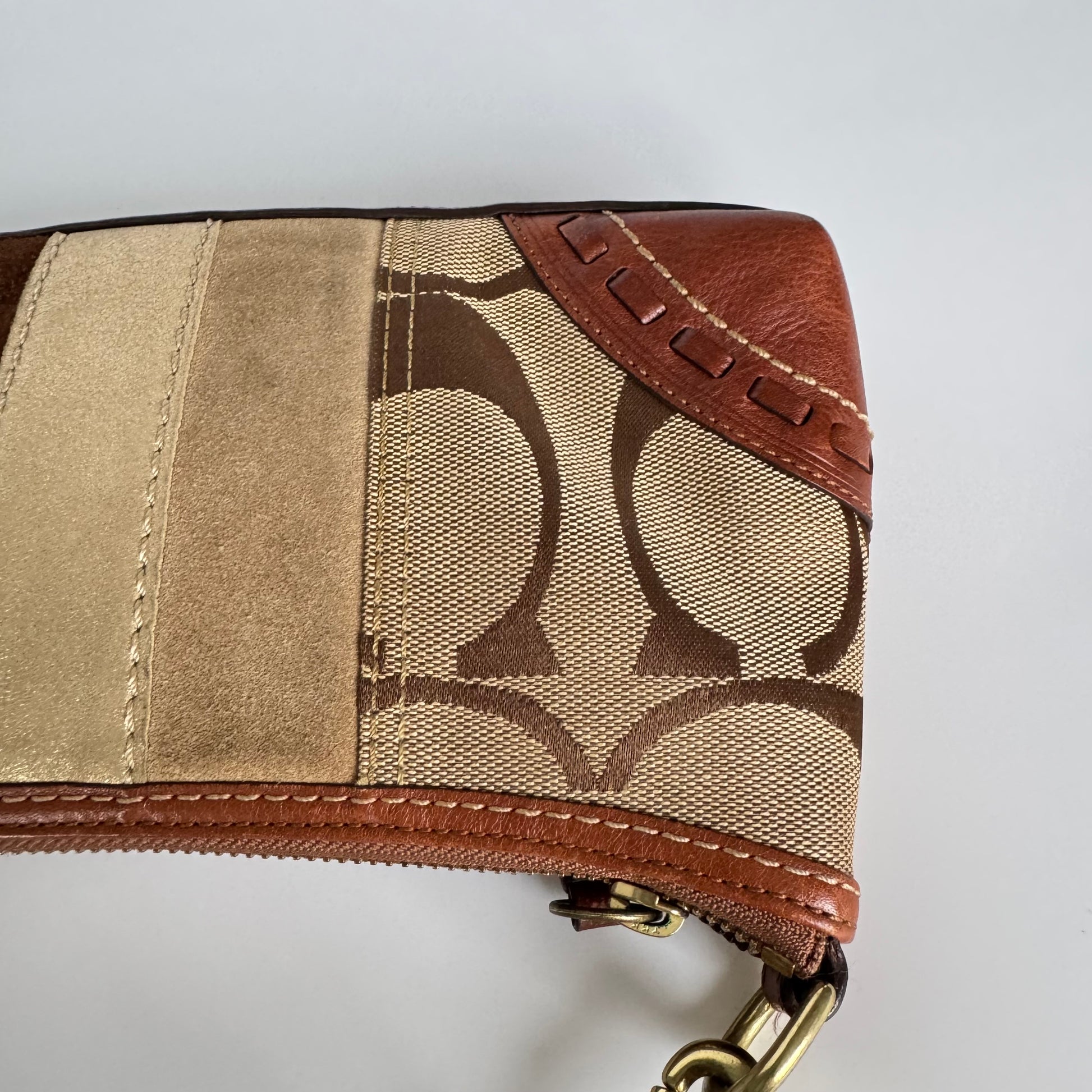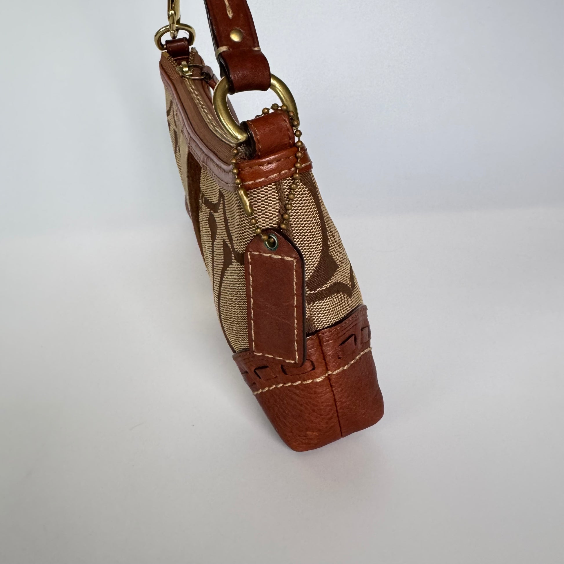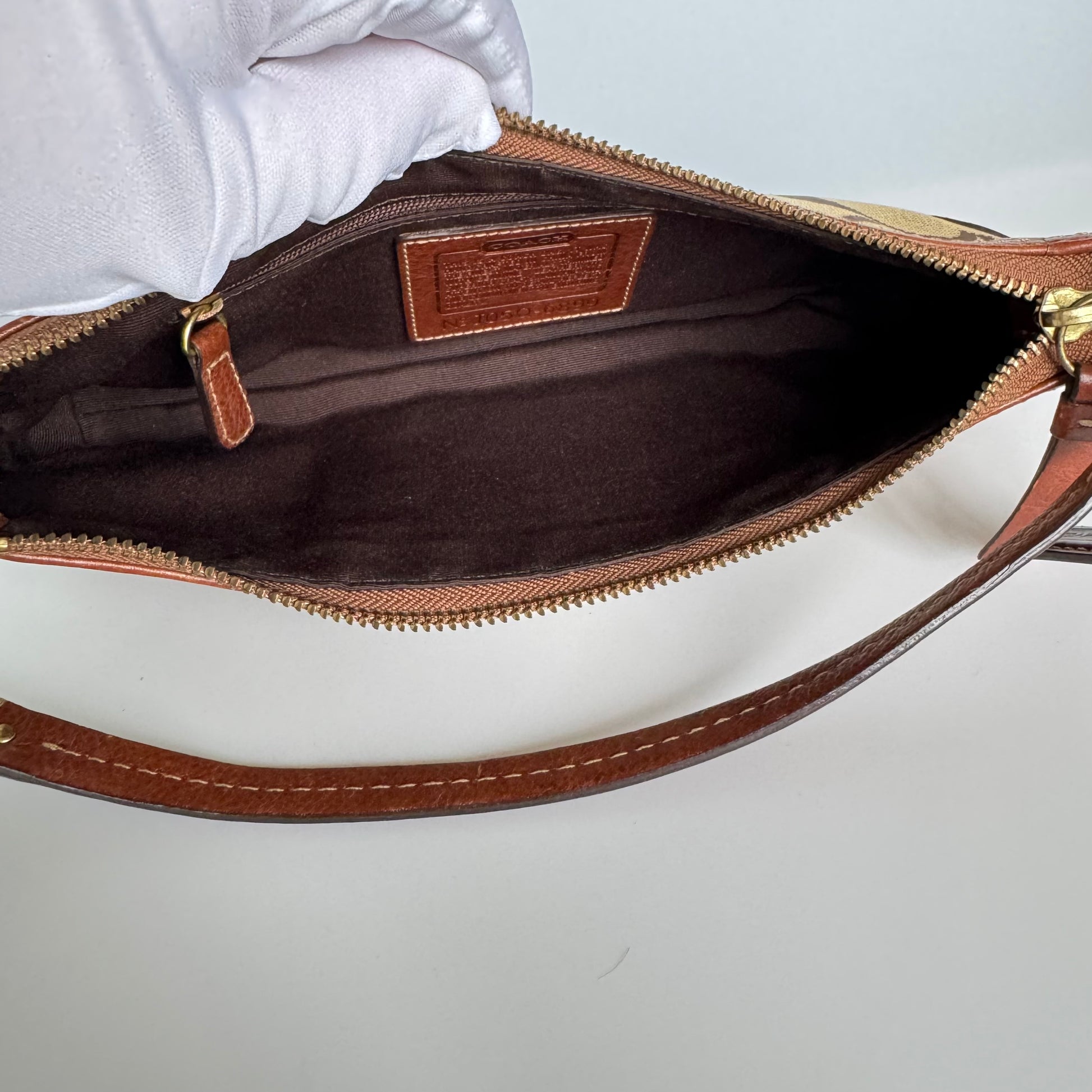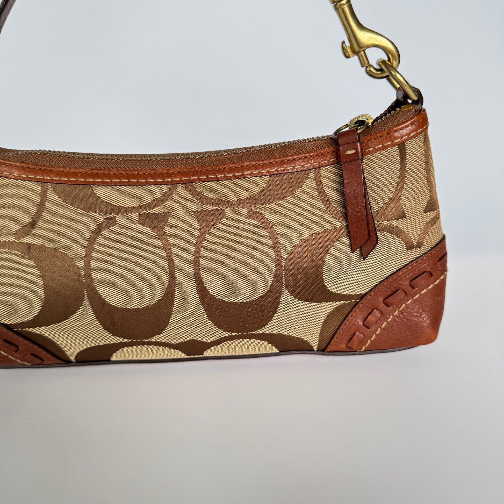 A Y2K favourite — this vintage Coach pochette features the signature monogram canvas with caramel leather trim and brass hardware. Compact, easy, and effortlessly chic for everyday wear.