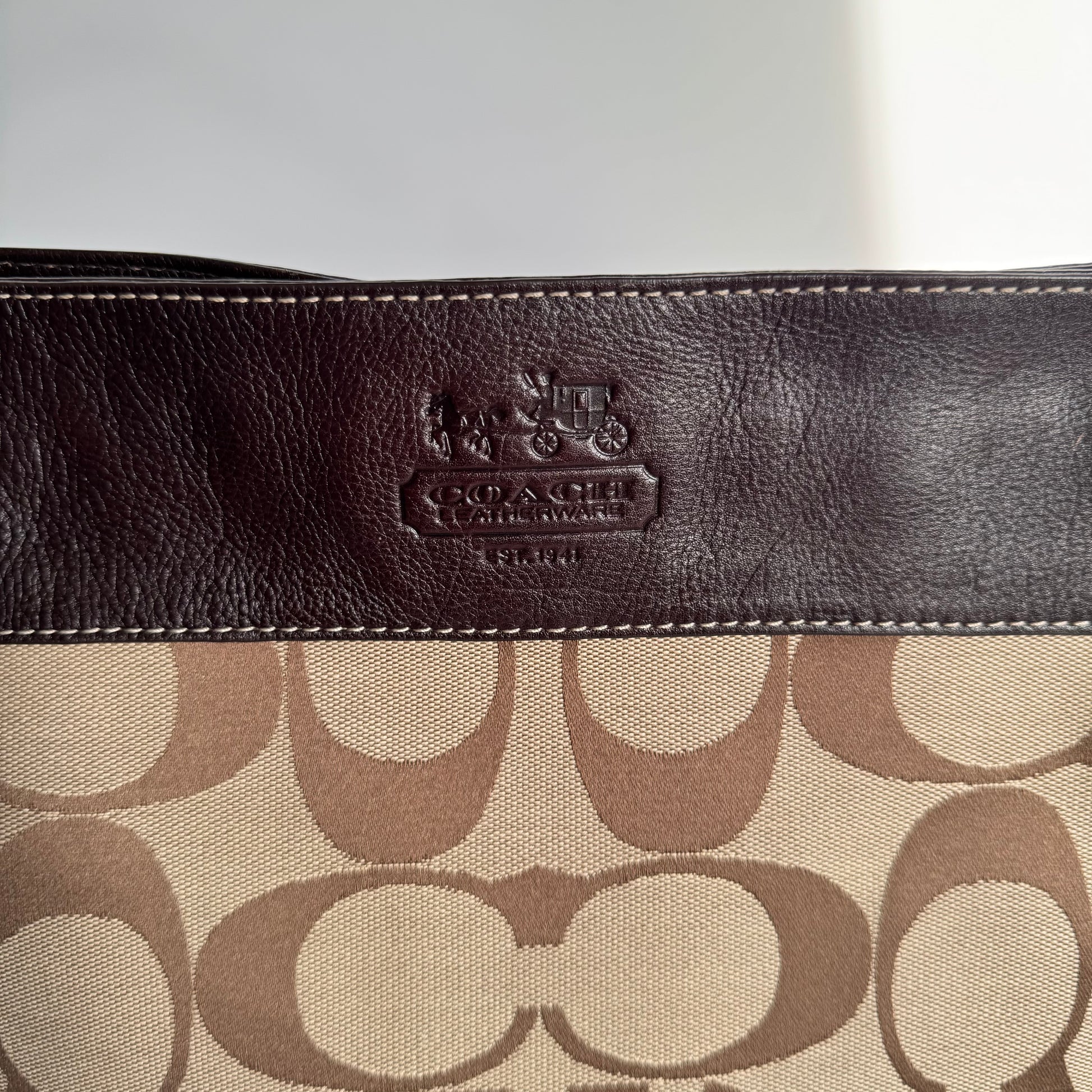 Signature jacquard canvas with dark brown leather trim and brass hardware