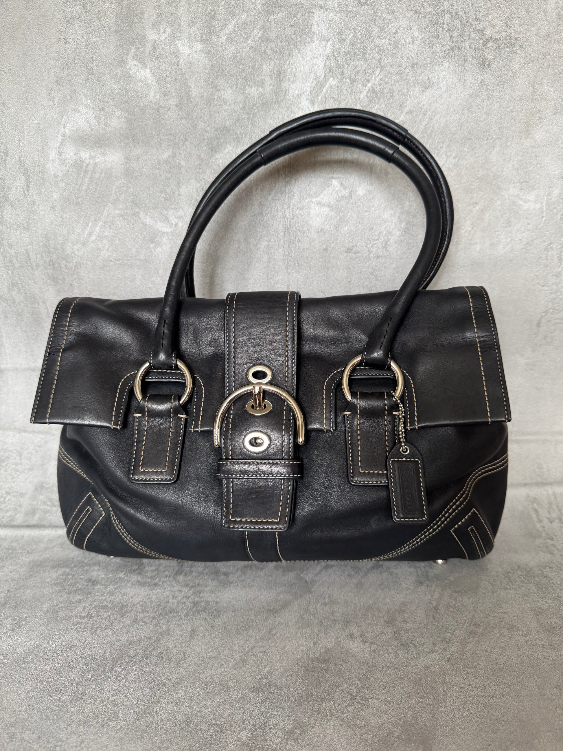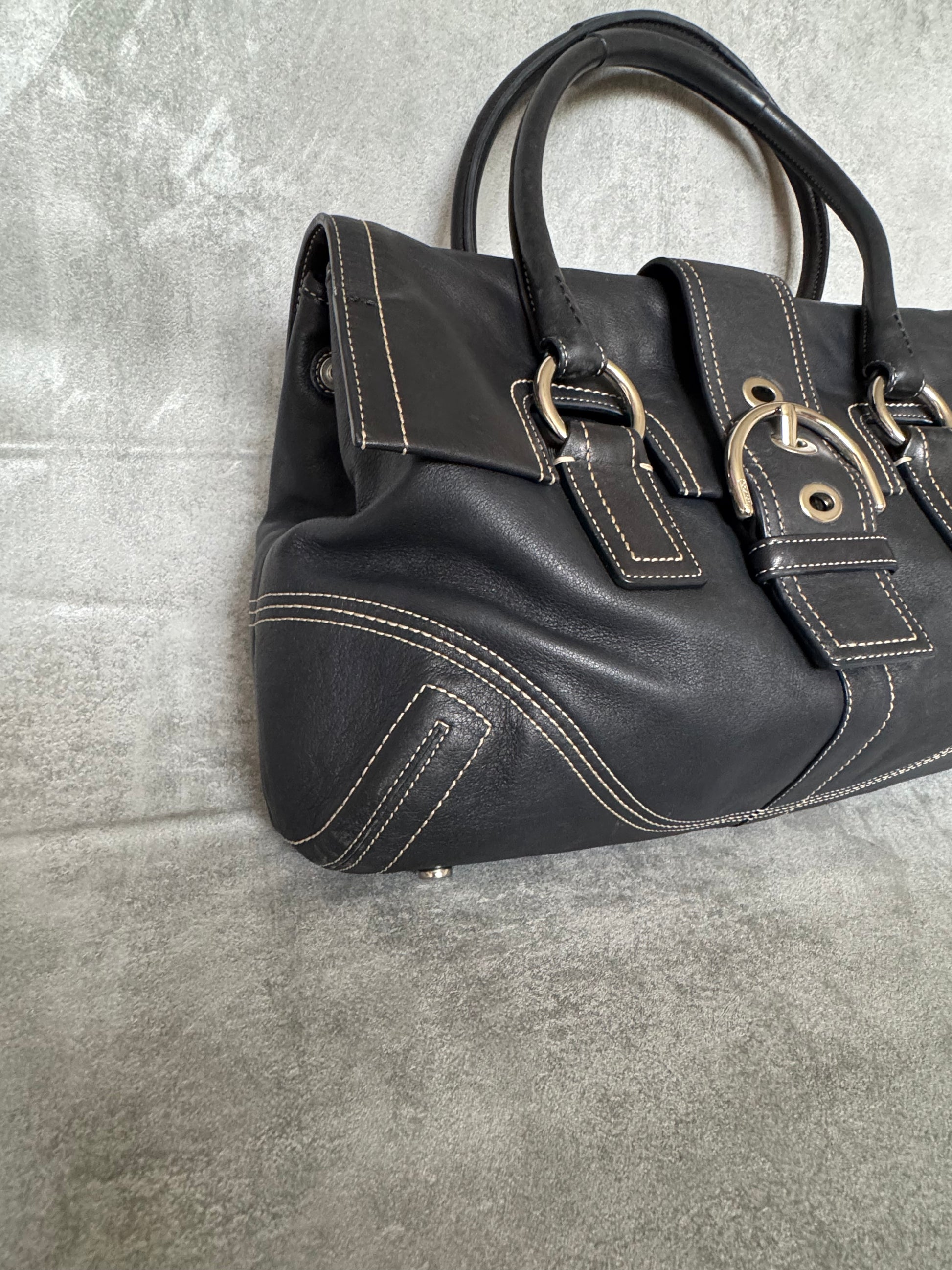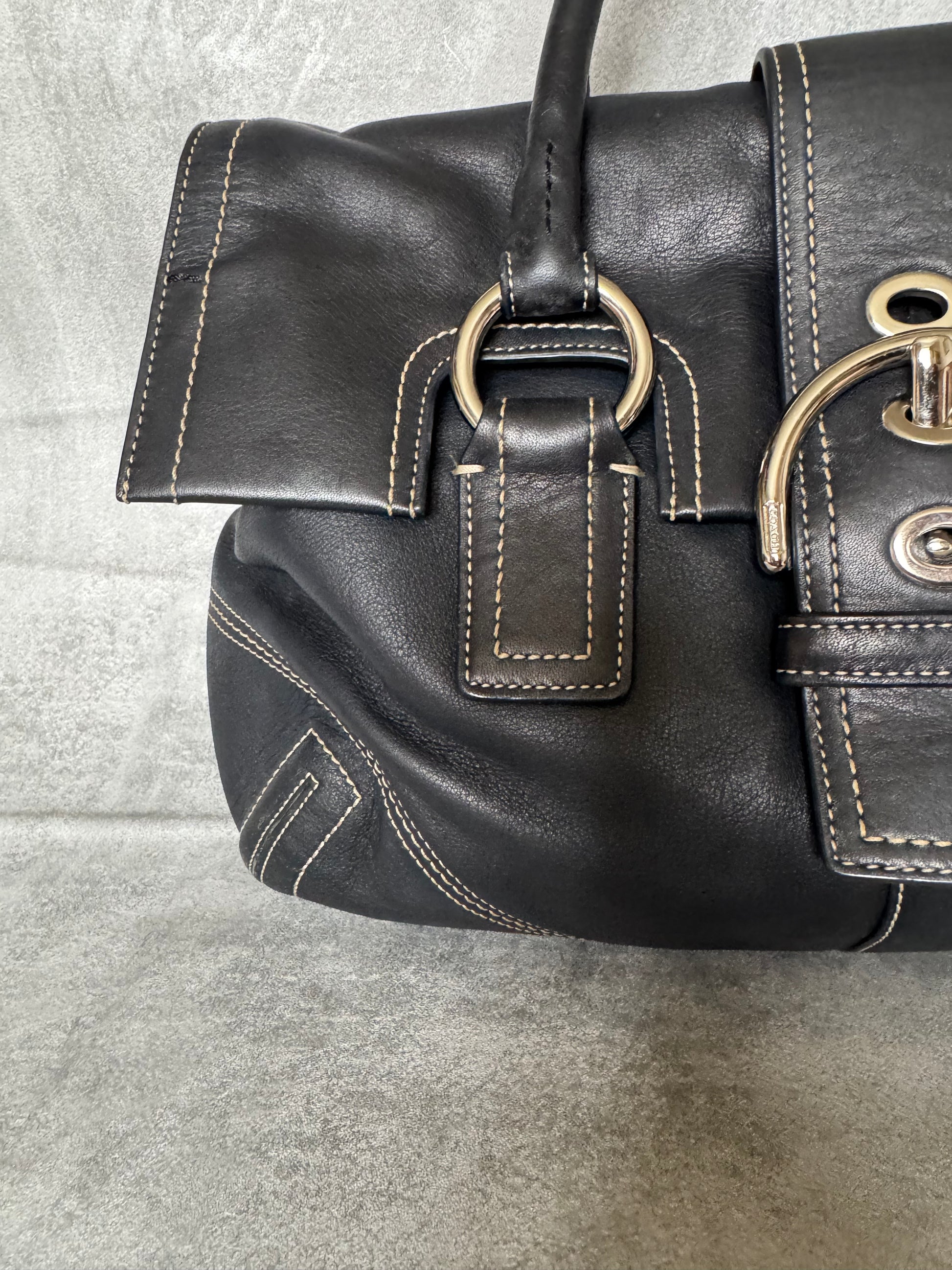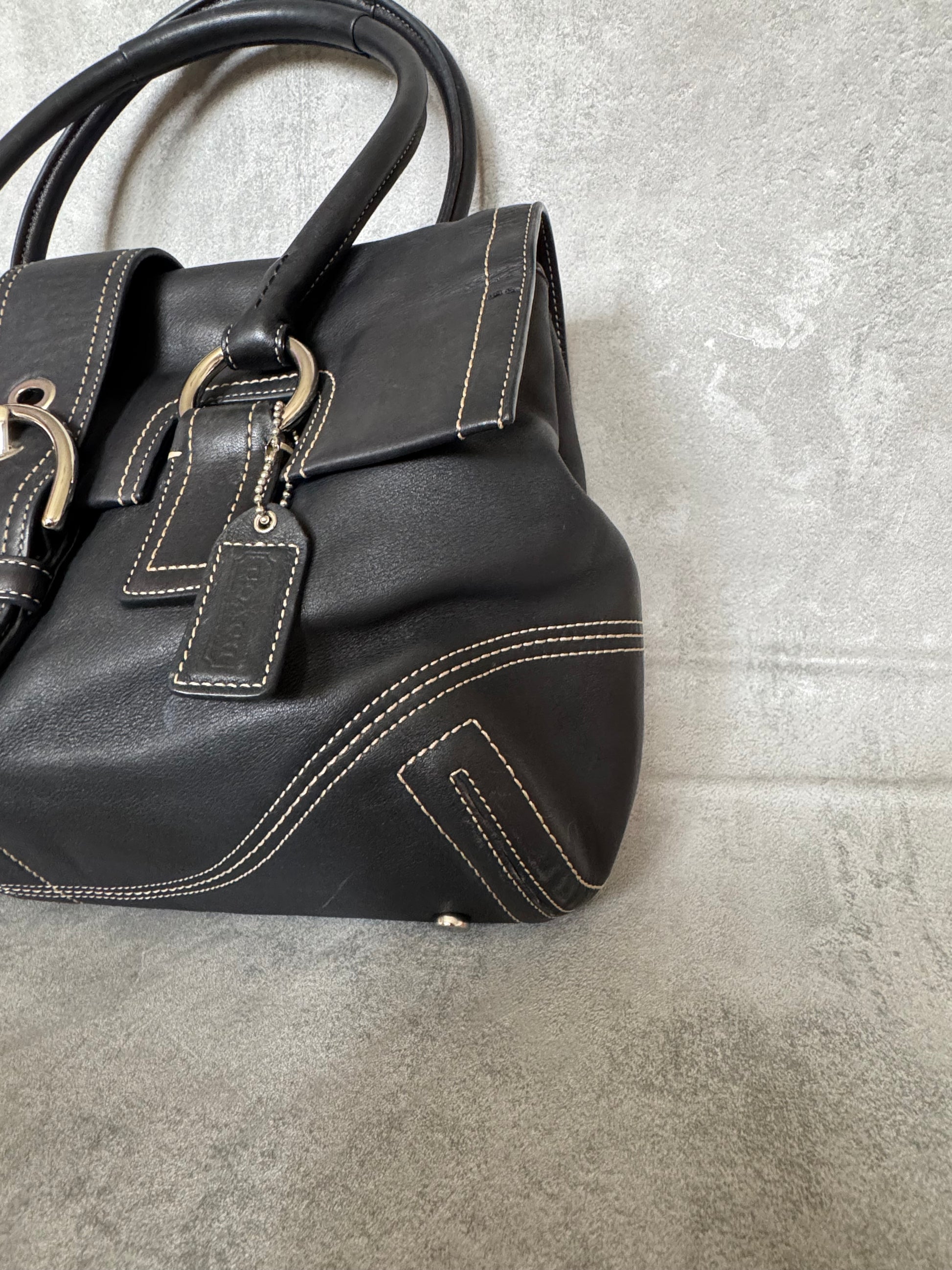 Supple black leather with bold contrast stitching and polished silver-tone hardware. Structured silhouette with dual top handles and a flap front detailed with oversized buckle straps — retro Coach character, everyday practical.