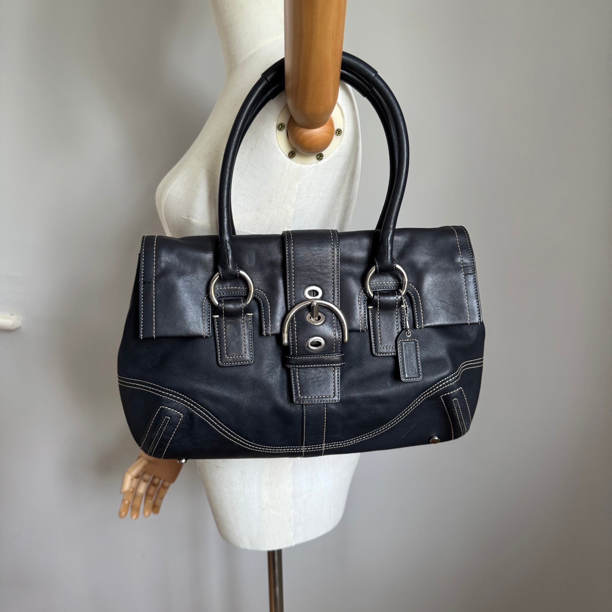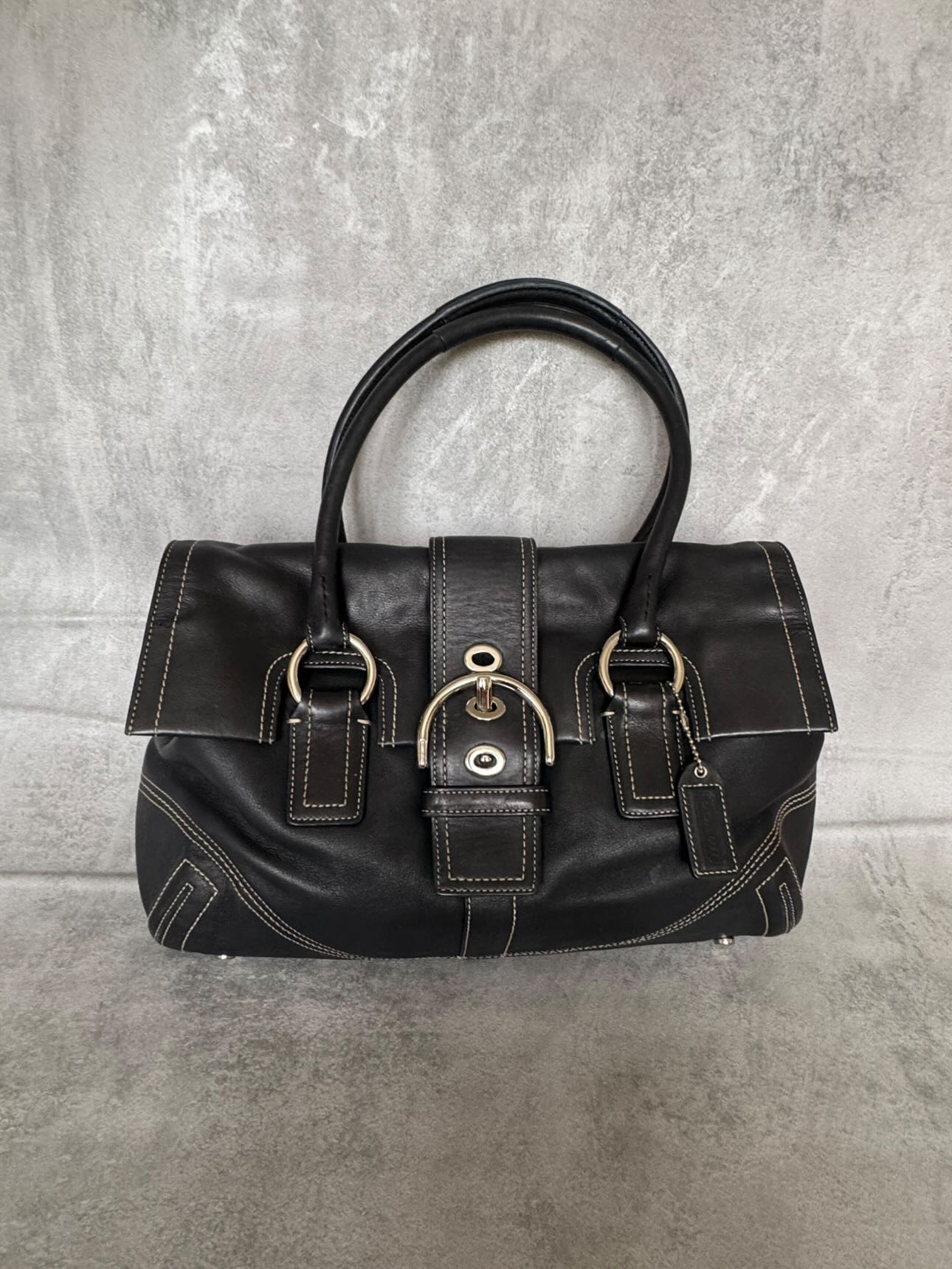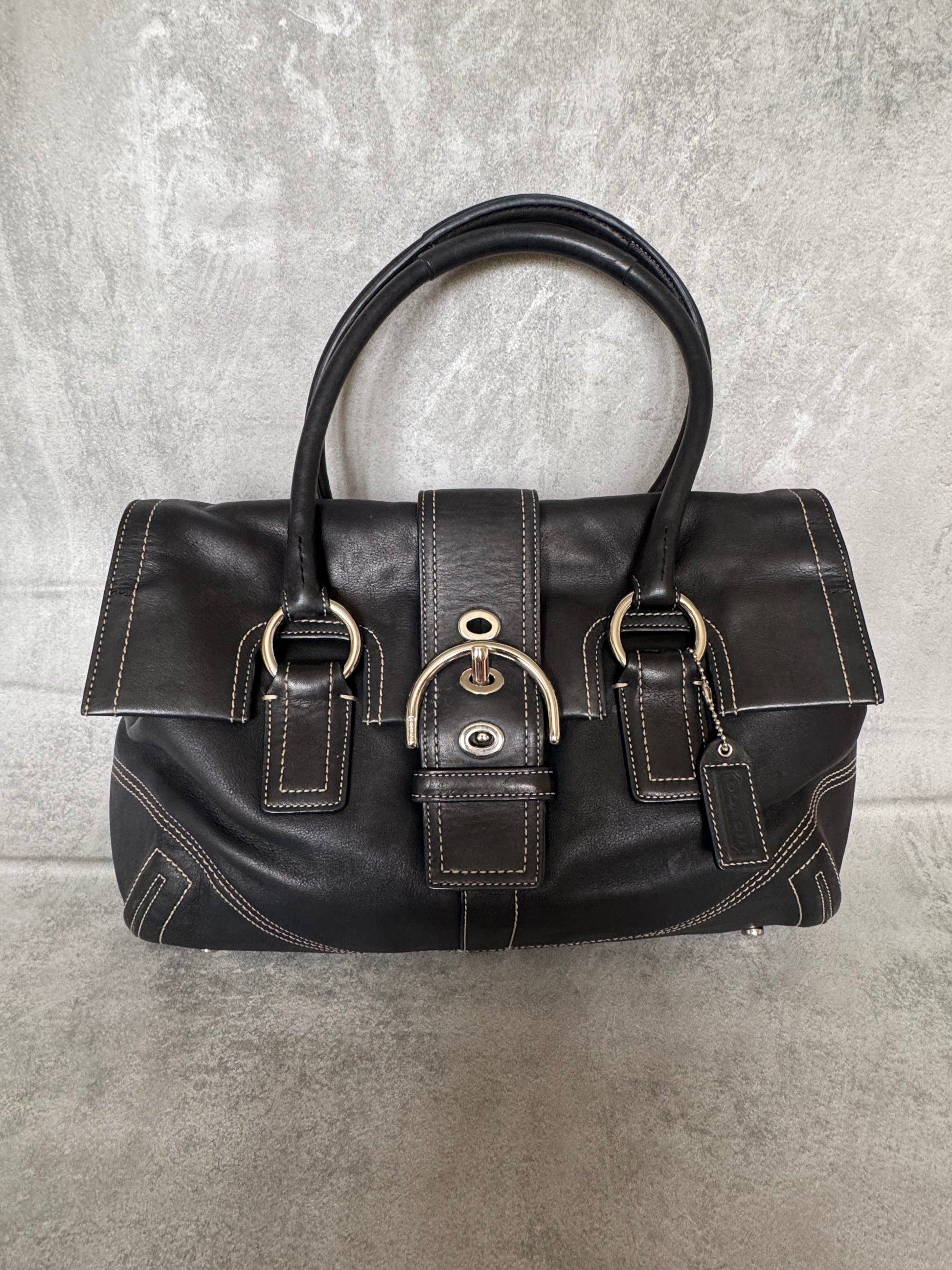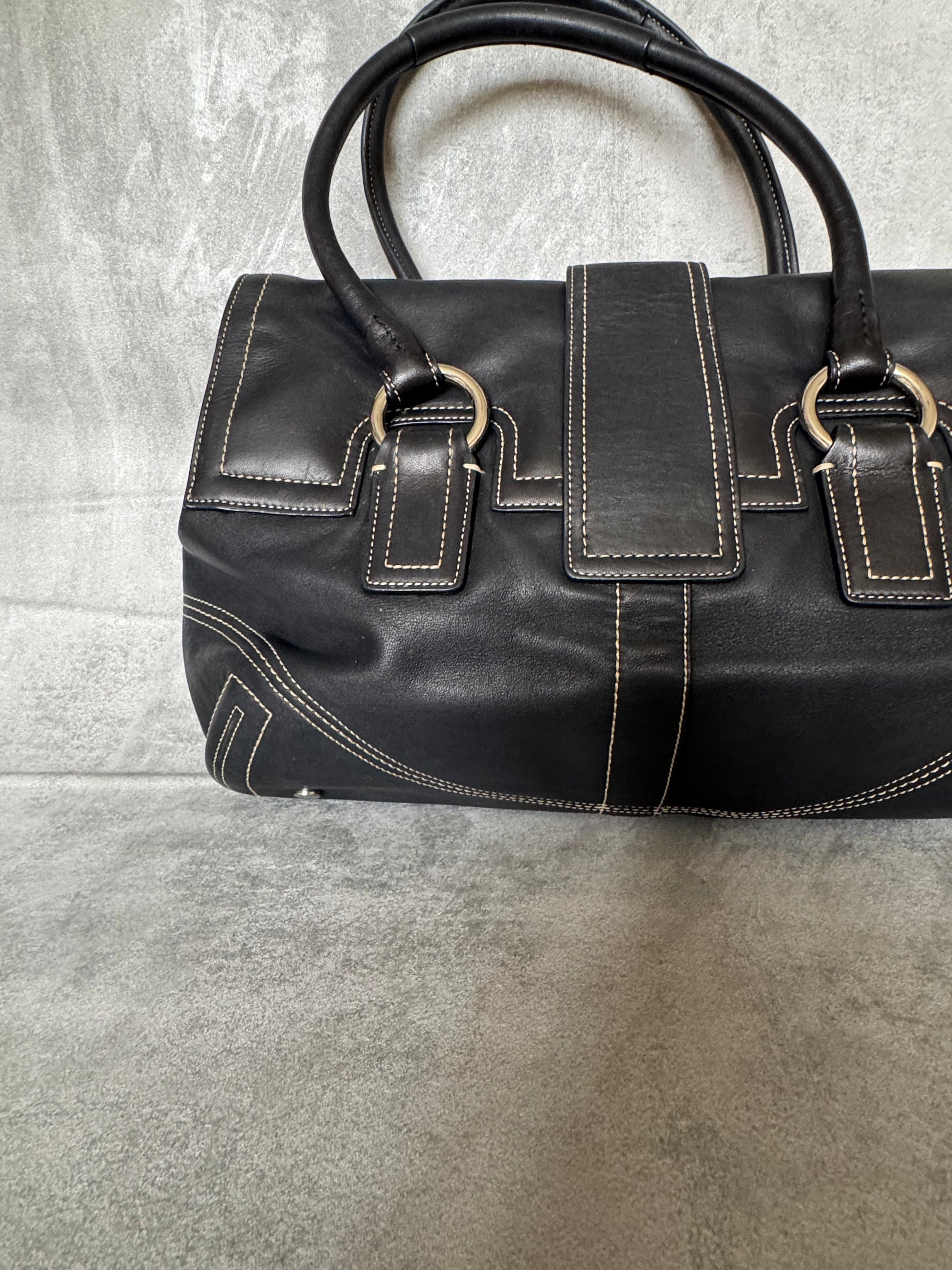 Supple black leather with bold contrast stitching and polished silver-tone hardware. Structured silhouette with dual top handles and a flap front detailed with oversized buckle straps — retro Coach character, everyday practical.