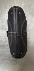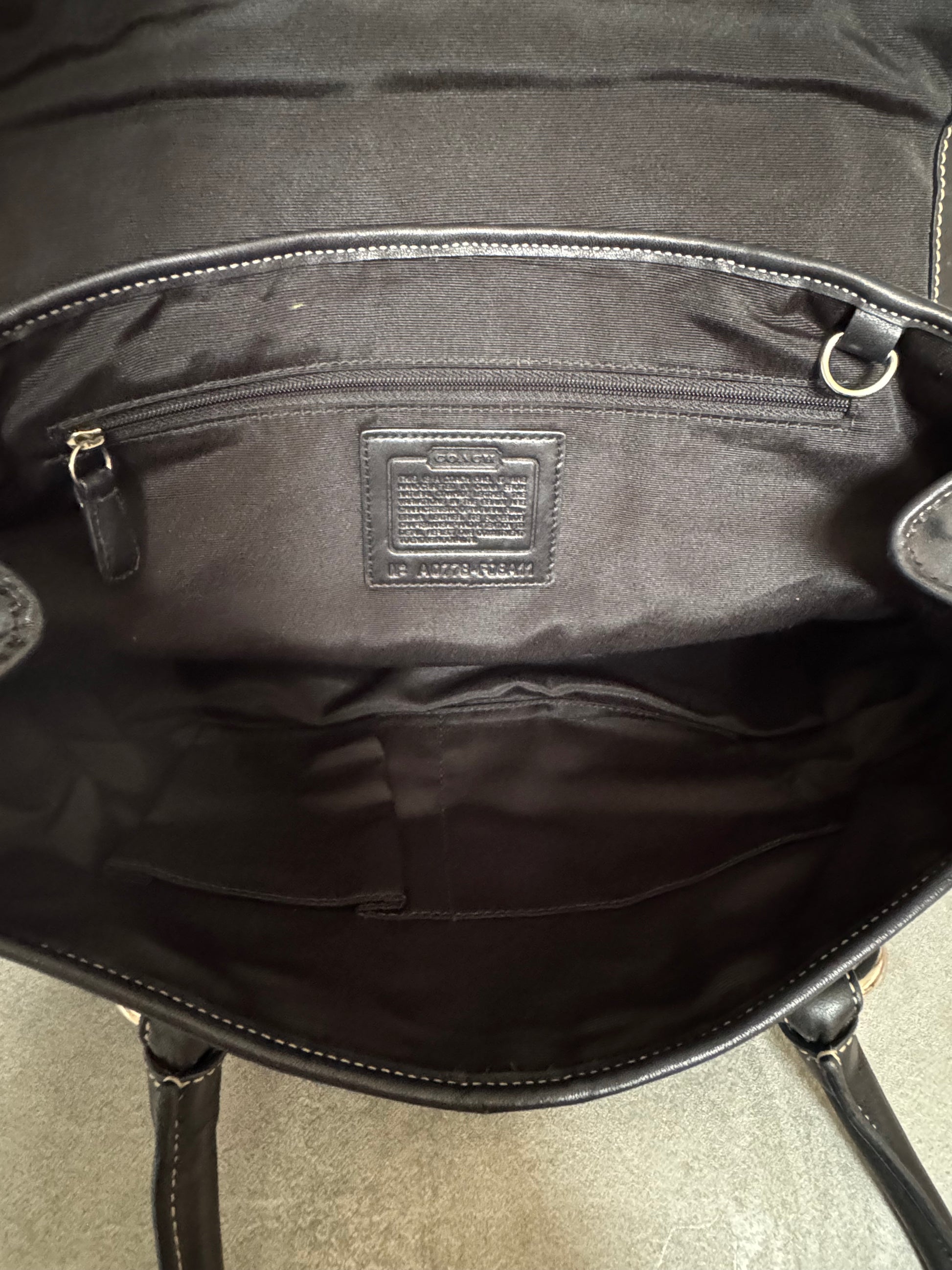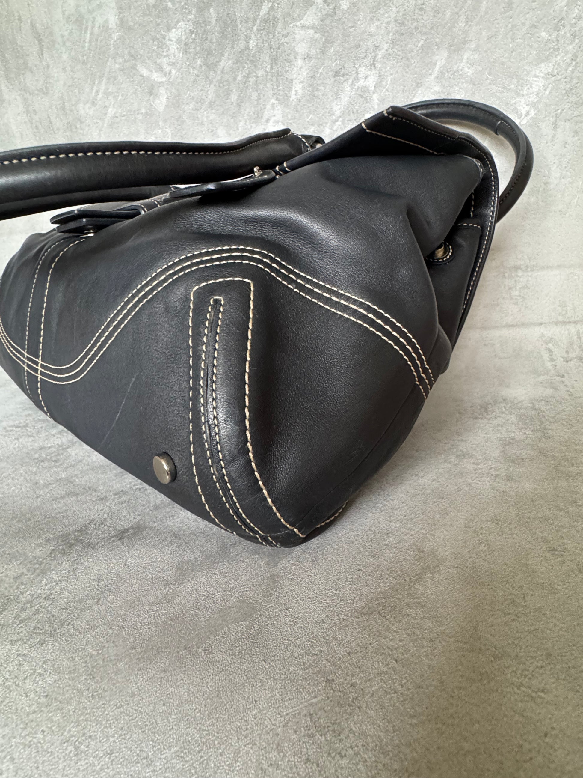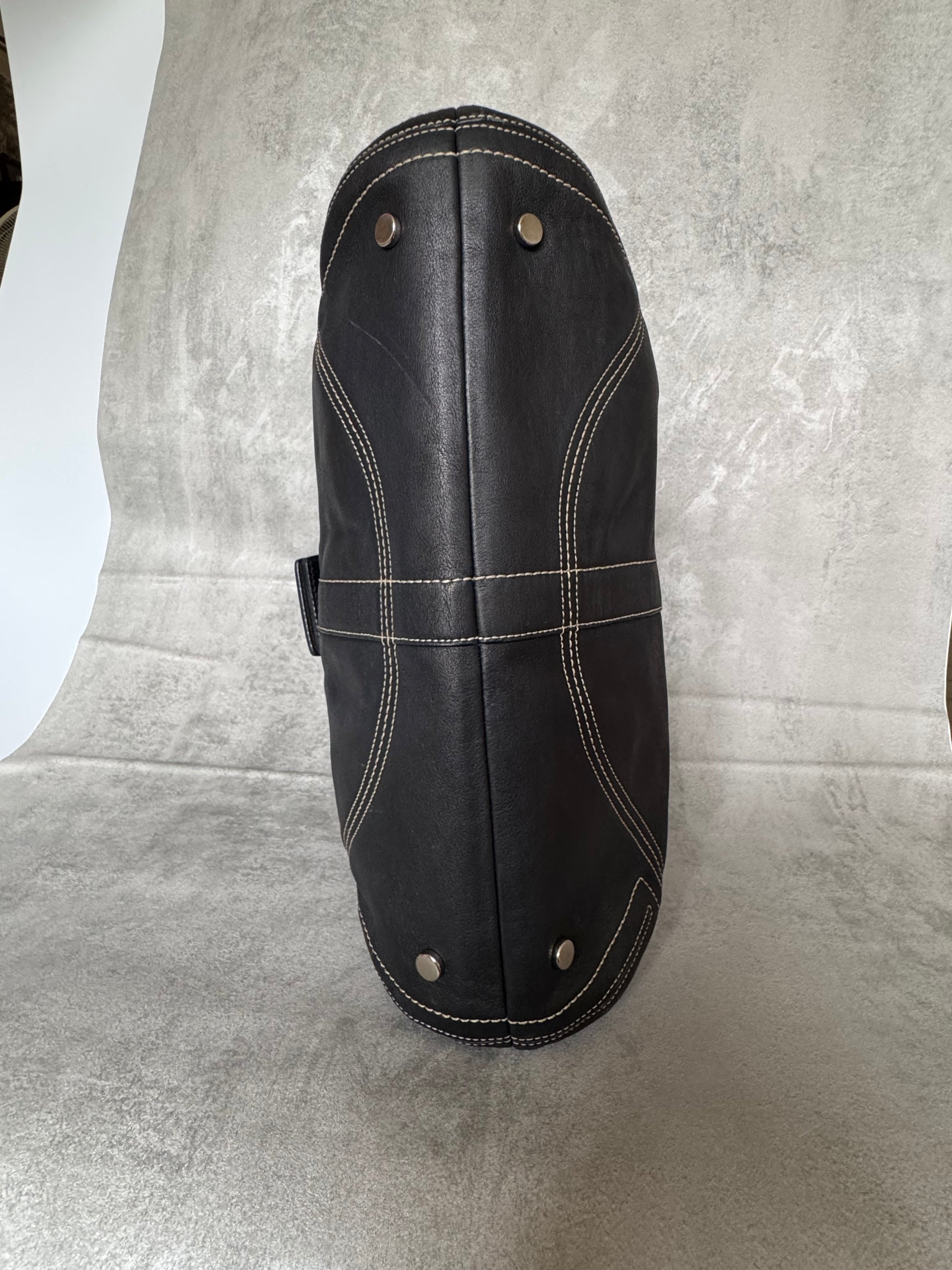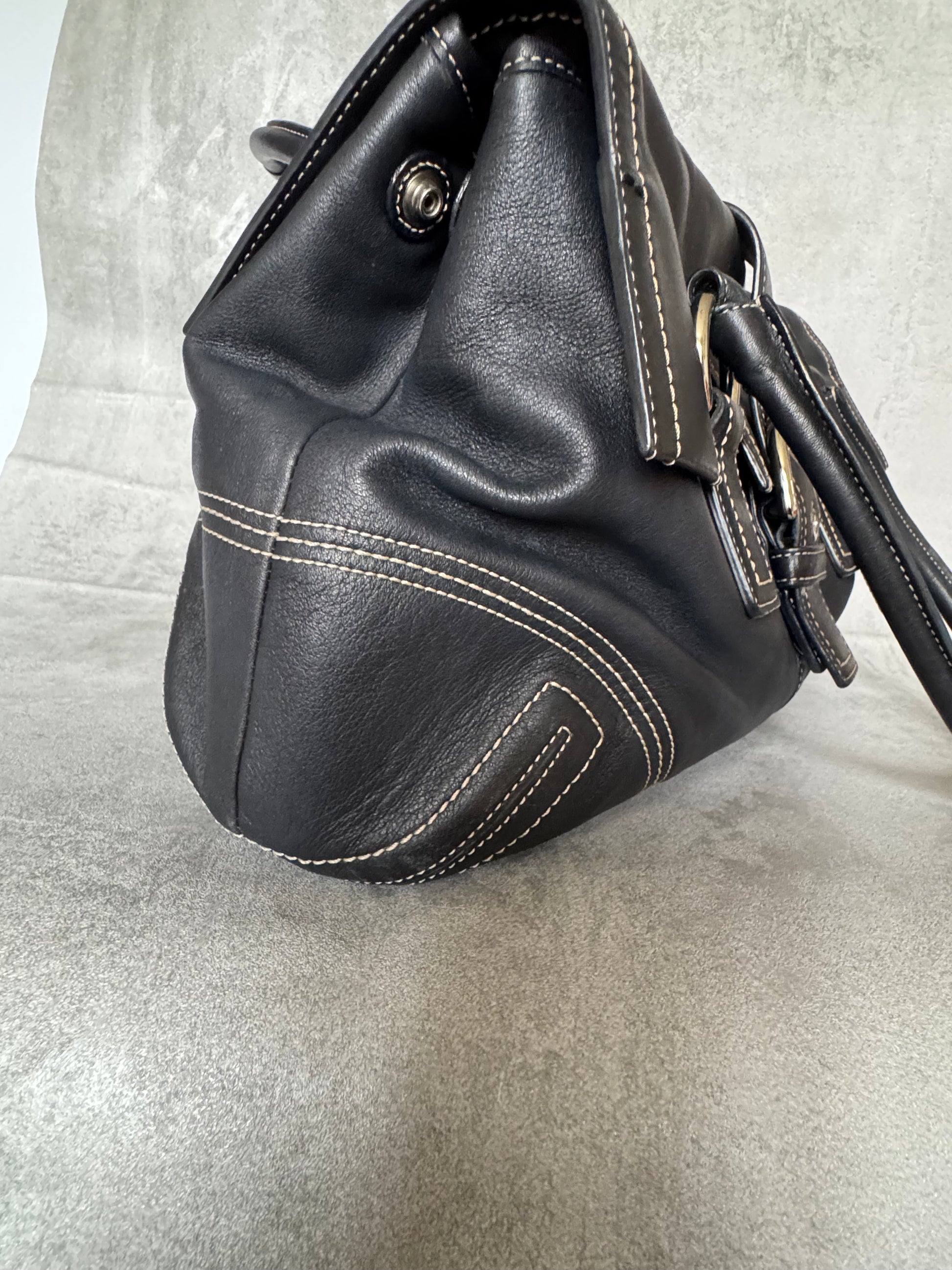 Supple black leather with bold contrast stitching and polished silver-tone hardware. Structured silhouette with dual top handles and a flap front detailed with oversized buckle straps — retro Coach character, everyday practical.