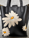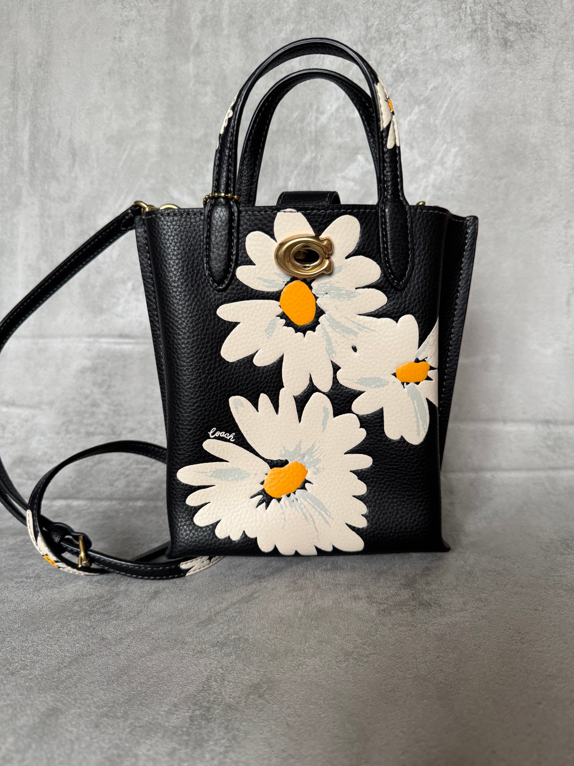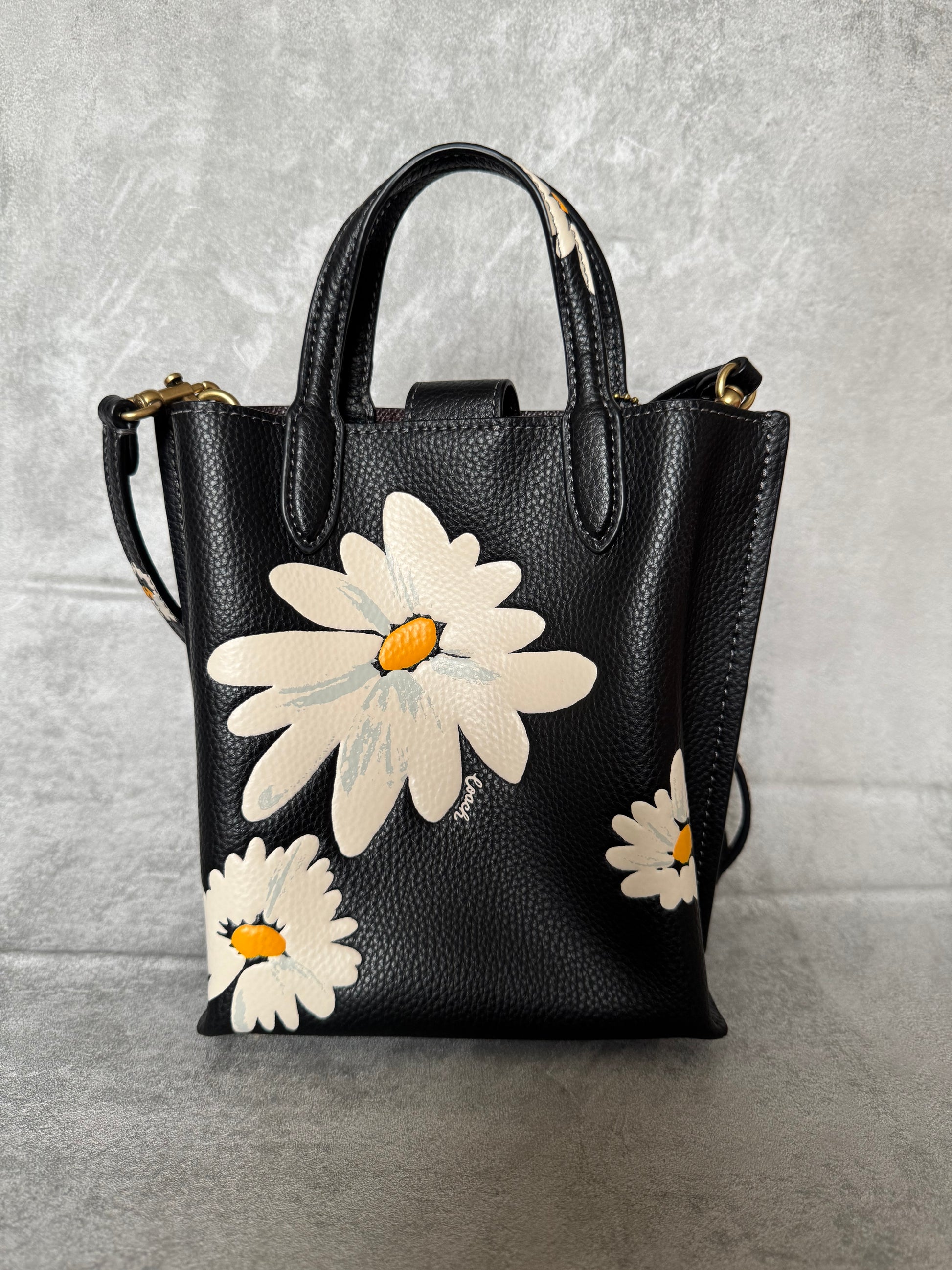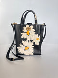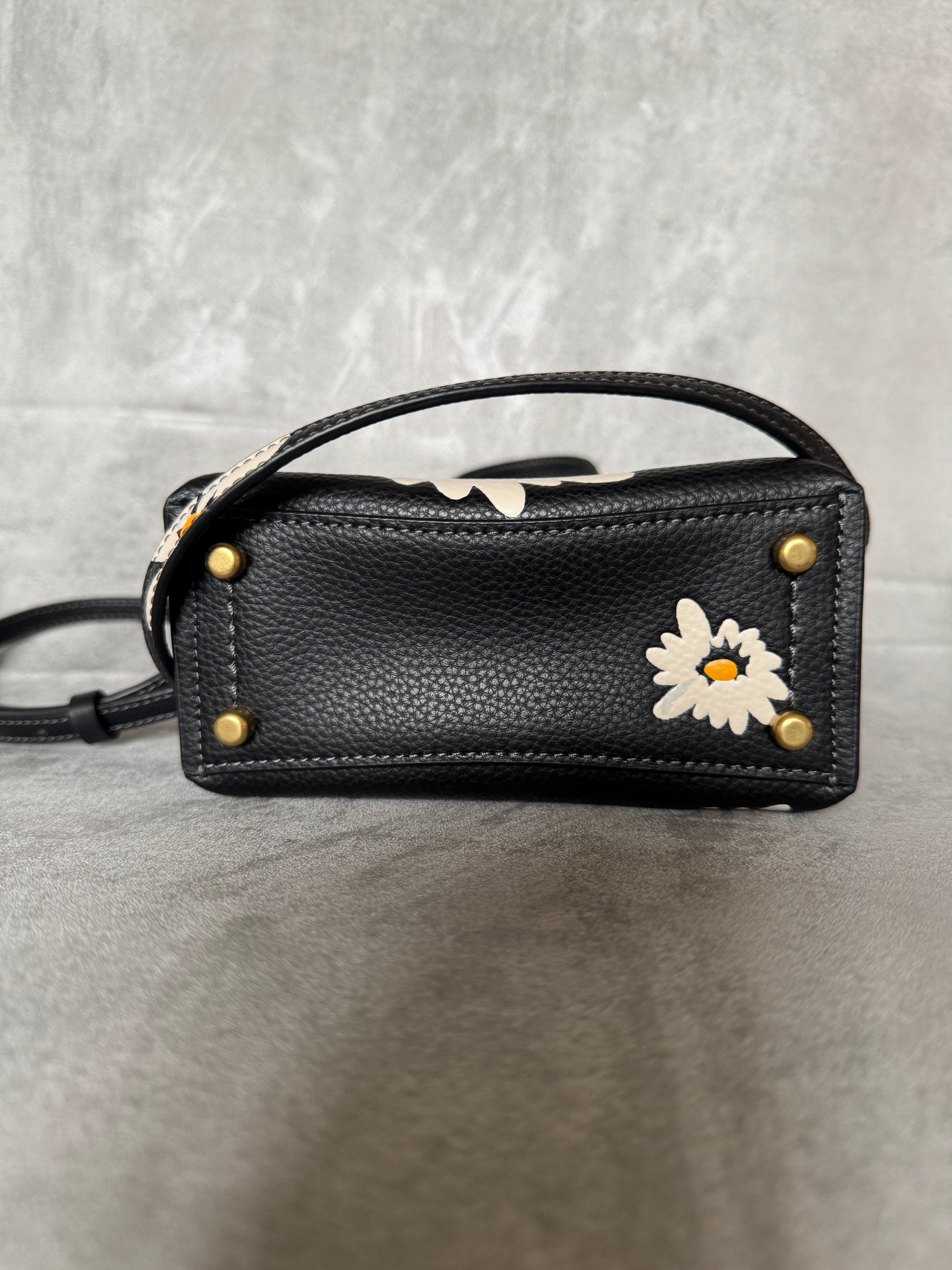 Black pebbled leather printed with oversized white daisies and vibrant yellow centres. A structured mini tote with dual top handles, detachable crossbody strap, and signature turnlock — playful, practical, and eye-catching.