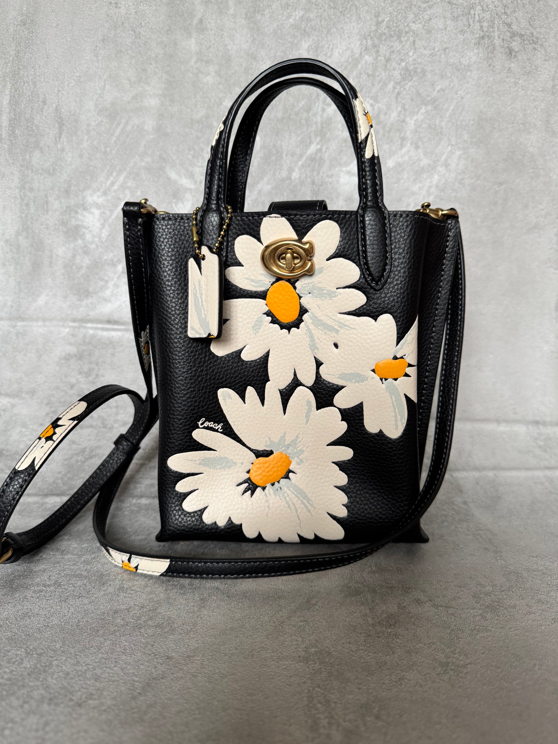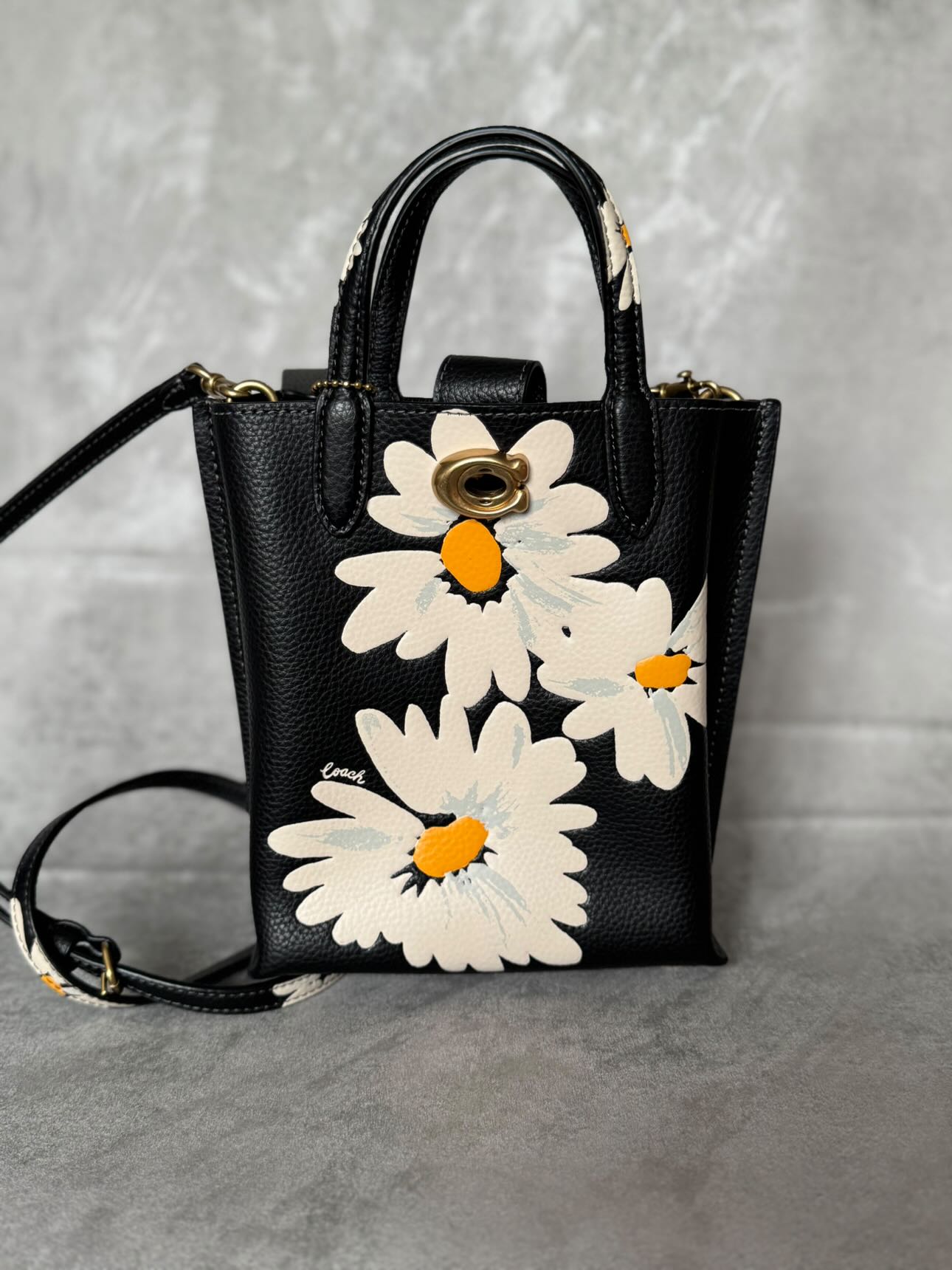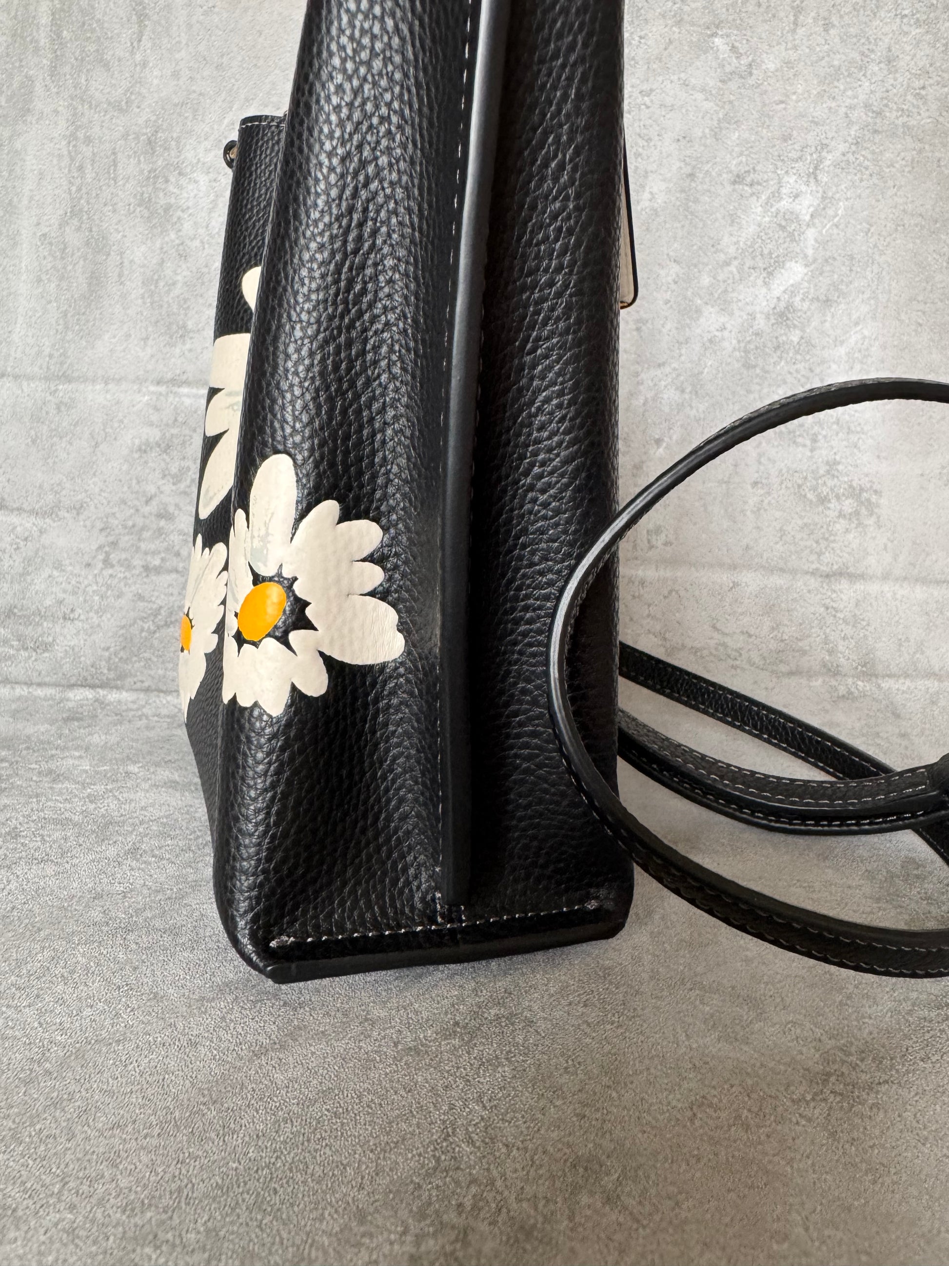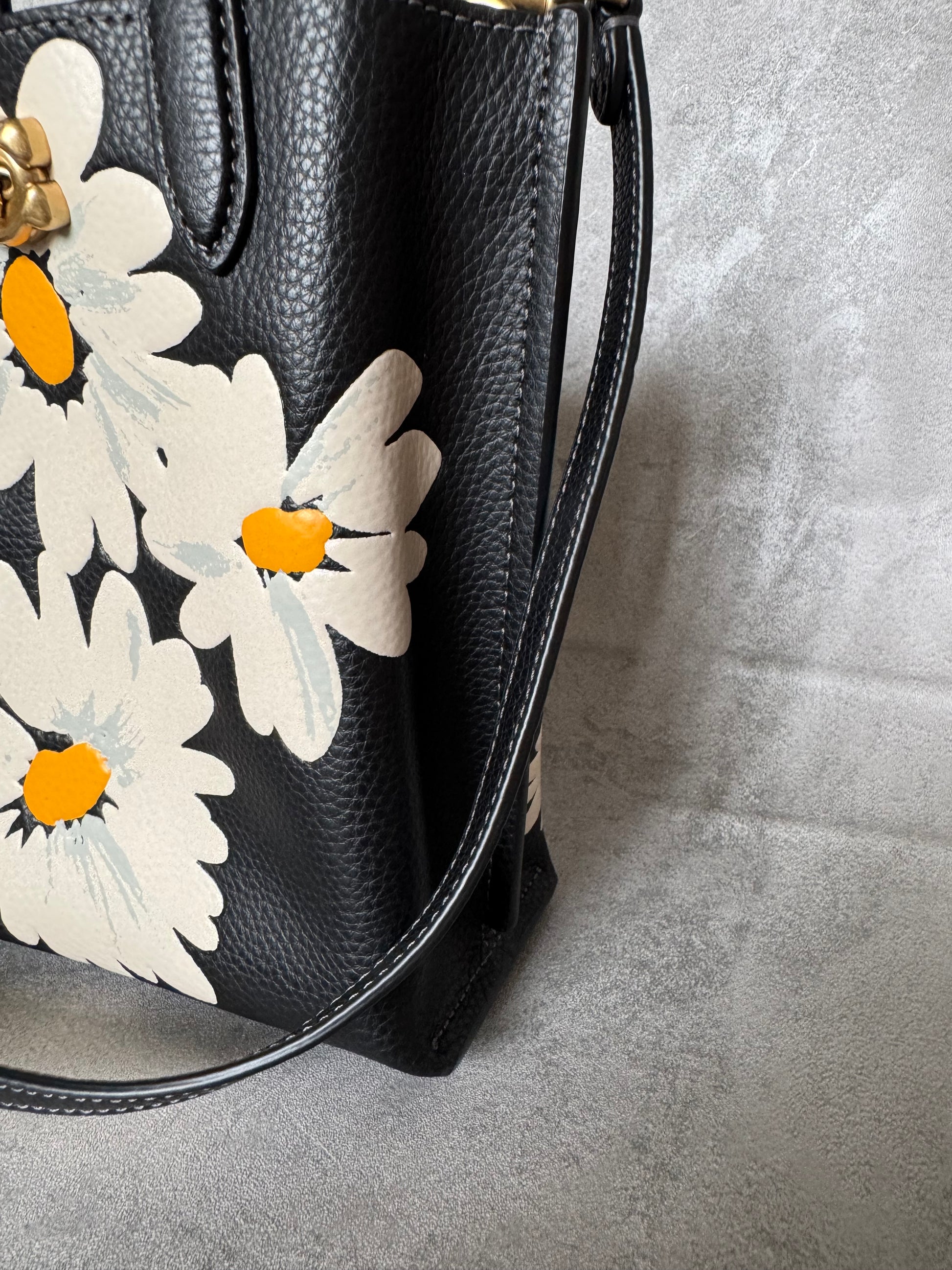 Black pebbled leather printed with oversized white daisies and vibrant yellow centres. A structured mini tote with dual top handles, detachable crossbody strap, and signature turnlock — playful, practical, and eye-catching.