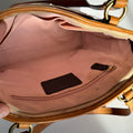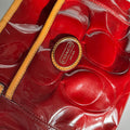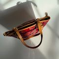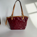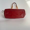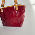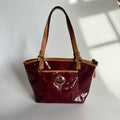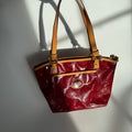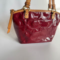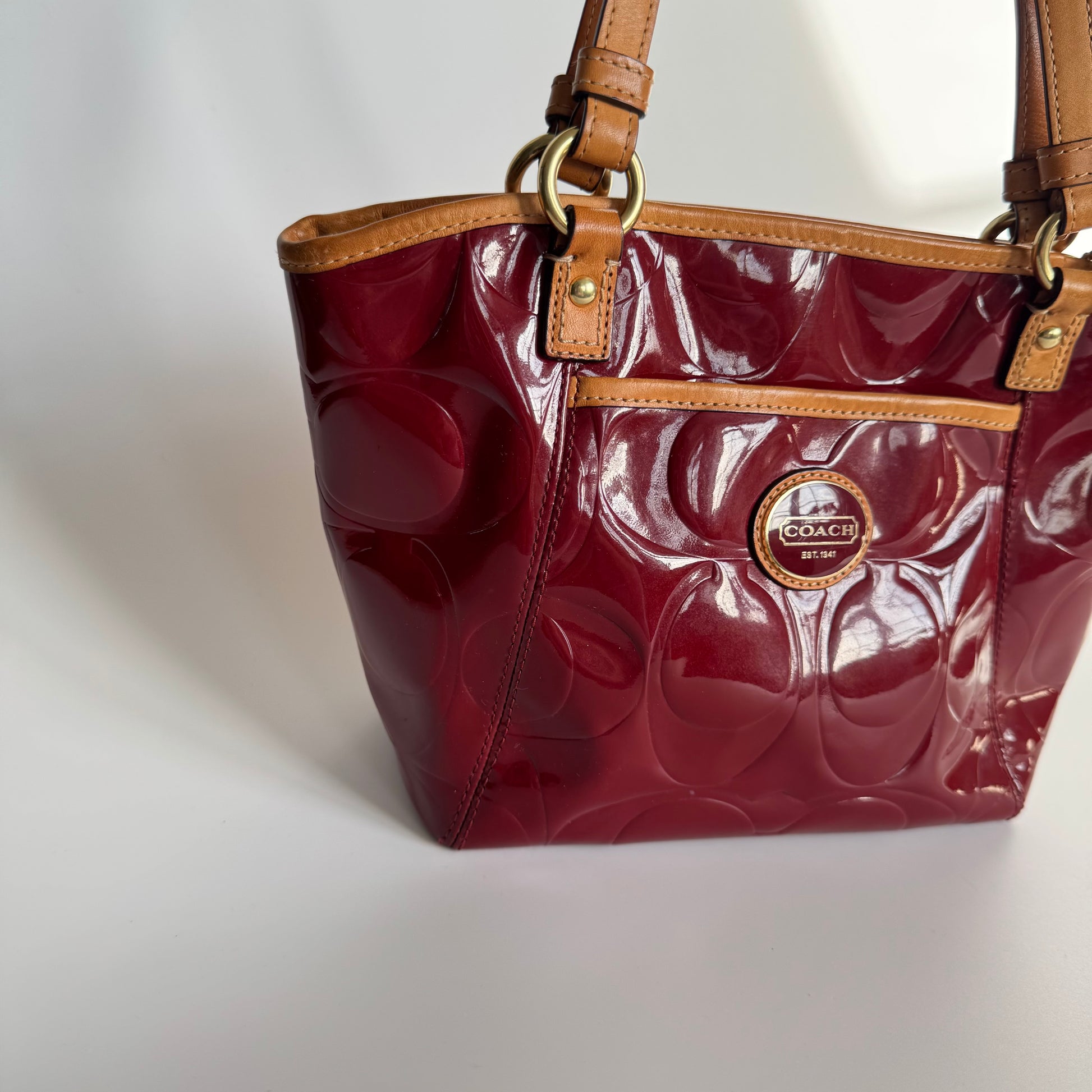 Glossy burgundy patent leather with tan leather trim and gold-tone hardware