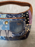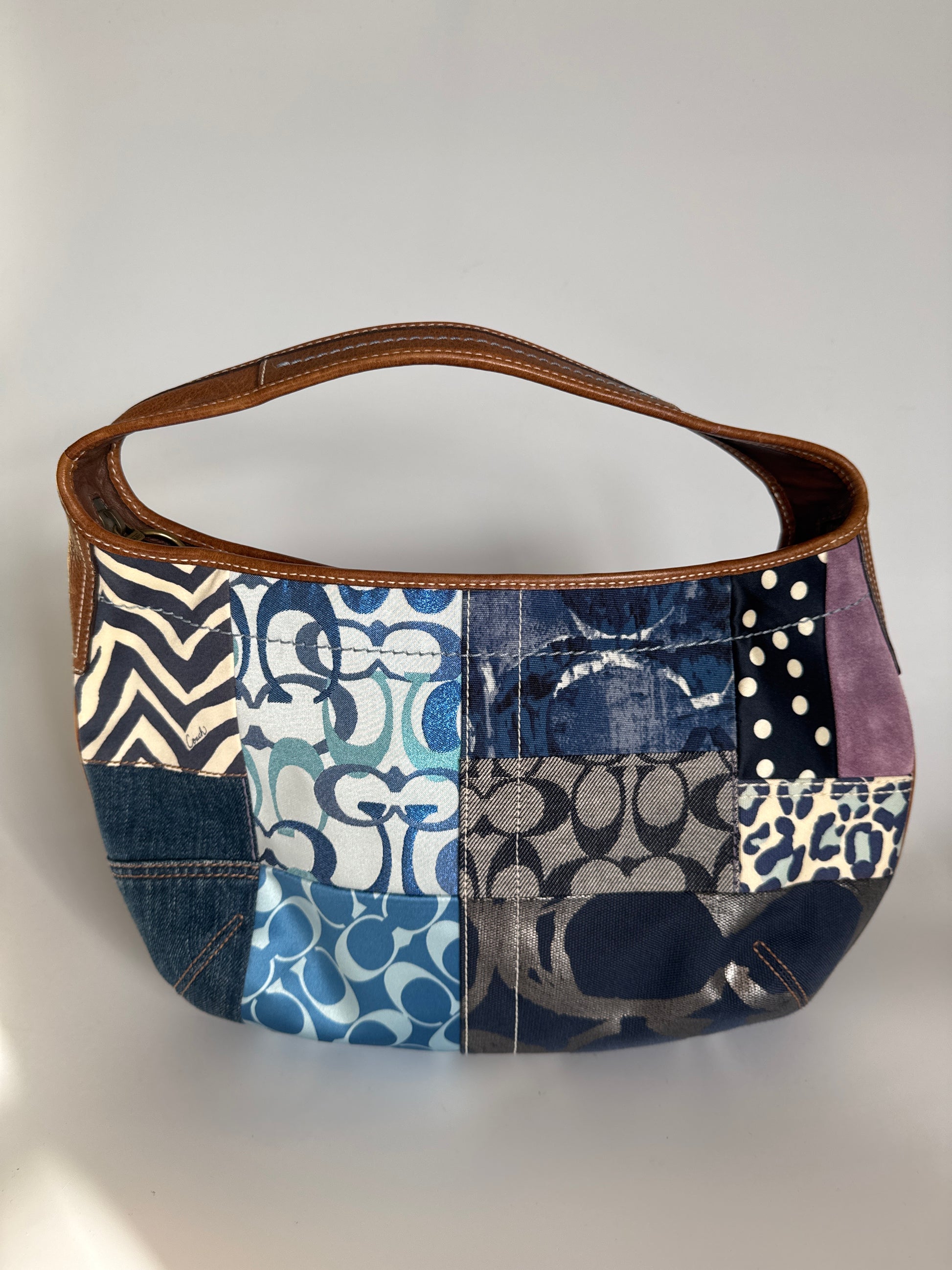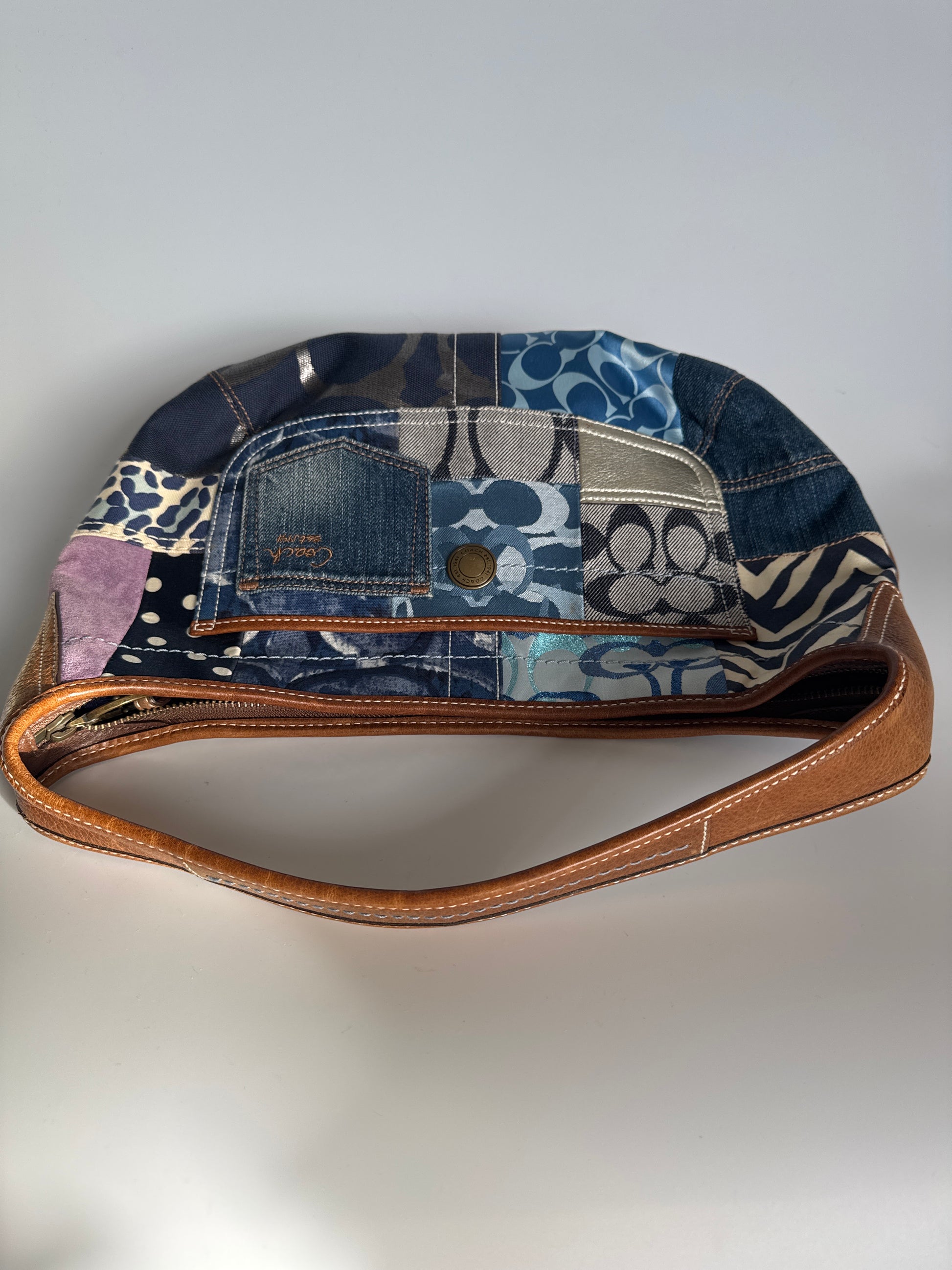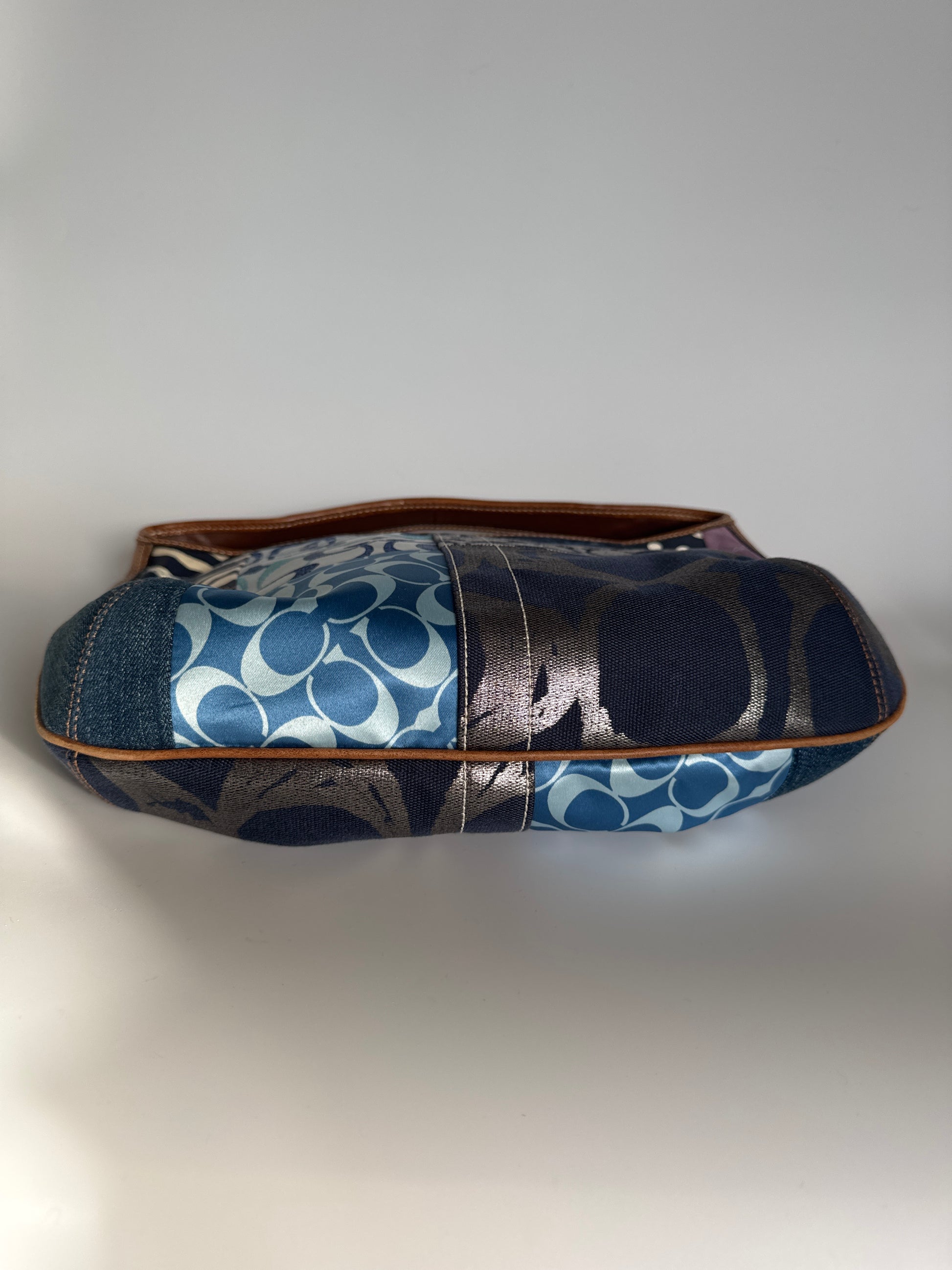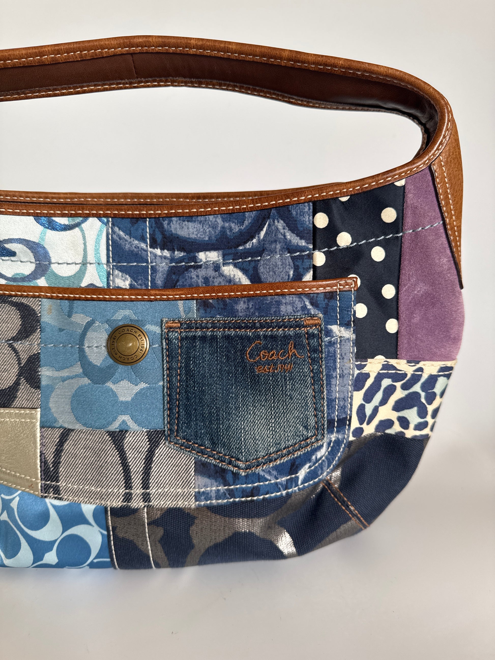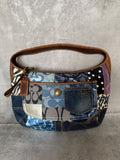 Eclectic mix of denim, jacquard, suede and leather in blues and neutrals, accented with tan leather trim. Hobo silhouette with a playful front denim pocket — iconic Y2K Coach energy, wearable and collectible.