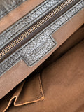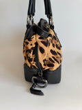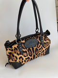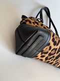 Details: Bold leopard print canvas, dual shoulder straps, leather trim, structured silhouette, top zip closure, spacious interior, includes dust bag