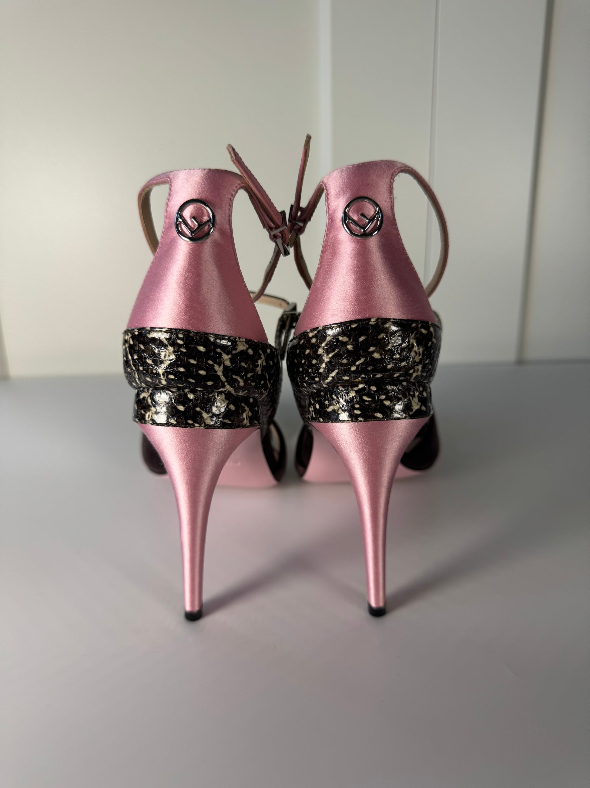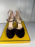 Striking Fendi ankle strap sandals crafted from a mix of soft velvet and embossed leather in a refined multicolour palette. Designed with an elegant high heel, slim ankle strap with buckle closure and silver-tone hardware, these heels balance statement style with timeless sophistication.