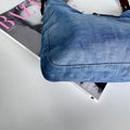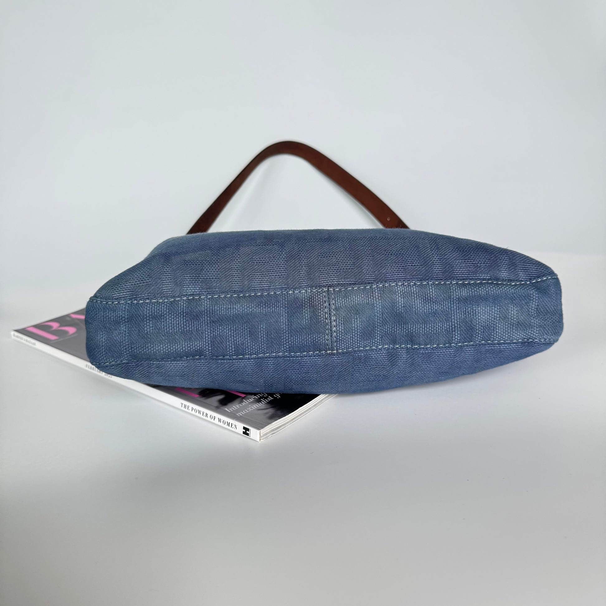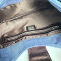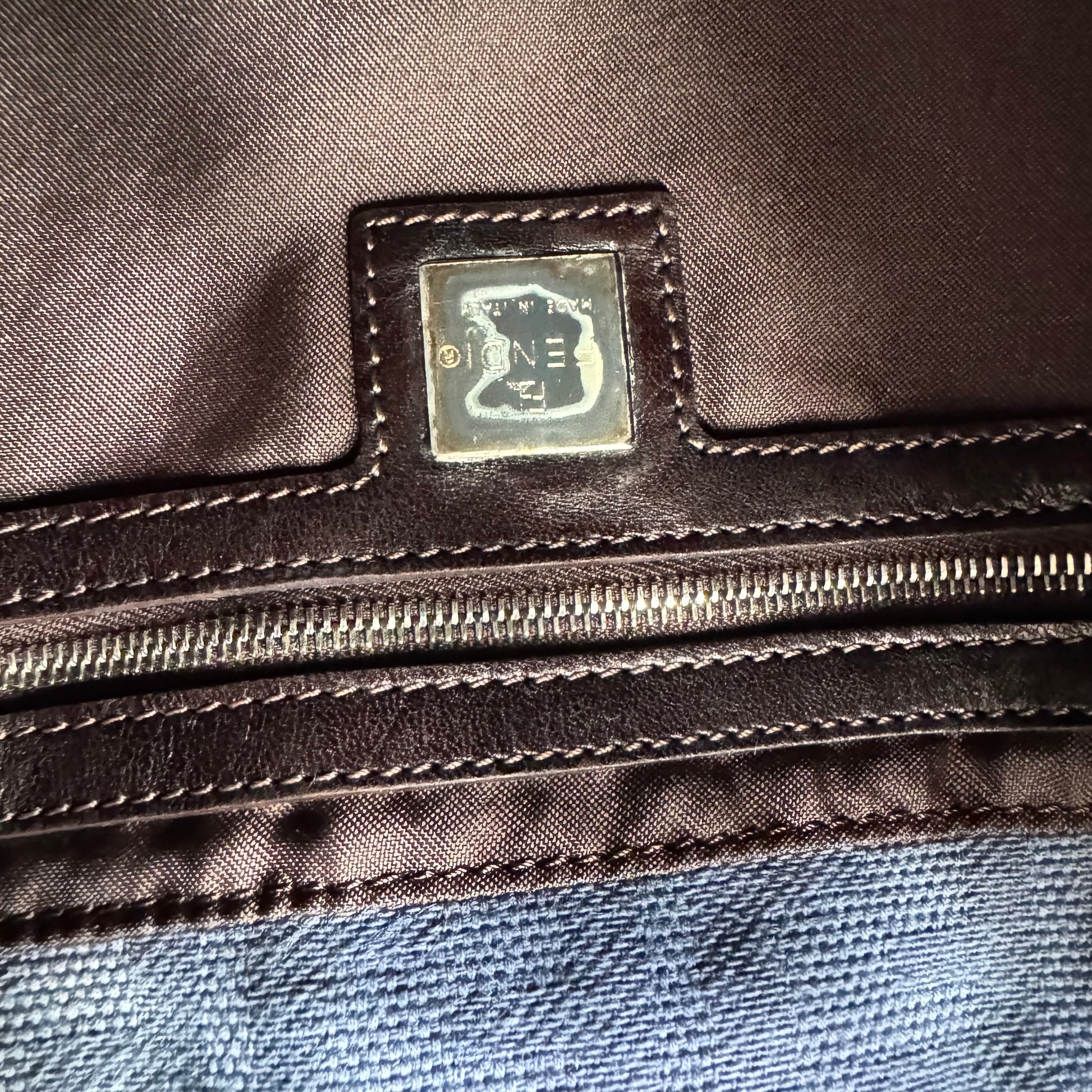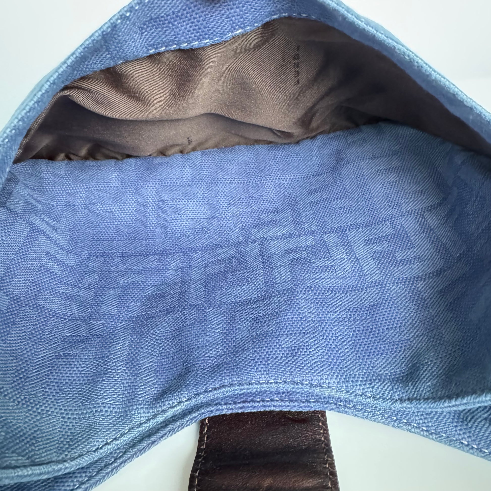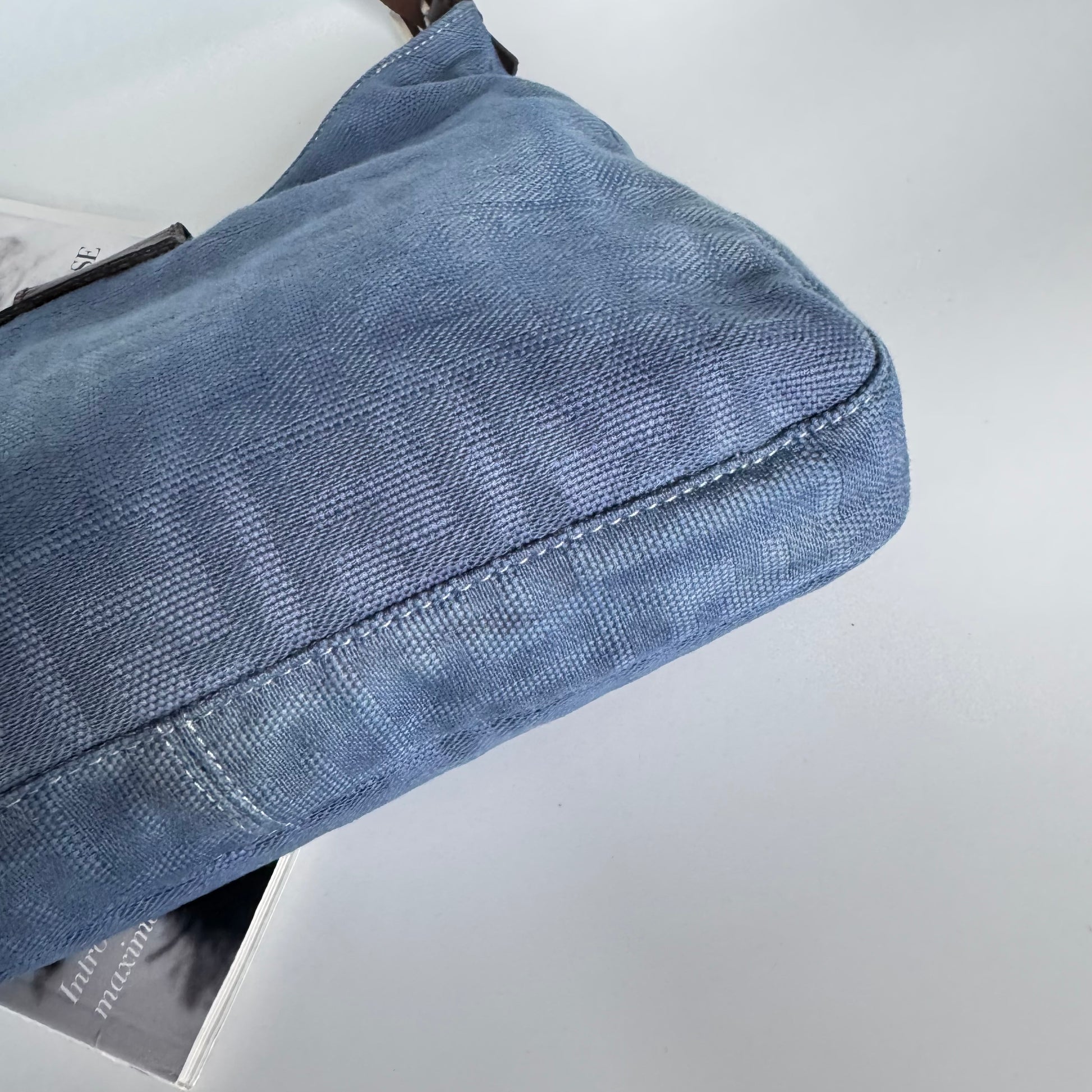 Crafted in soft blue denim with dark brown leather trim, this authentic Fendi Baguette bag reimagines the house’s iconic silhouette in a relaxed, Y2K-inspired form. The signature FF buckle in silver-tone hardware completes the look with a polished edge, while the single shoulder strap offers effortless everyday wear.