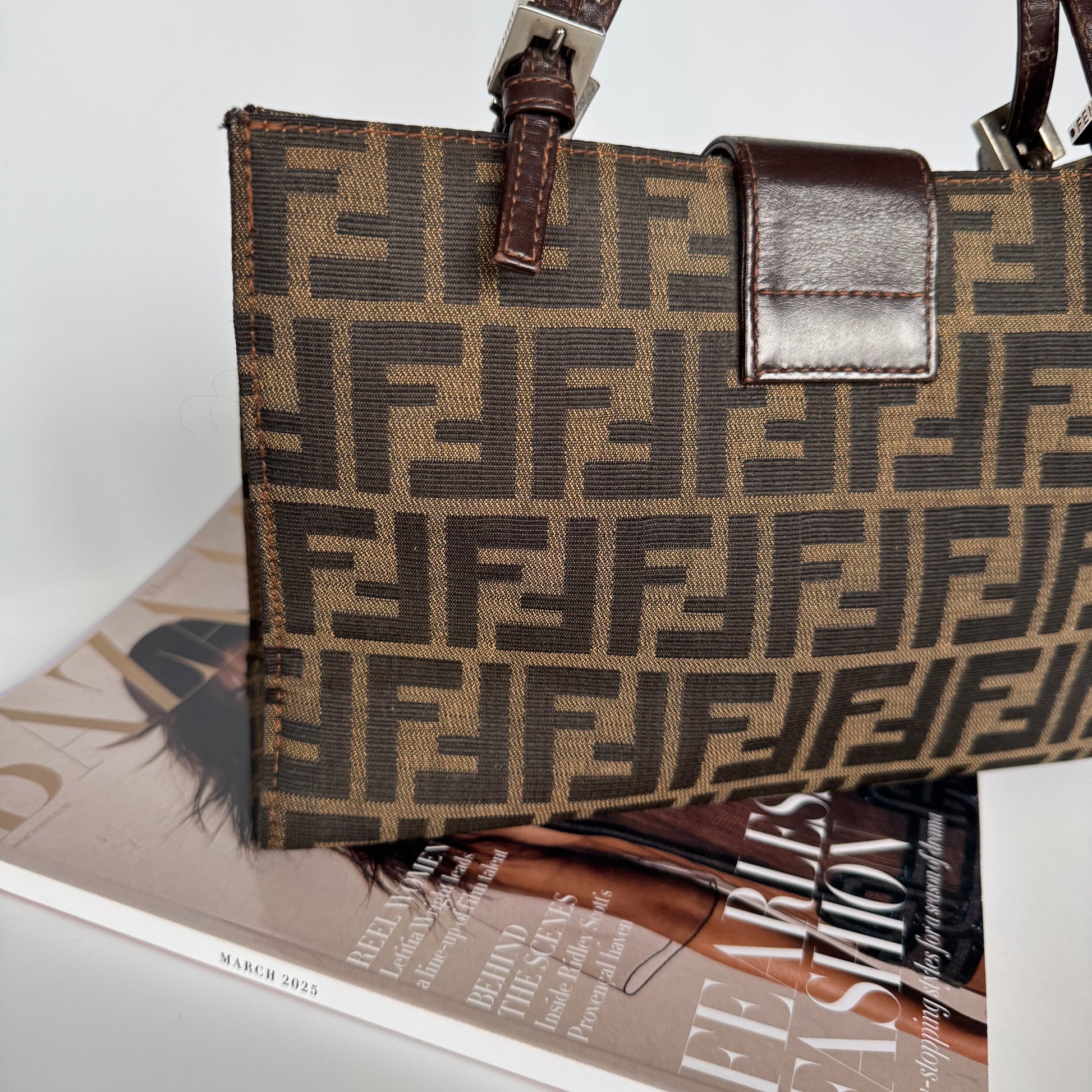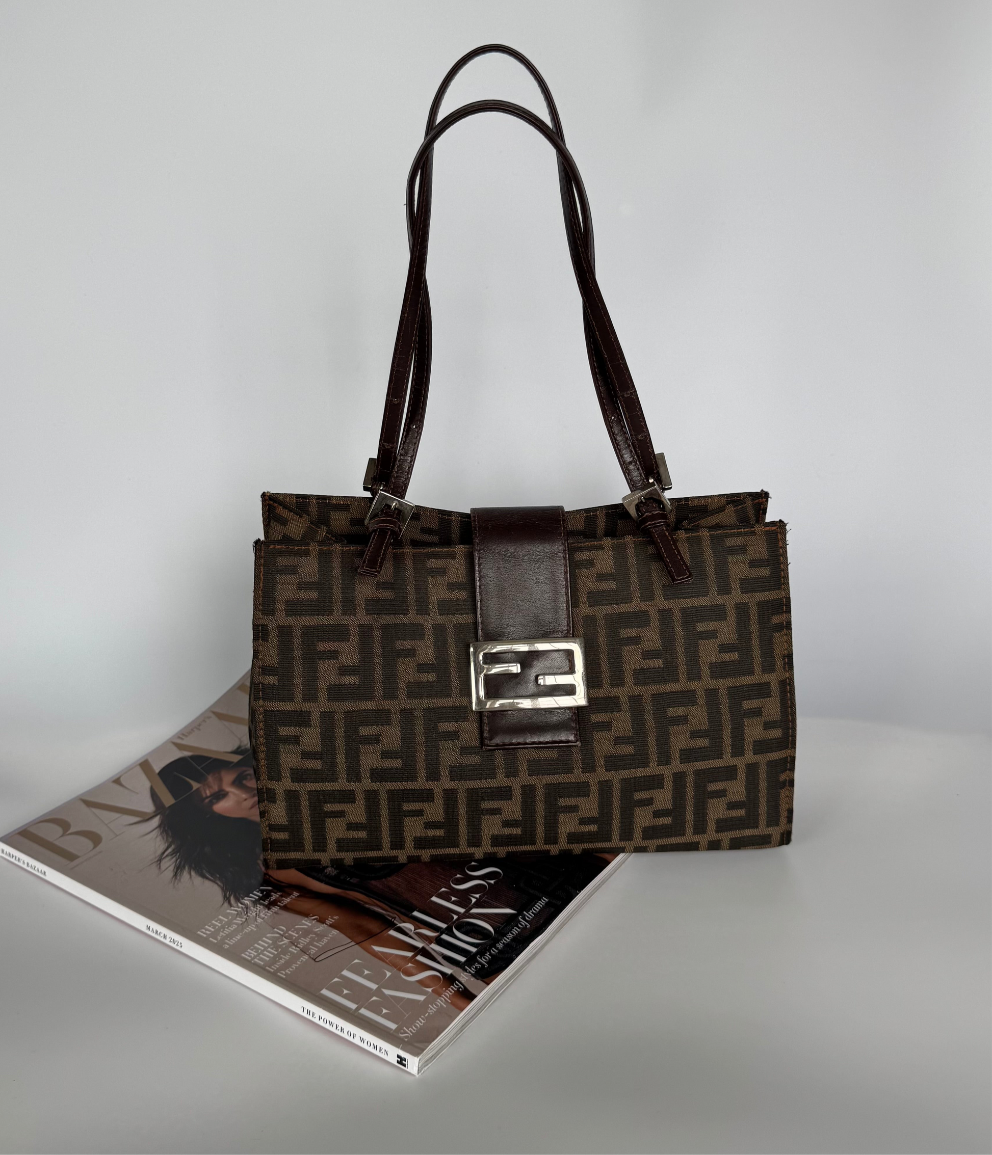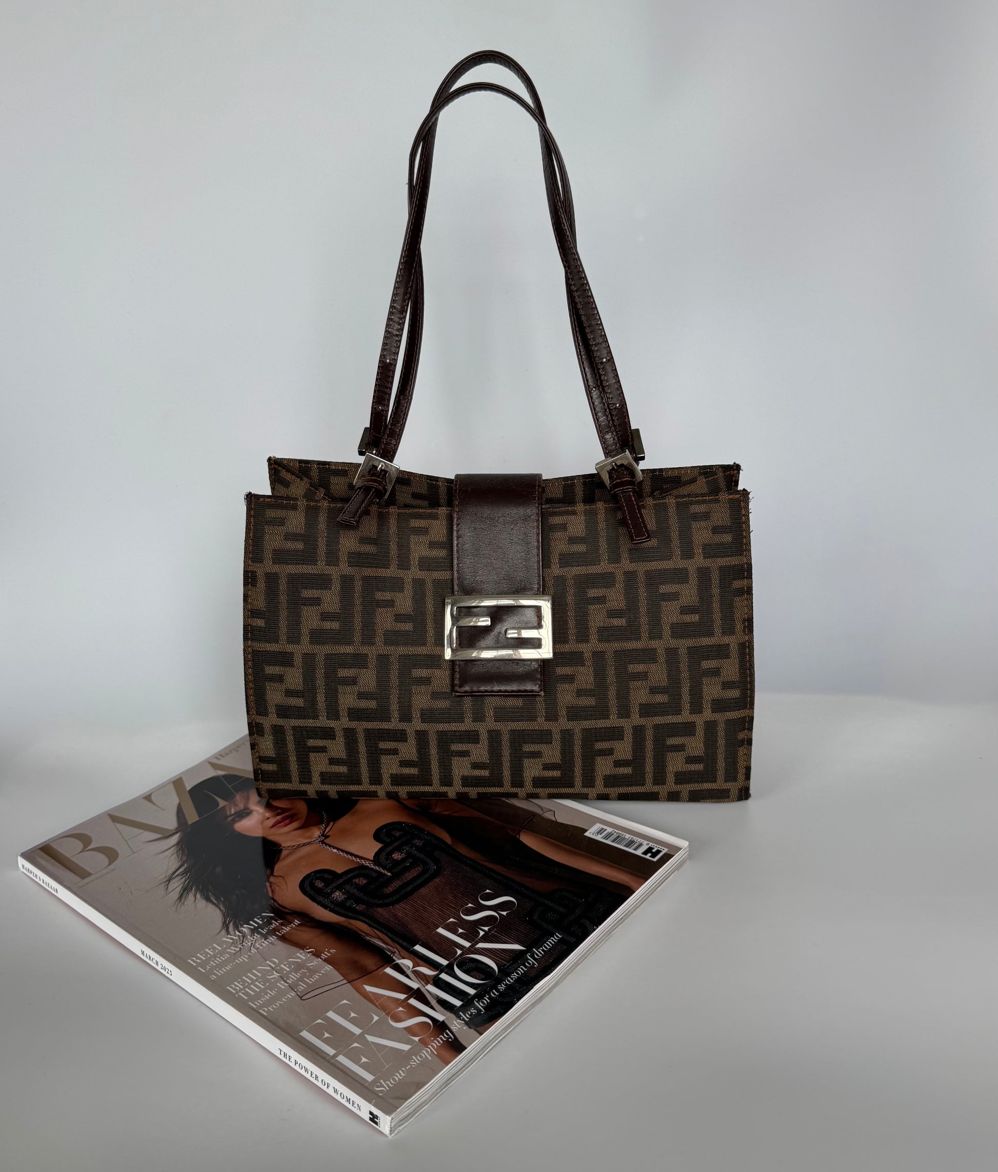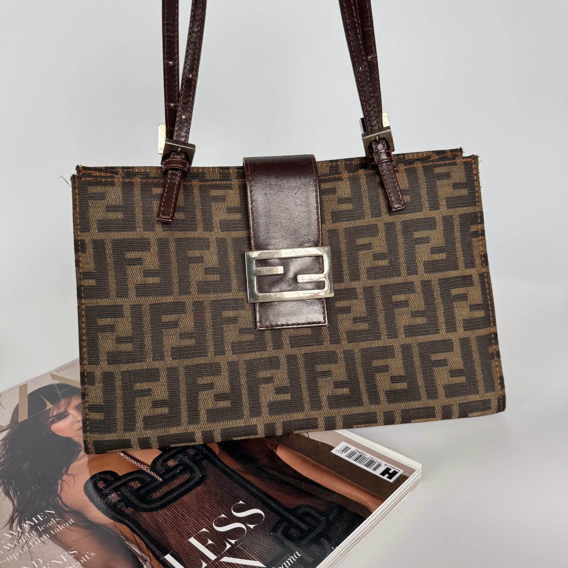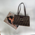 Crafted in Fendi’s signature brown Zucca monogram canvas, this authentic Fendi Baguette tote captures the refined charm of early 2000s Italian design. The structured silhouette is accented with dark brown leather trim, slim double handles, and the iconic FF buckle clasp — a timeless symbol of the brand’s heritage.