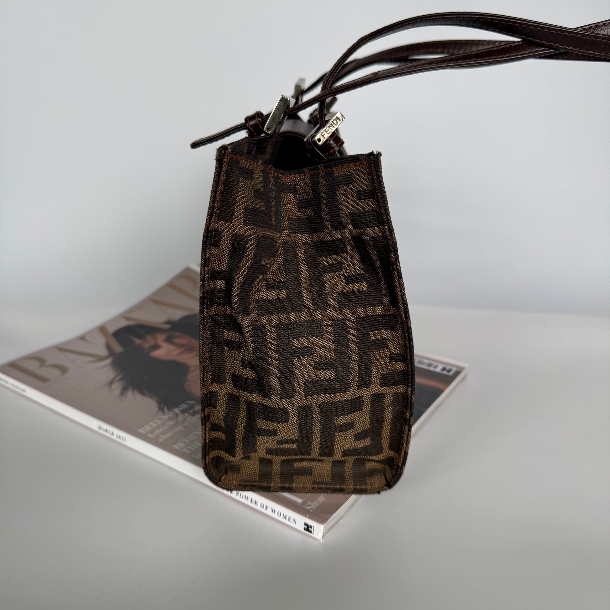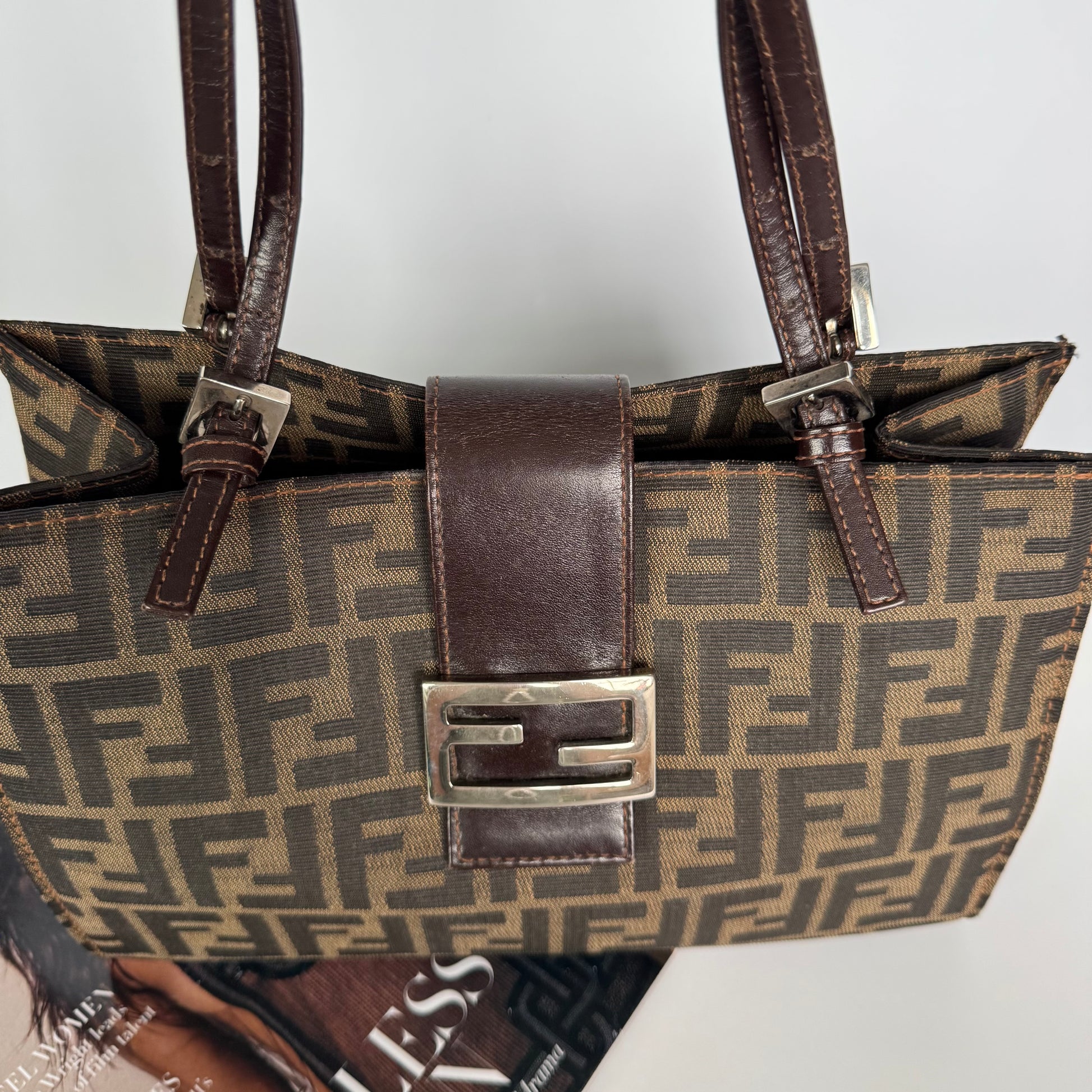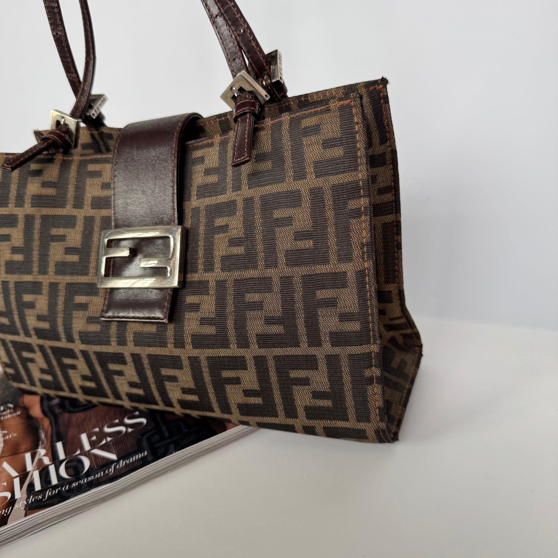 Crafted in Fendi’s signature brown Zucca monogram canvas, this authentic Fendi Baguette tote captures the refined charm of early 2000s Italian design. The structured silhouette is accented with dark brown leather trim, slim double handles, and the iconic FF buckle clasp — a timeless symbol of the brand’s heritage.