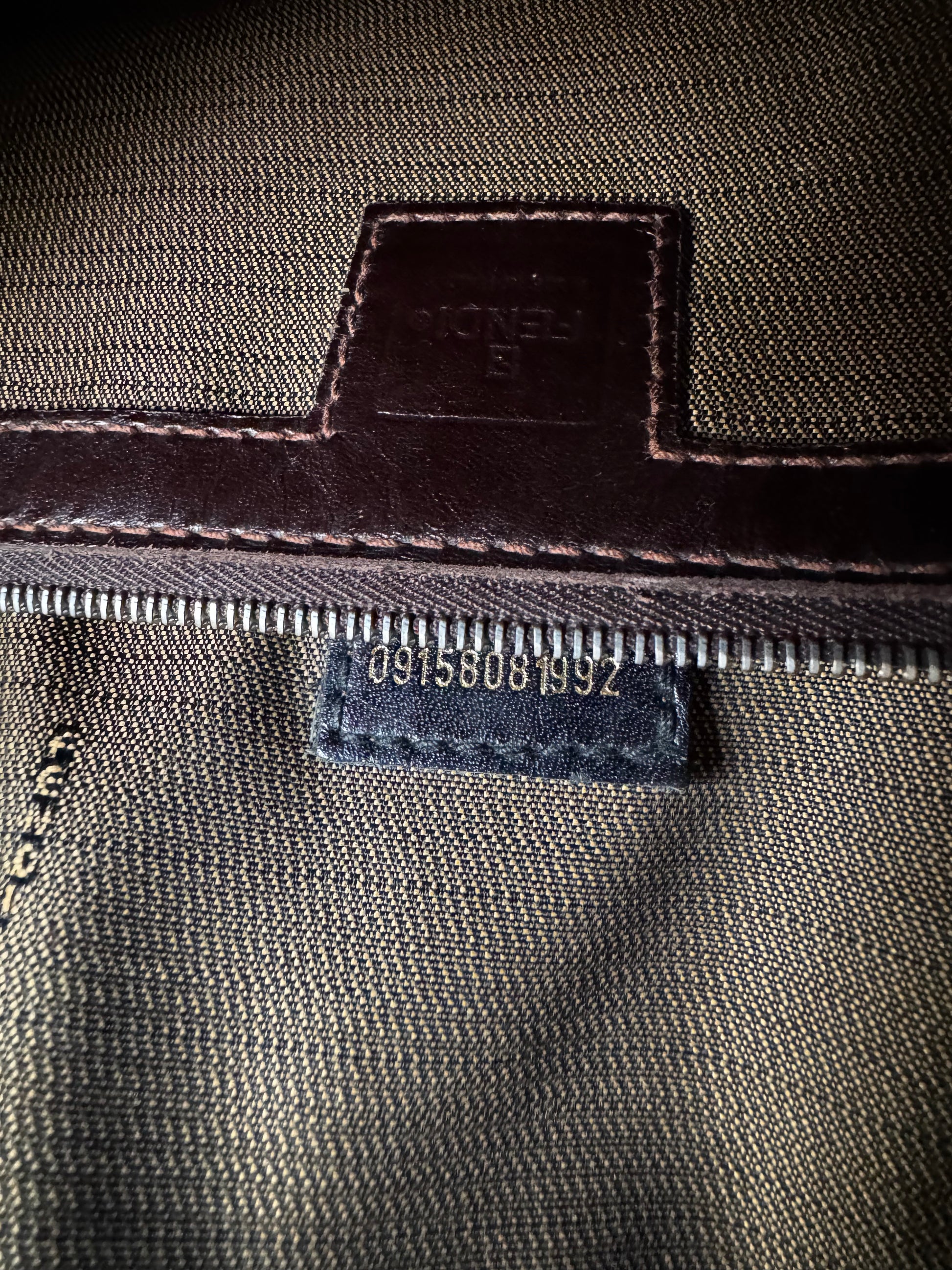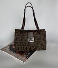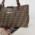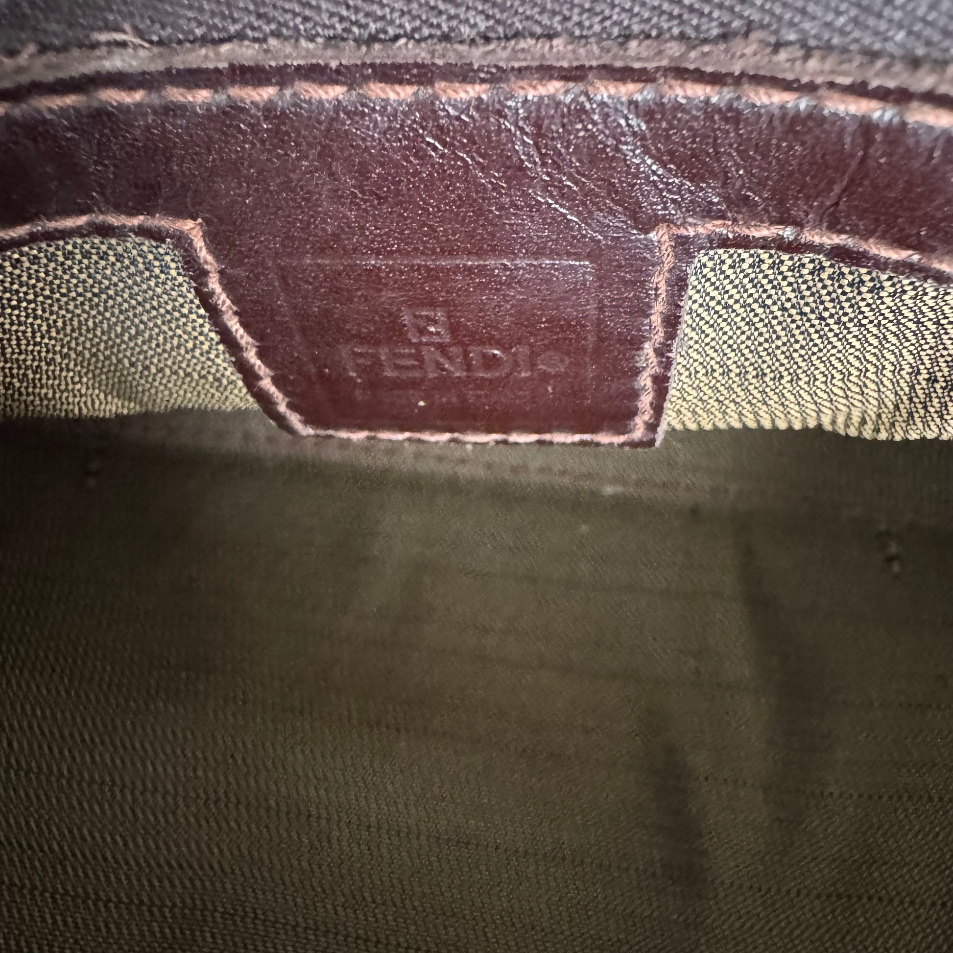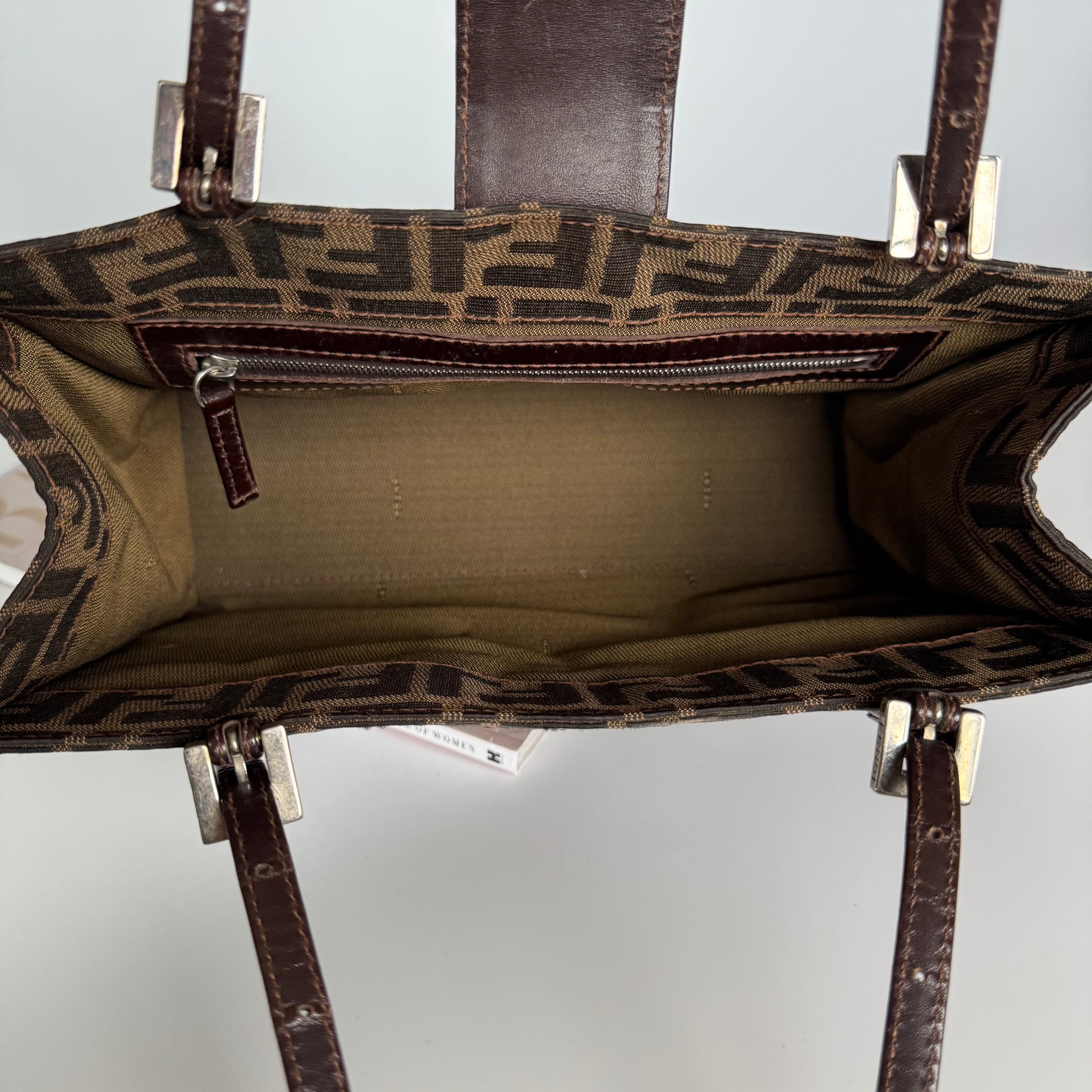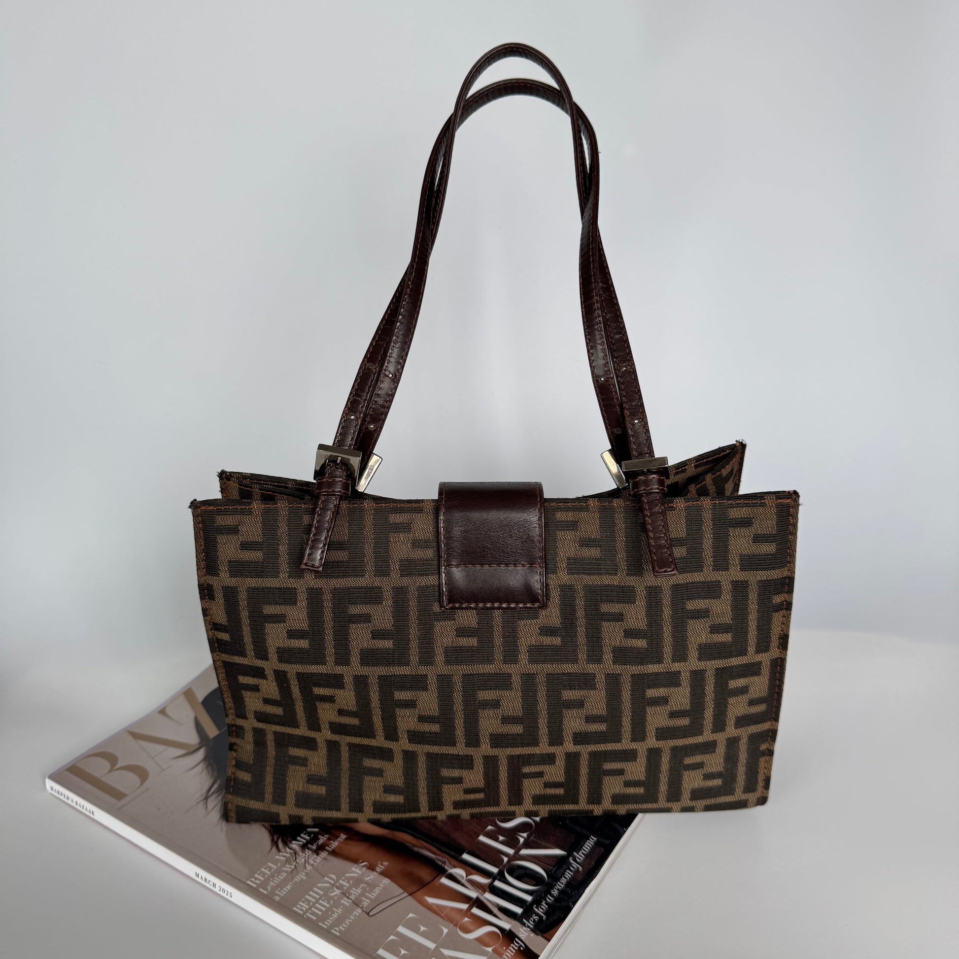 Crafted in Fendi’s signature brown Zucca monogram canvas, this authentic Fendi Baguette tote captures the refined charm of early 2000s Italian design. The structured silhouette is accented with dark brown leather trim, slim double handles, and the iconic FF buckle clasp — a timeless symbol of the brand’s heritage.