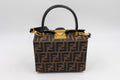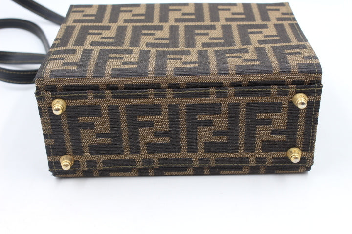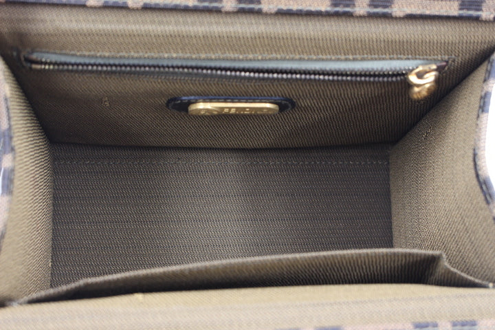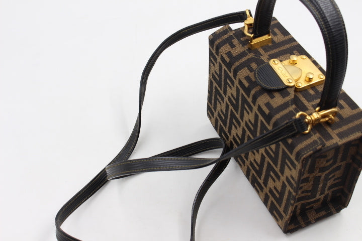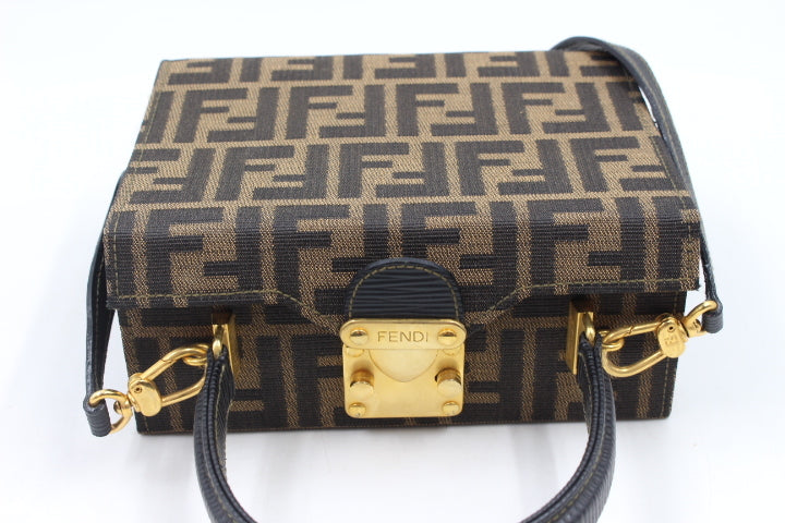 This rare and authentic vintage Fendi bag is a true collector’s piece. Crafted in the iconic FF Zucca monogram canvas, it features a structured box silhouette with a luxurious gold-tone trunk lock closure.