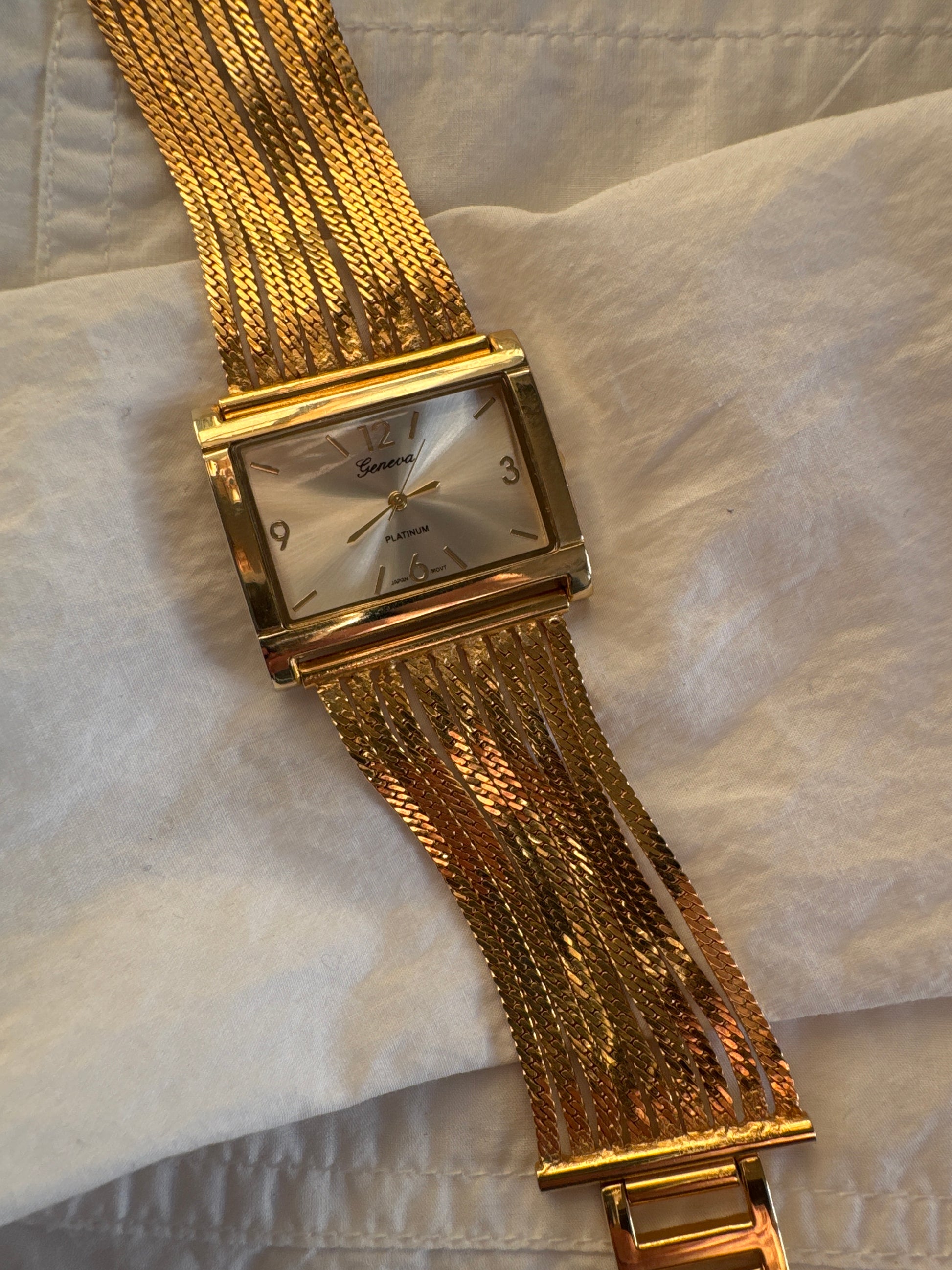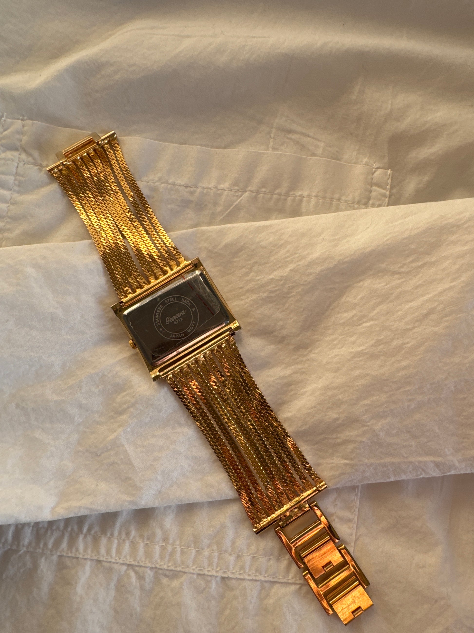 A beautiful Geneva bracelet watch with a flowing gold mesh band and a sleek rectangular dial — feminine, elegant and perfectly vintage-inspired. The soft wave of the mesh links gives it a jewellery-like feel, making it a timeless piece for everyday chic.