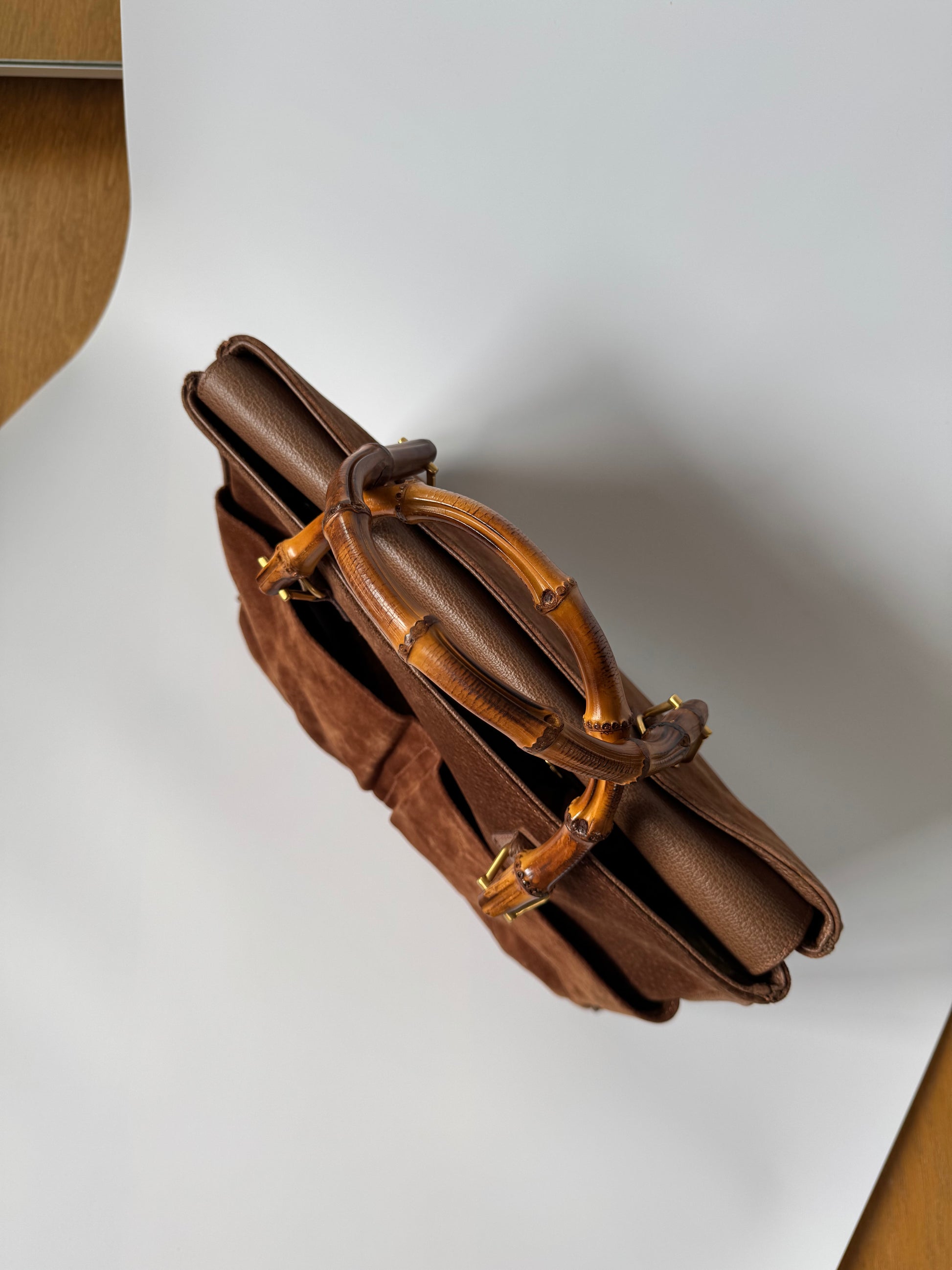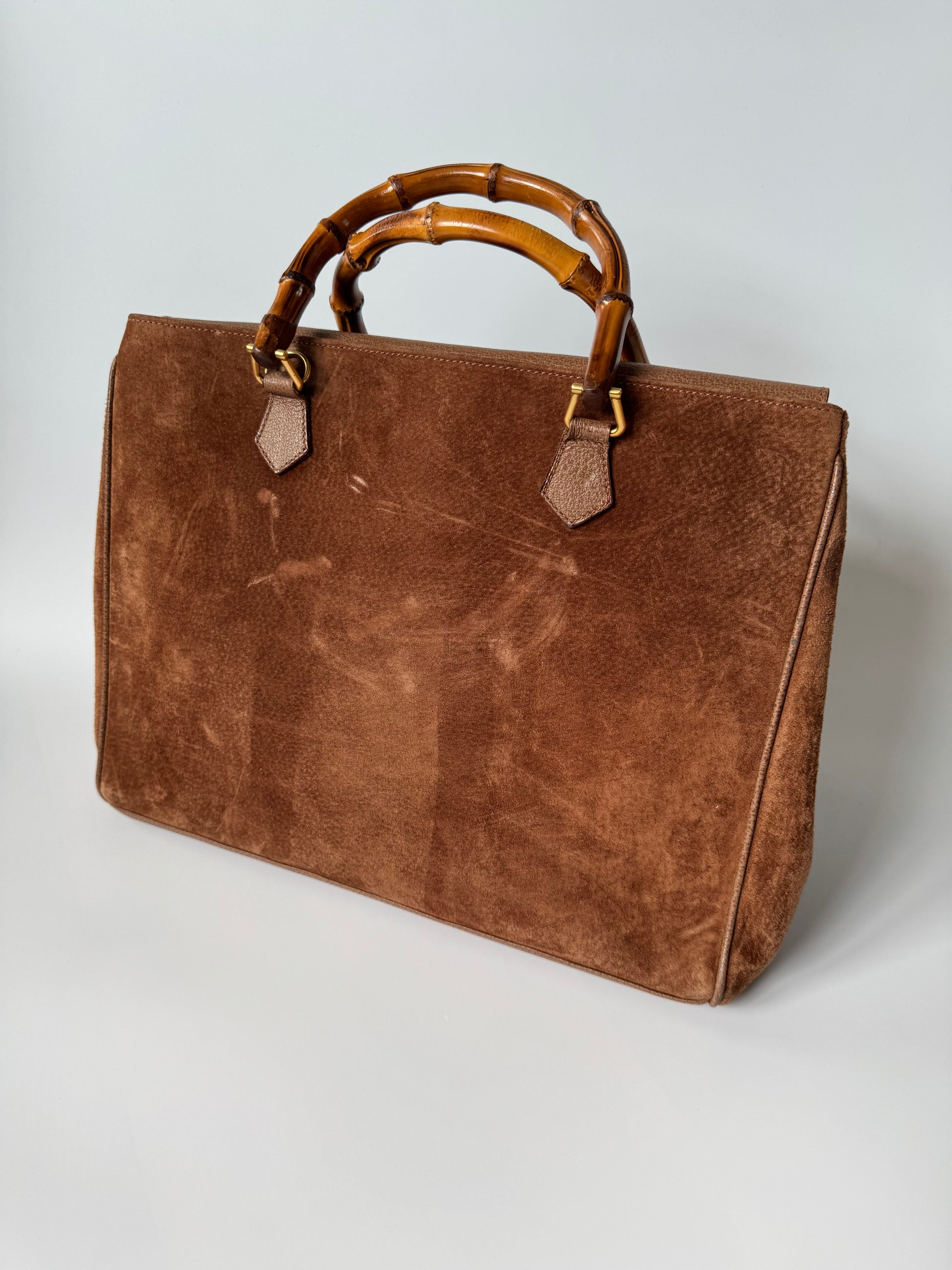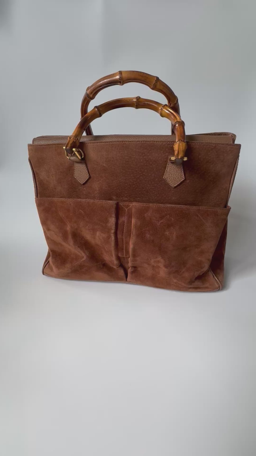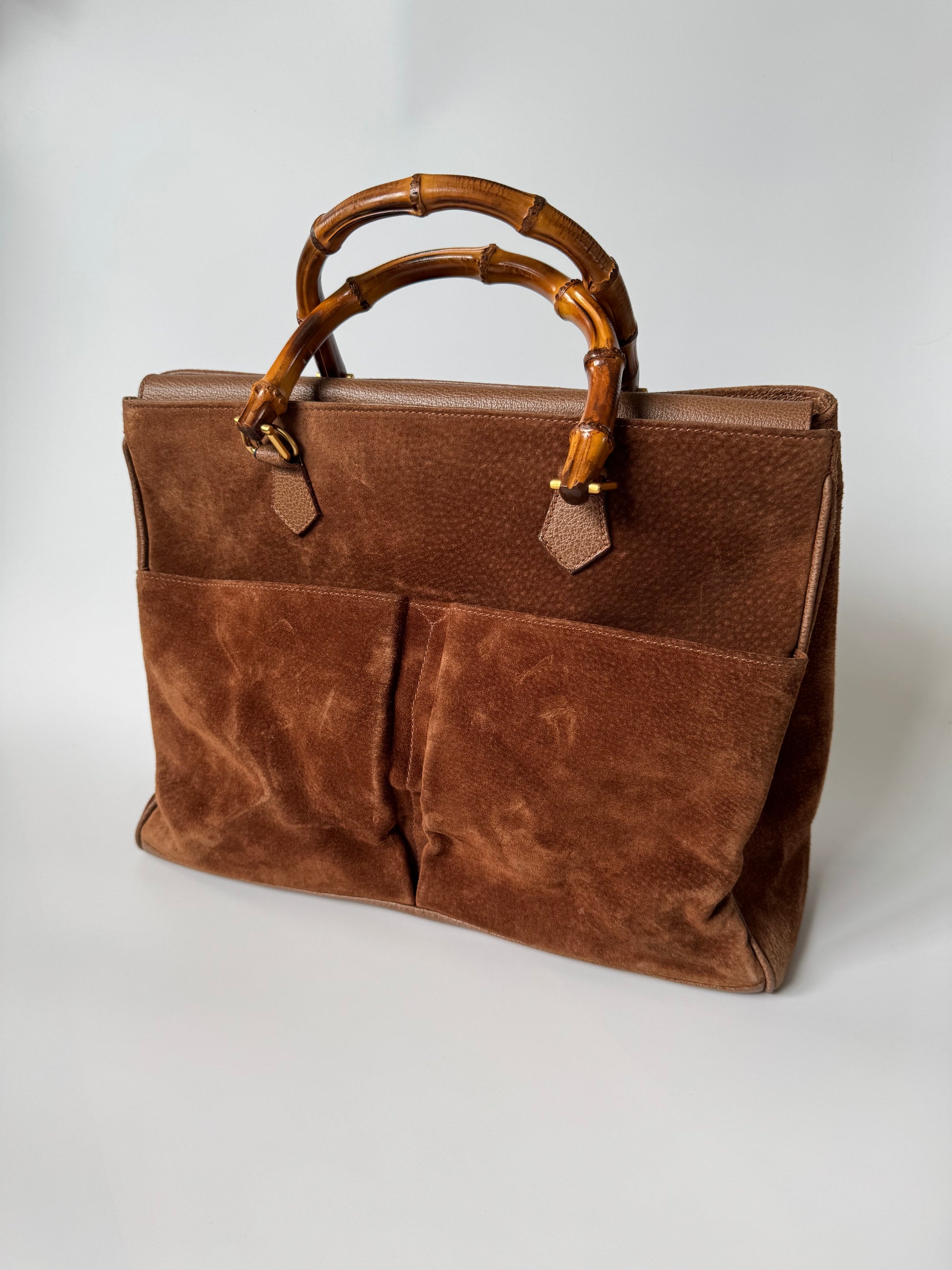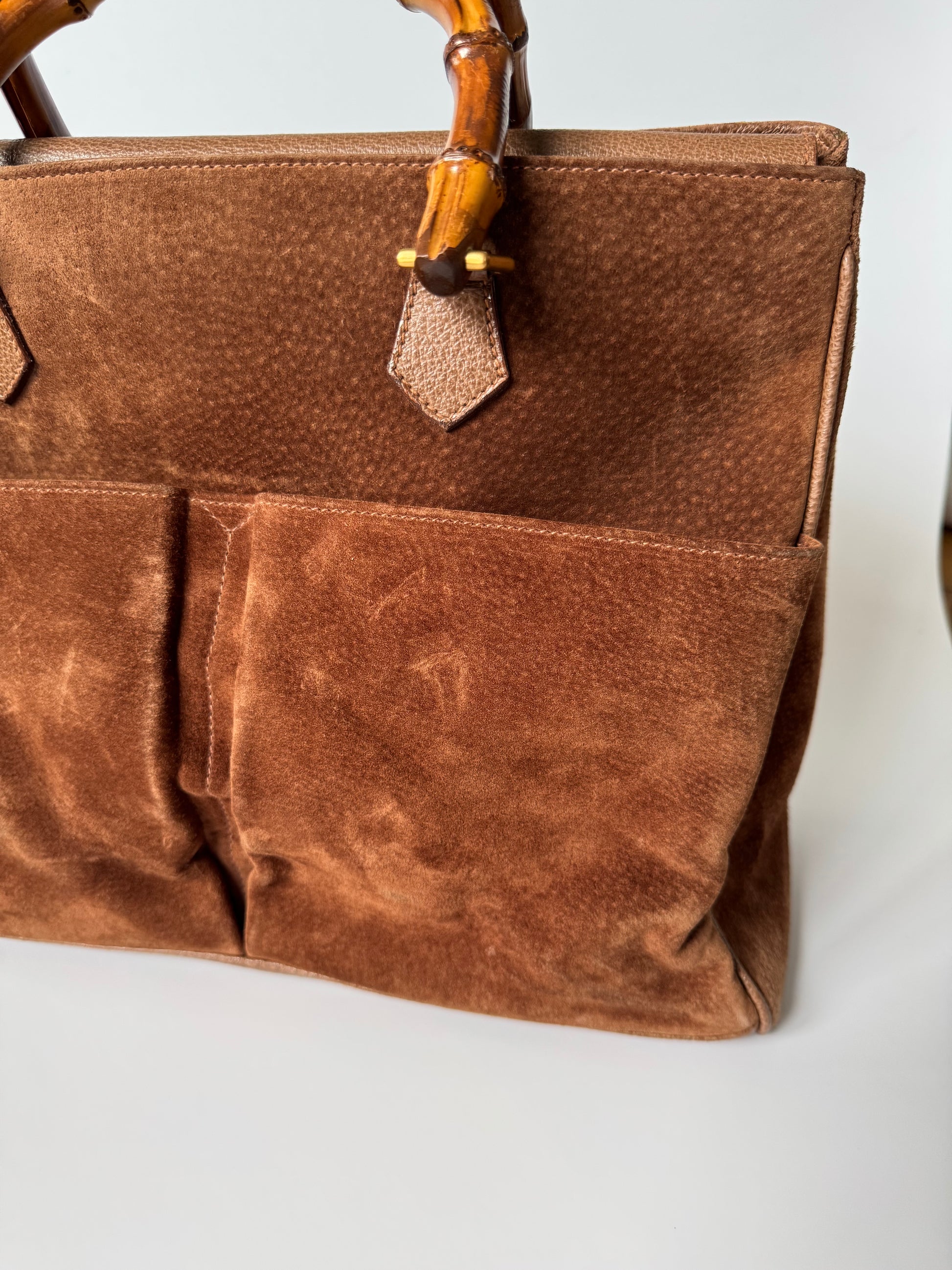 Crafted in rich brown suede with leather trim, this Gucci classic features the house’s iconic bamboo handles and dual exterior slip pockets — blending practicality with timeless vintage charm.