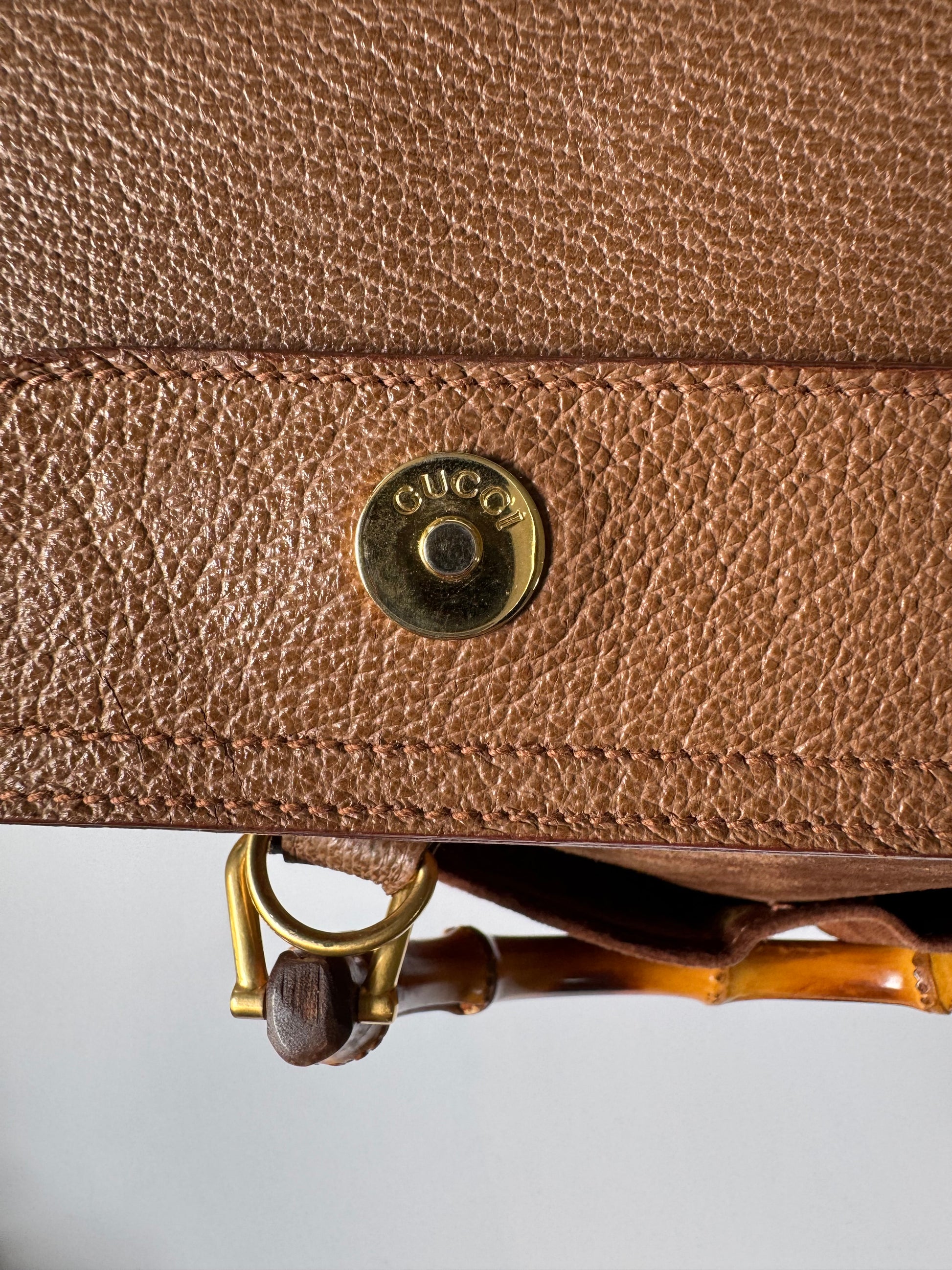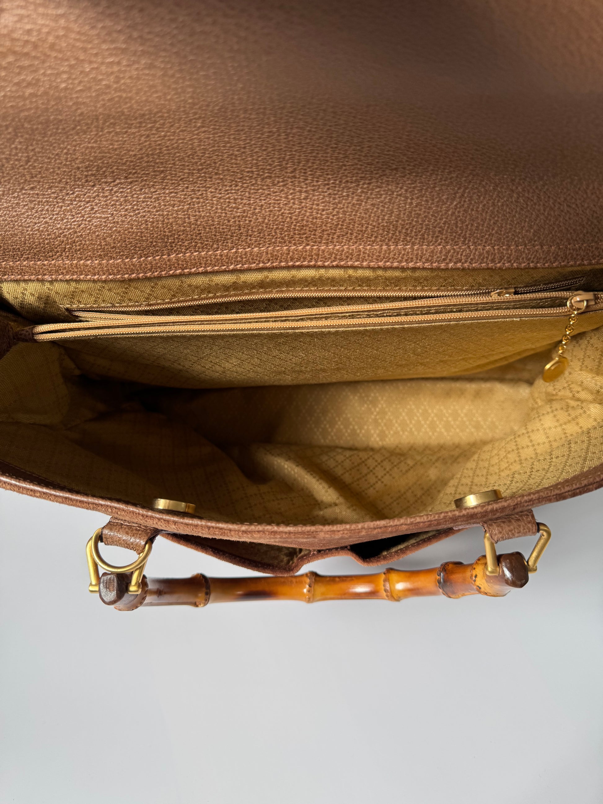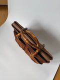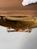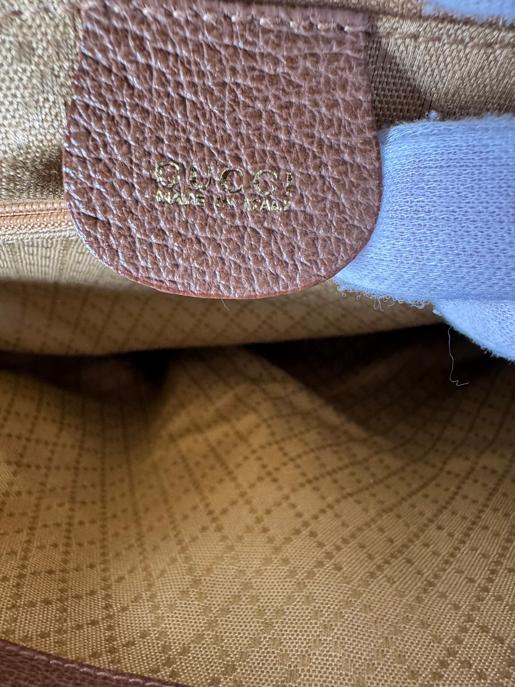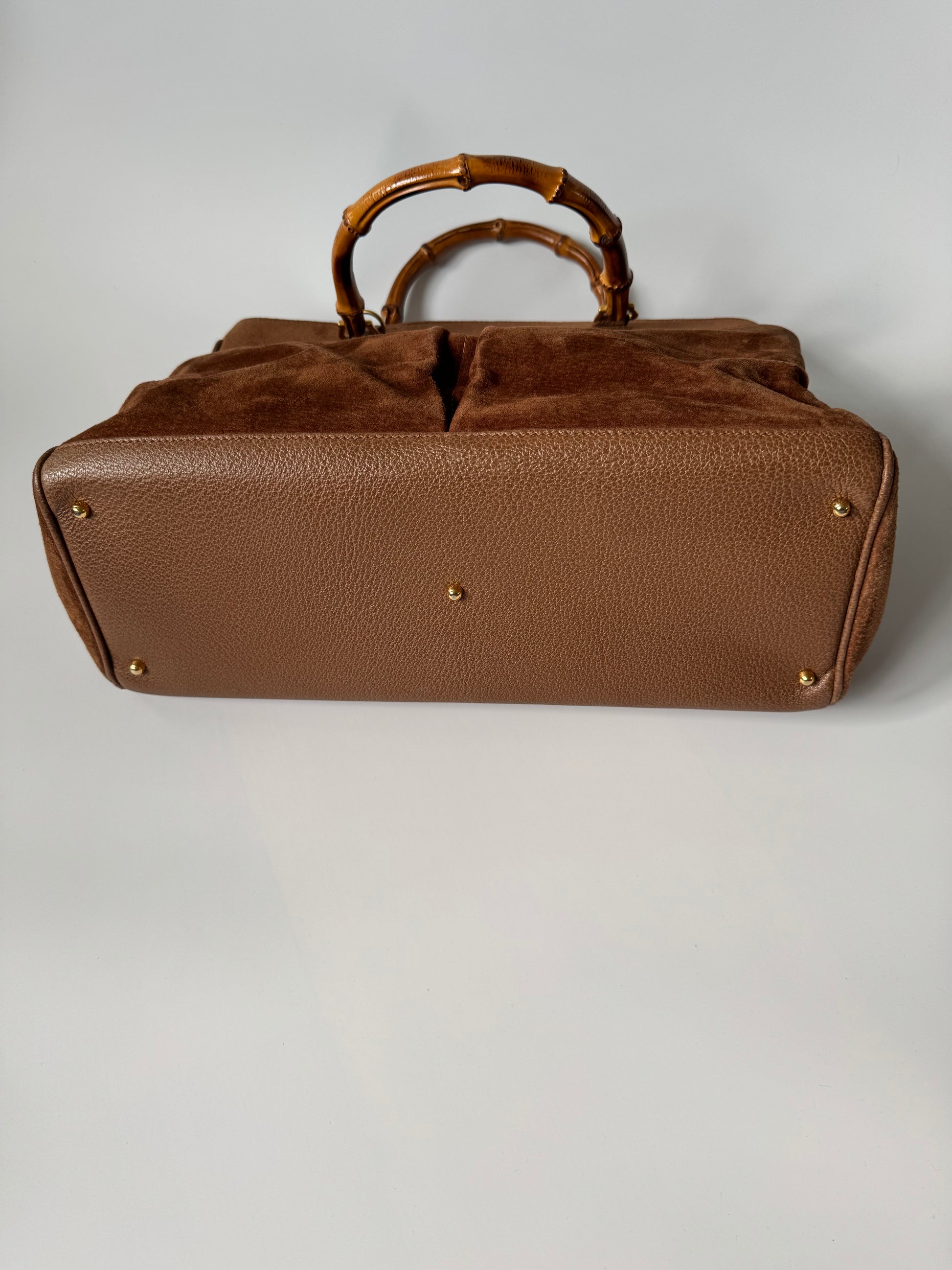 Crafted in rich brown suede with leather trim, this Gucci classic features the house’s iconic bamboo handles and dual exterior slip pockets — blending practicality with timeless vintage charm.
