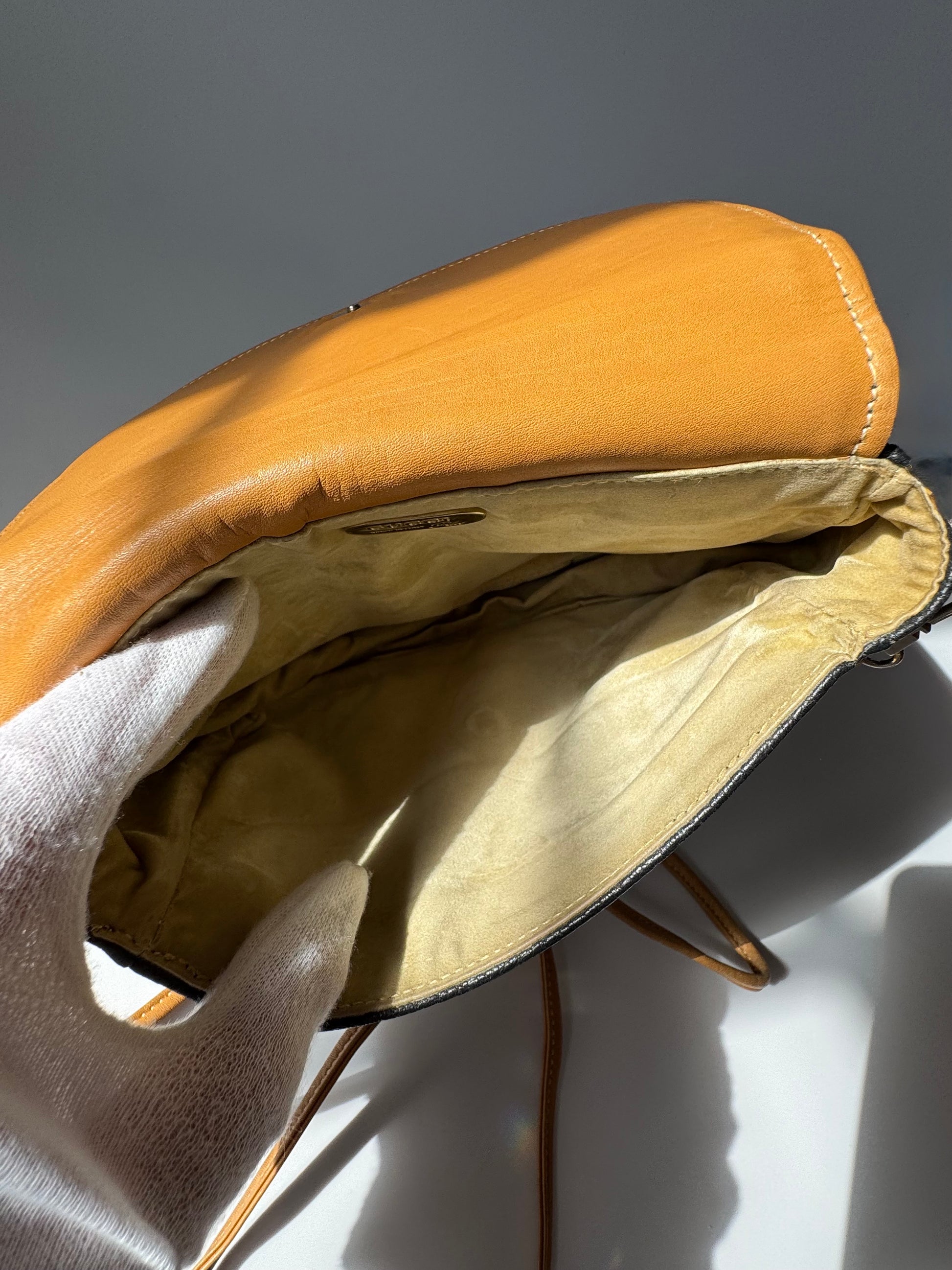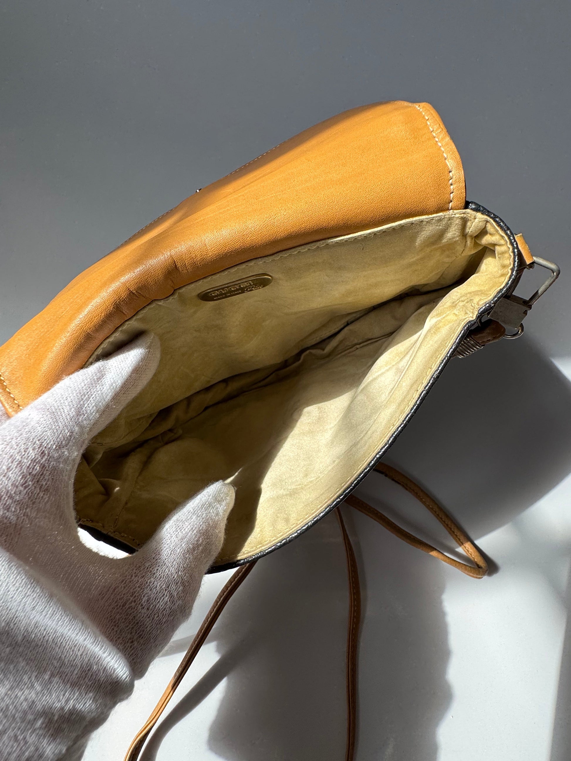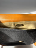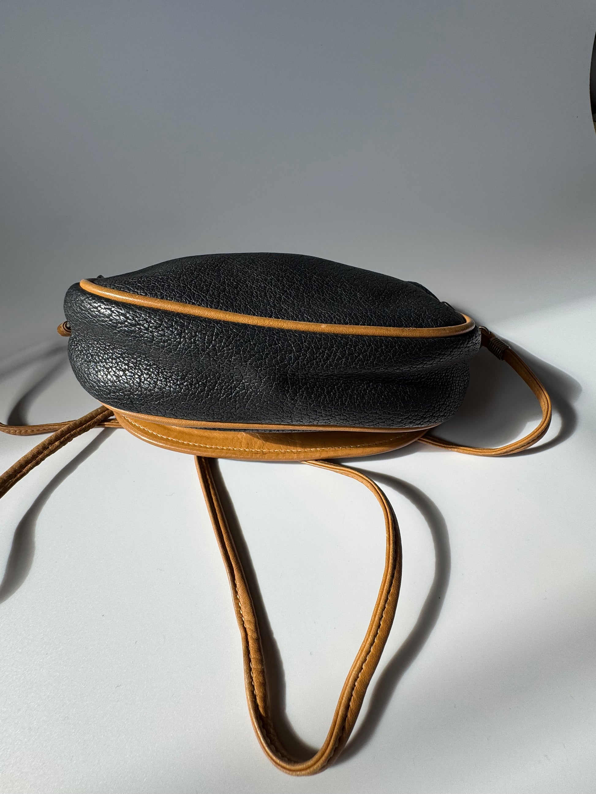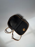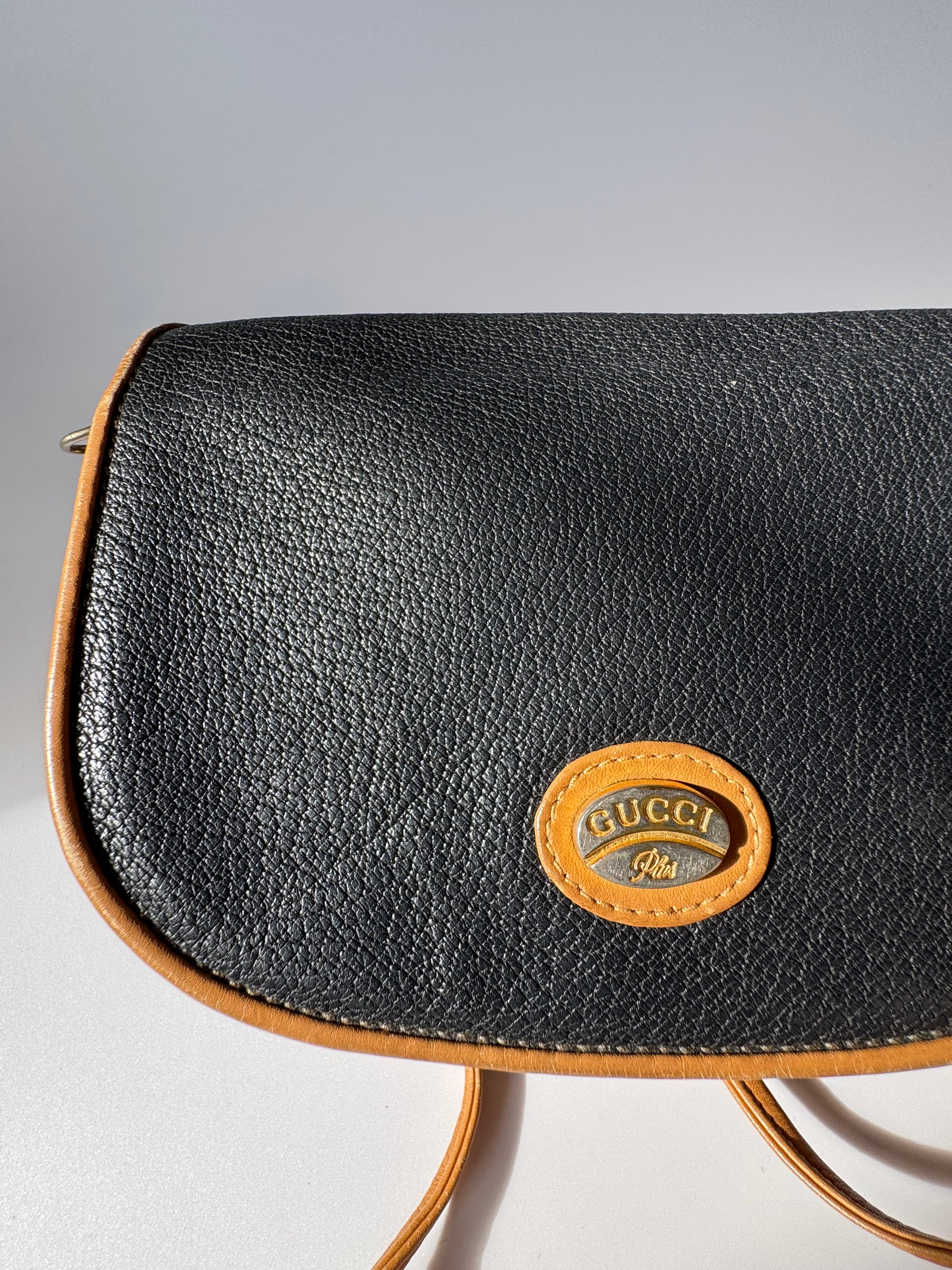 Crafted in black textured leather with contrasting tan trim, this Gucci crossbody features the signature Accessory Collection logo plaque in gold tone. Lightweight and practical, it captures the understated elegance of 1980s Gucci design.