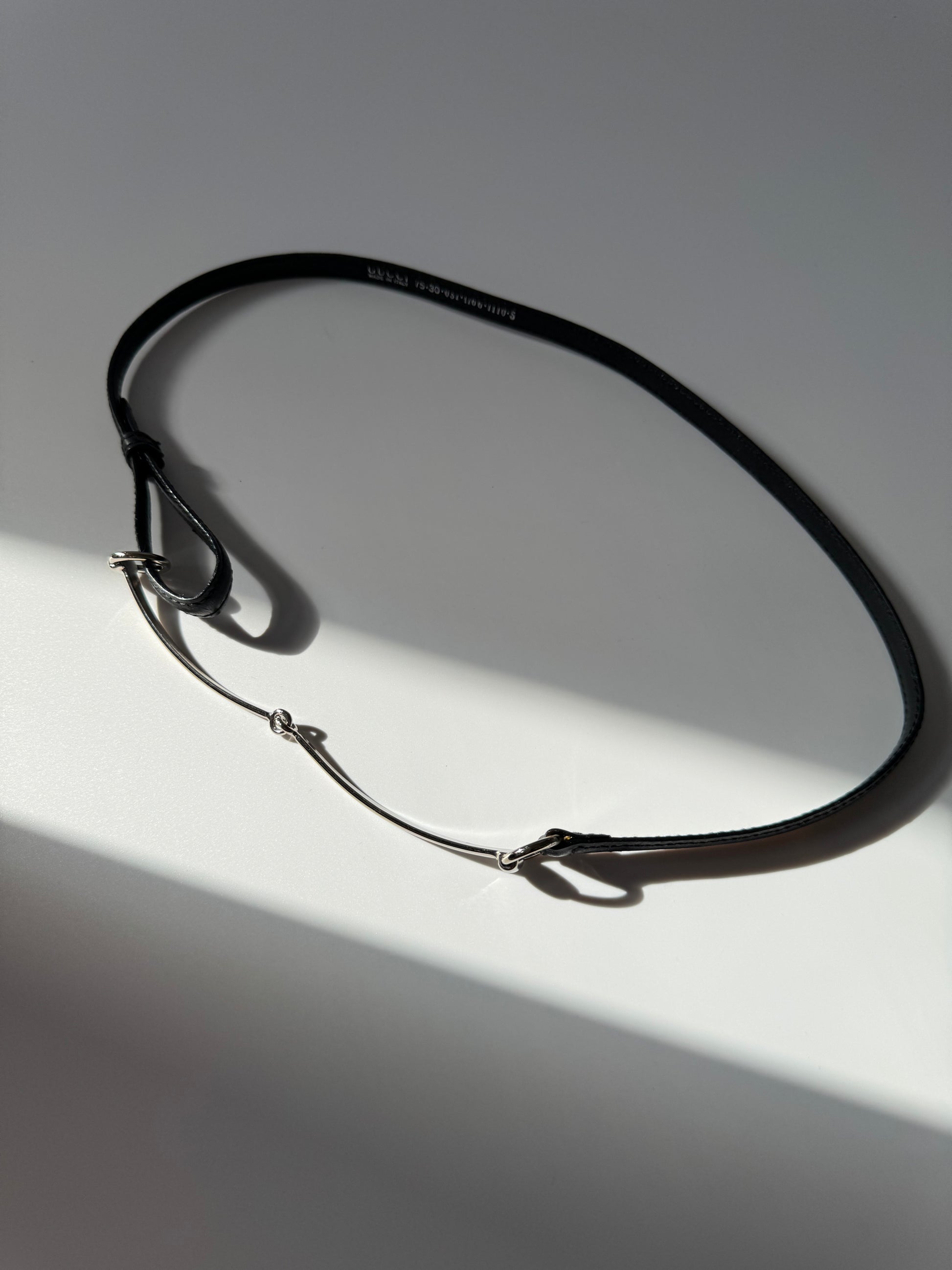 Sleek black leather belt finished with Gucci’s iconic silver-tone horsebit — a minimal, equestrian-inspired classic that elevates both casual and tailored looks.