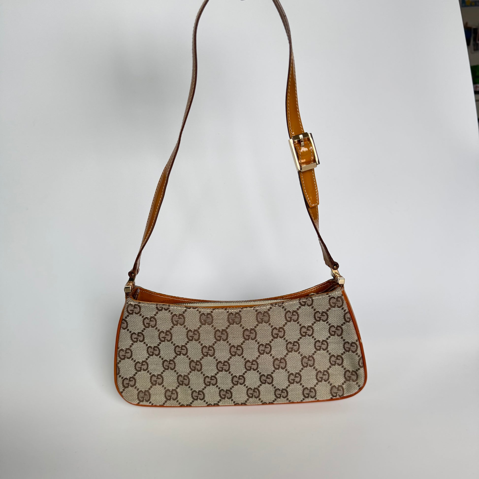 A timeless Gucci icon — crafted in classic GG Supreme canvas with warm tan leather trim and an adjustable strap. Effortlessly chic and perfectly sized for everyday essentials.