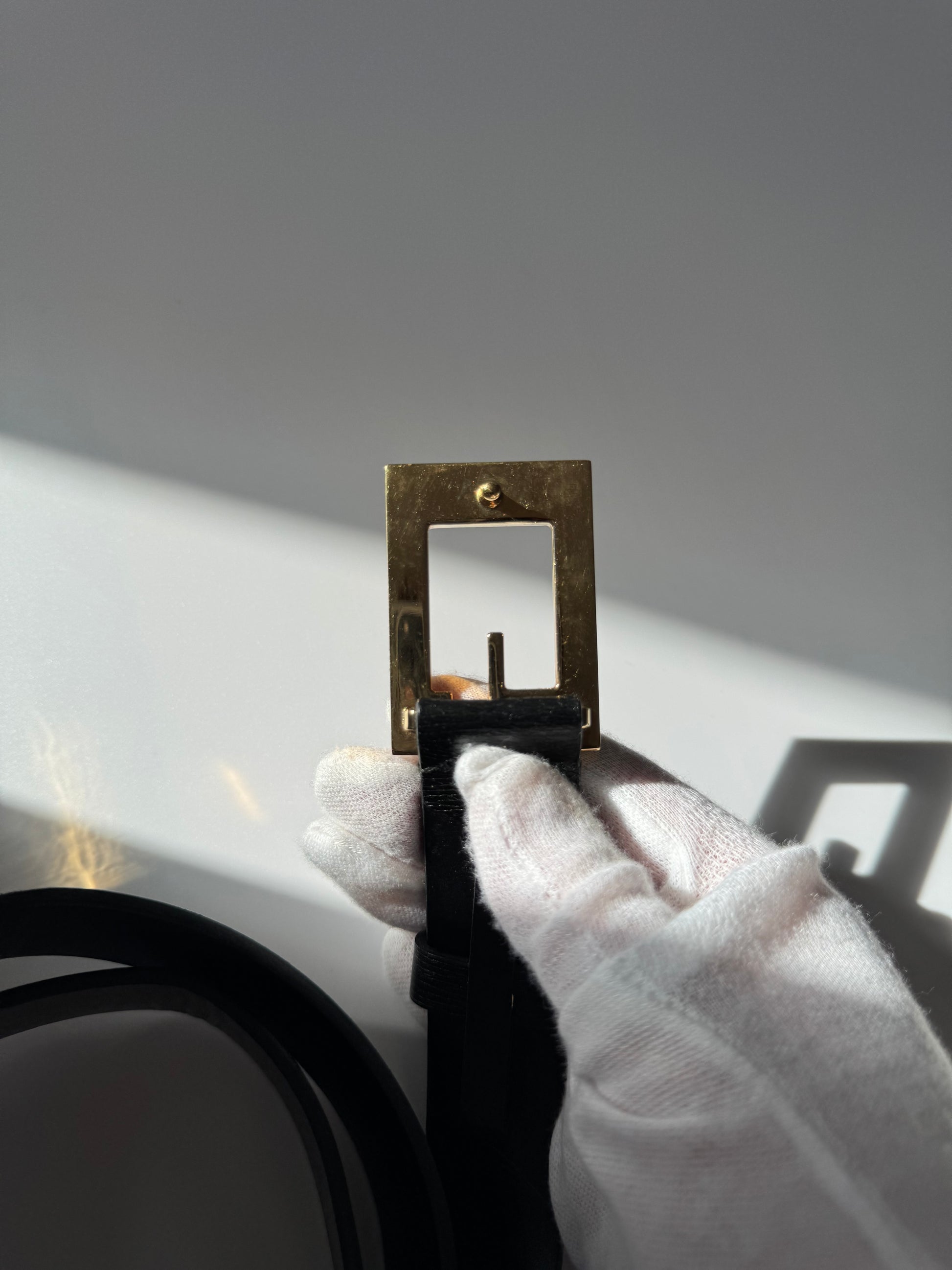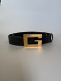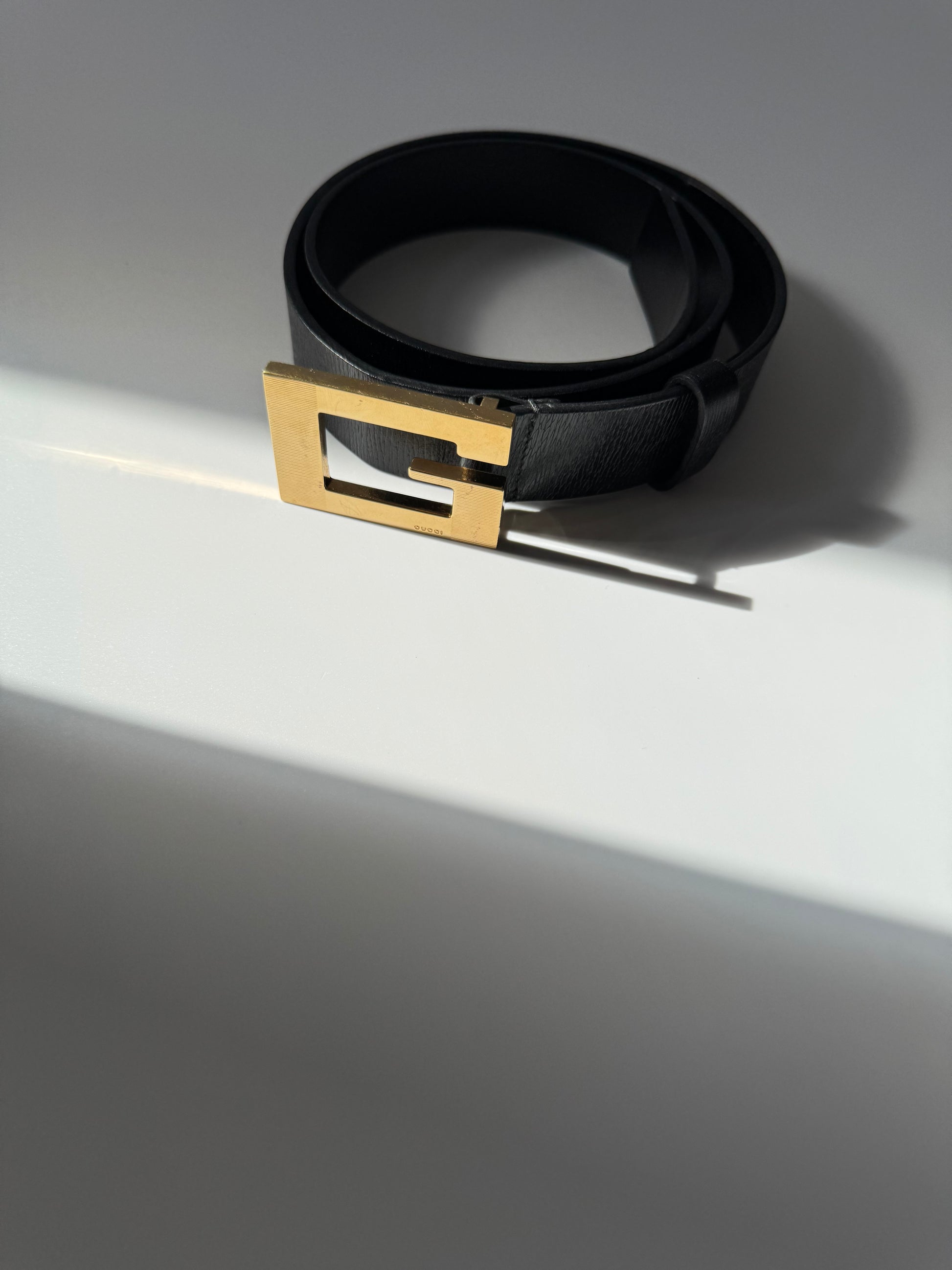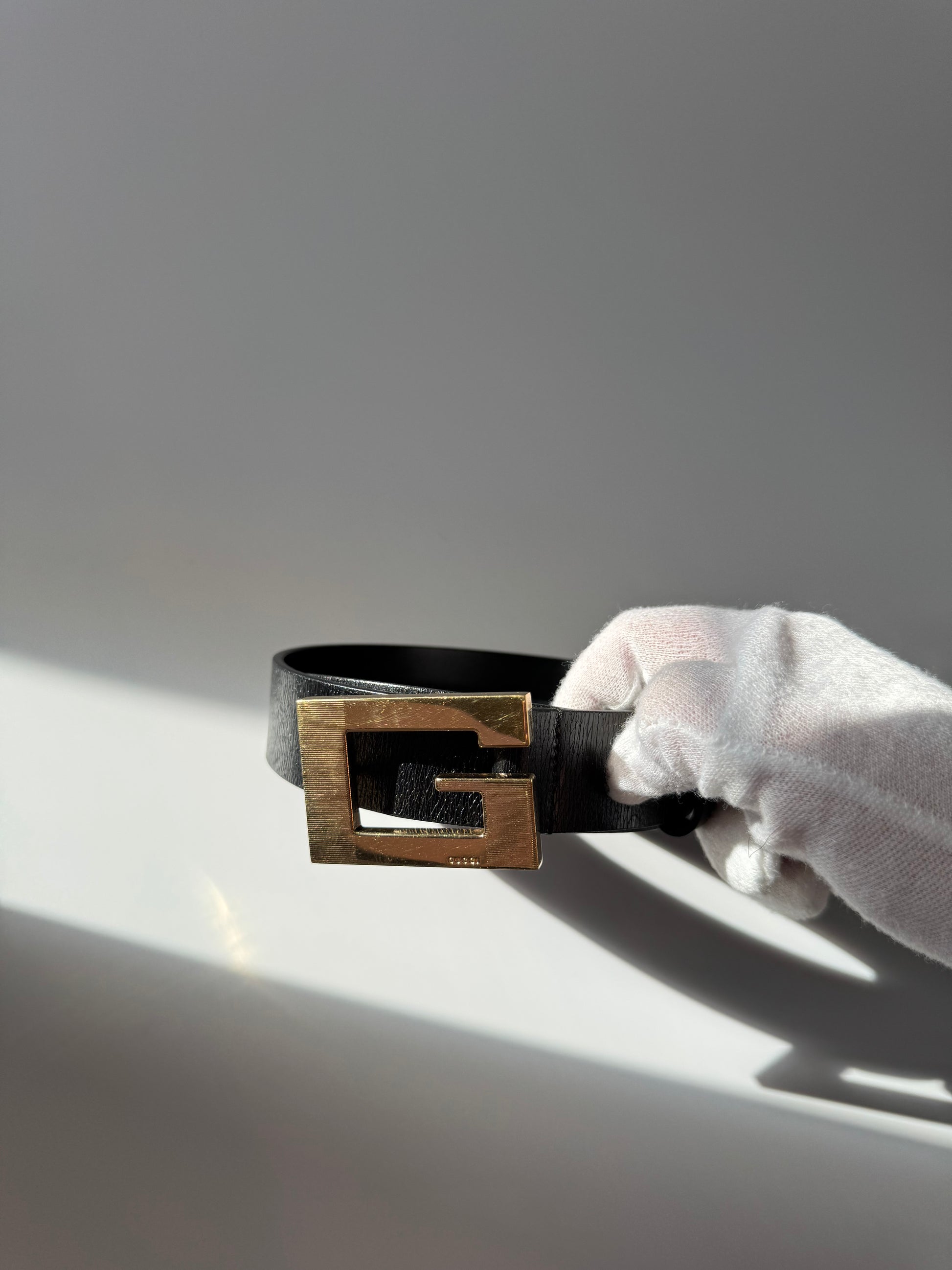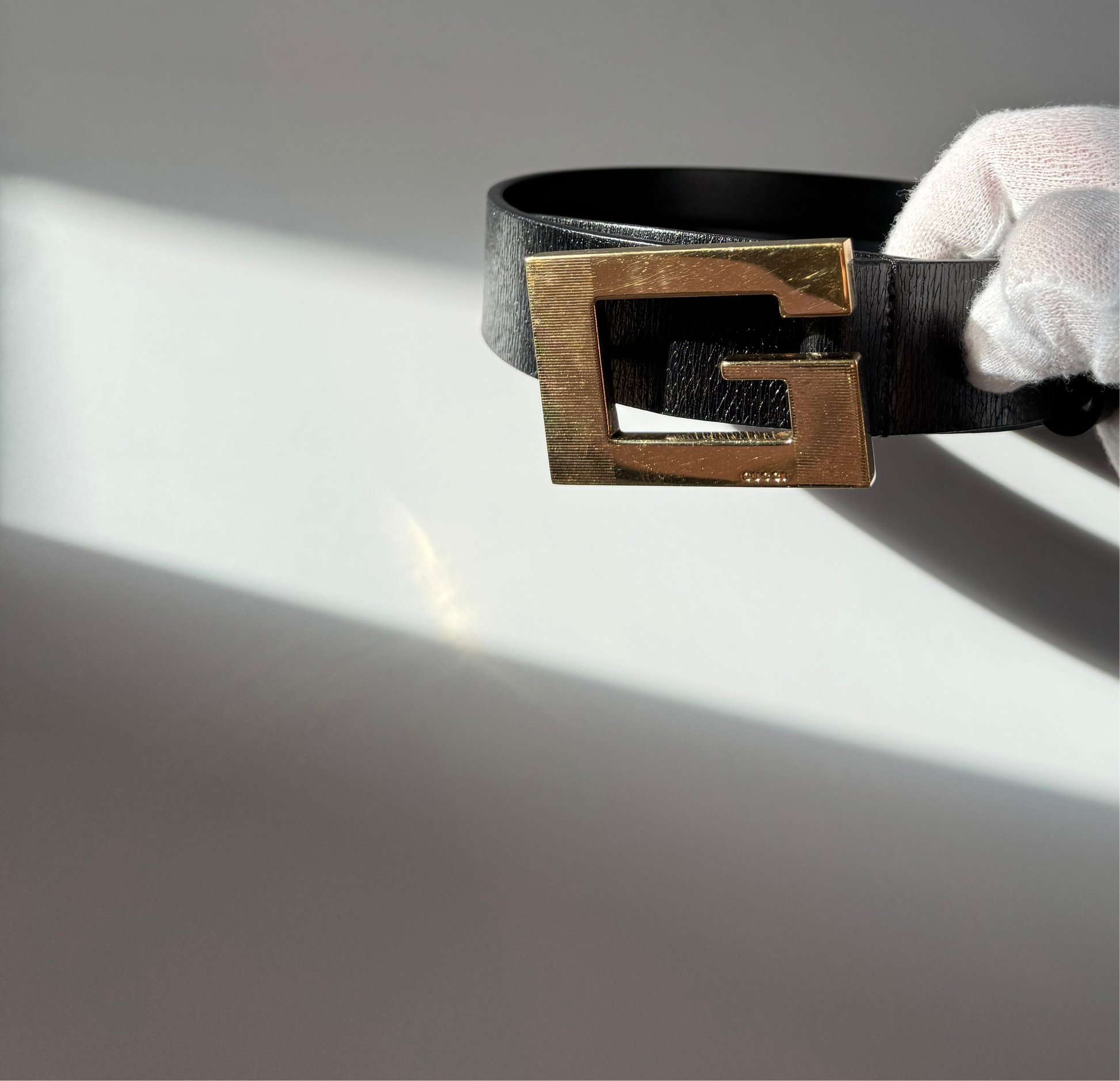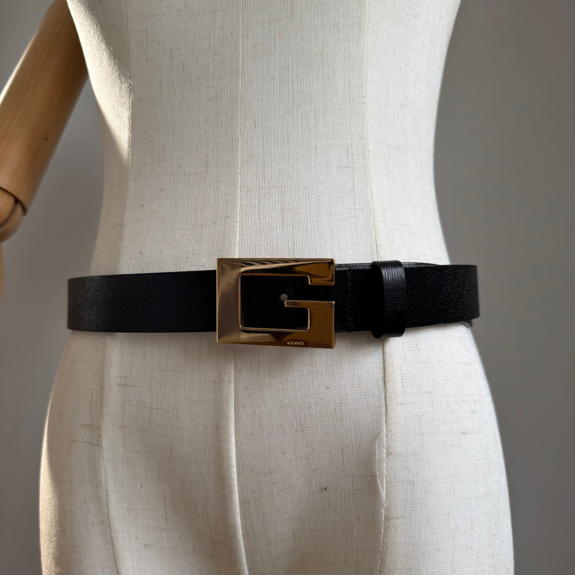 Smooth black leather belt finished with a bold gold-tone square “G” buckle — a minimalist yet striking vintage Gucci statement for denim, tailoring, or dresses.