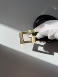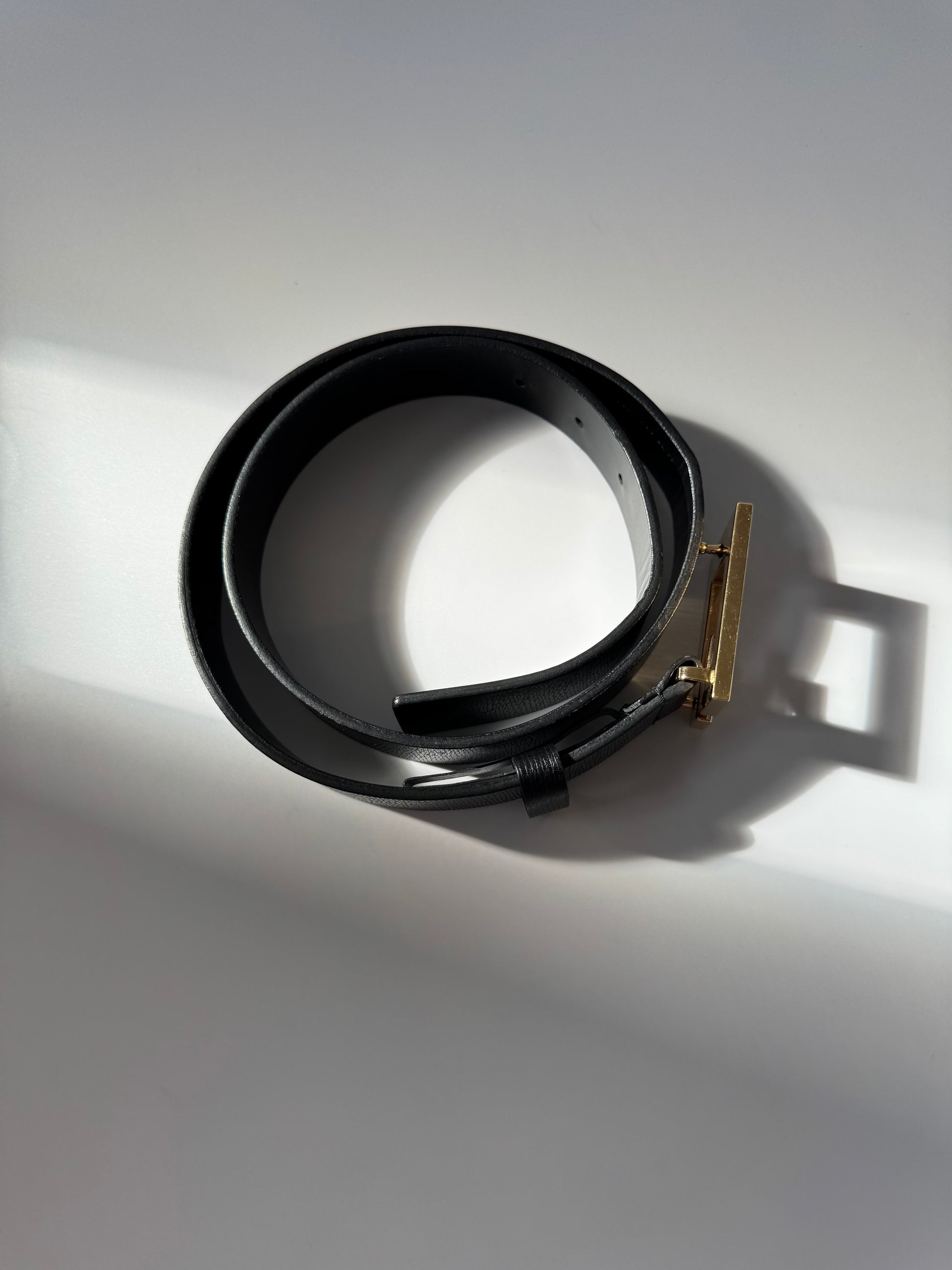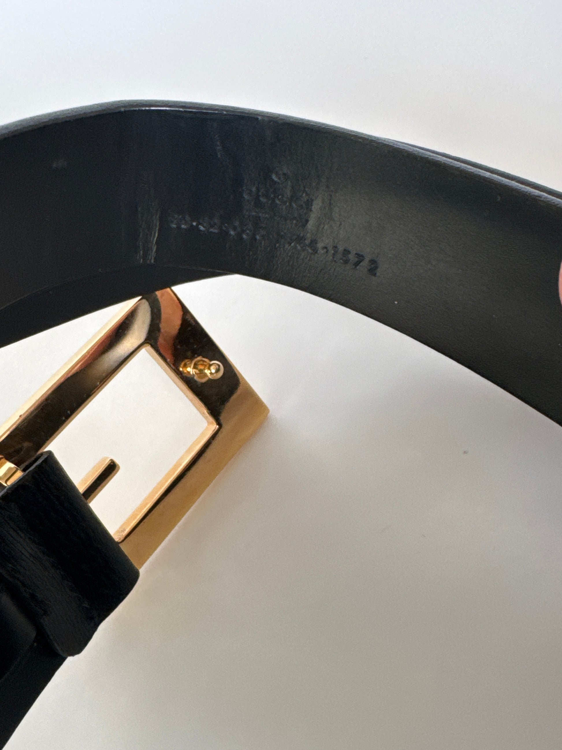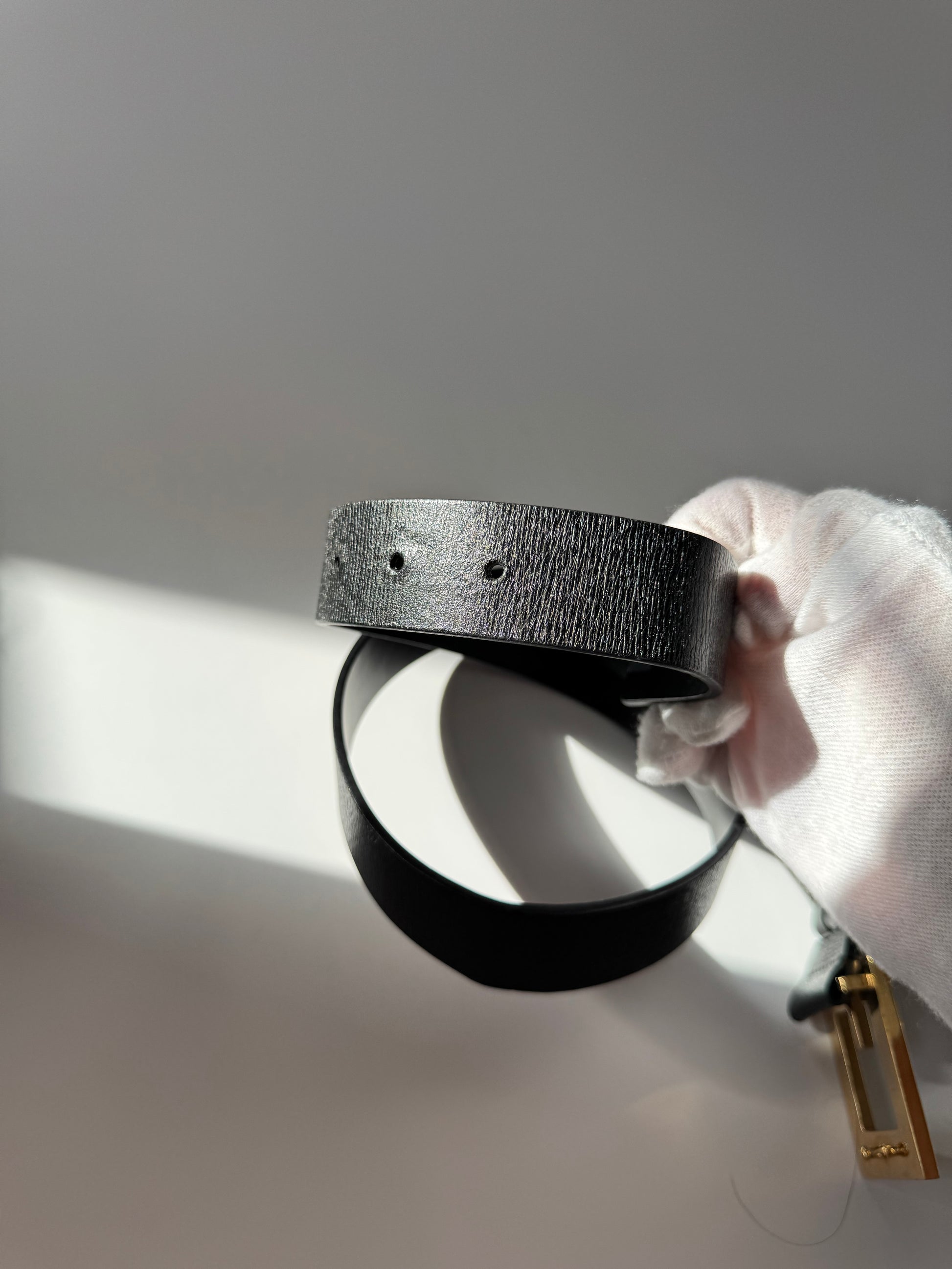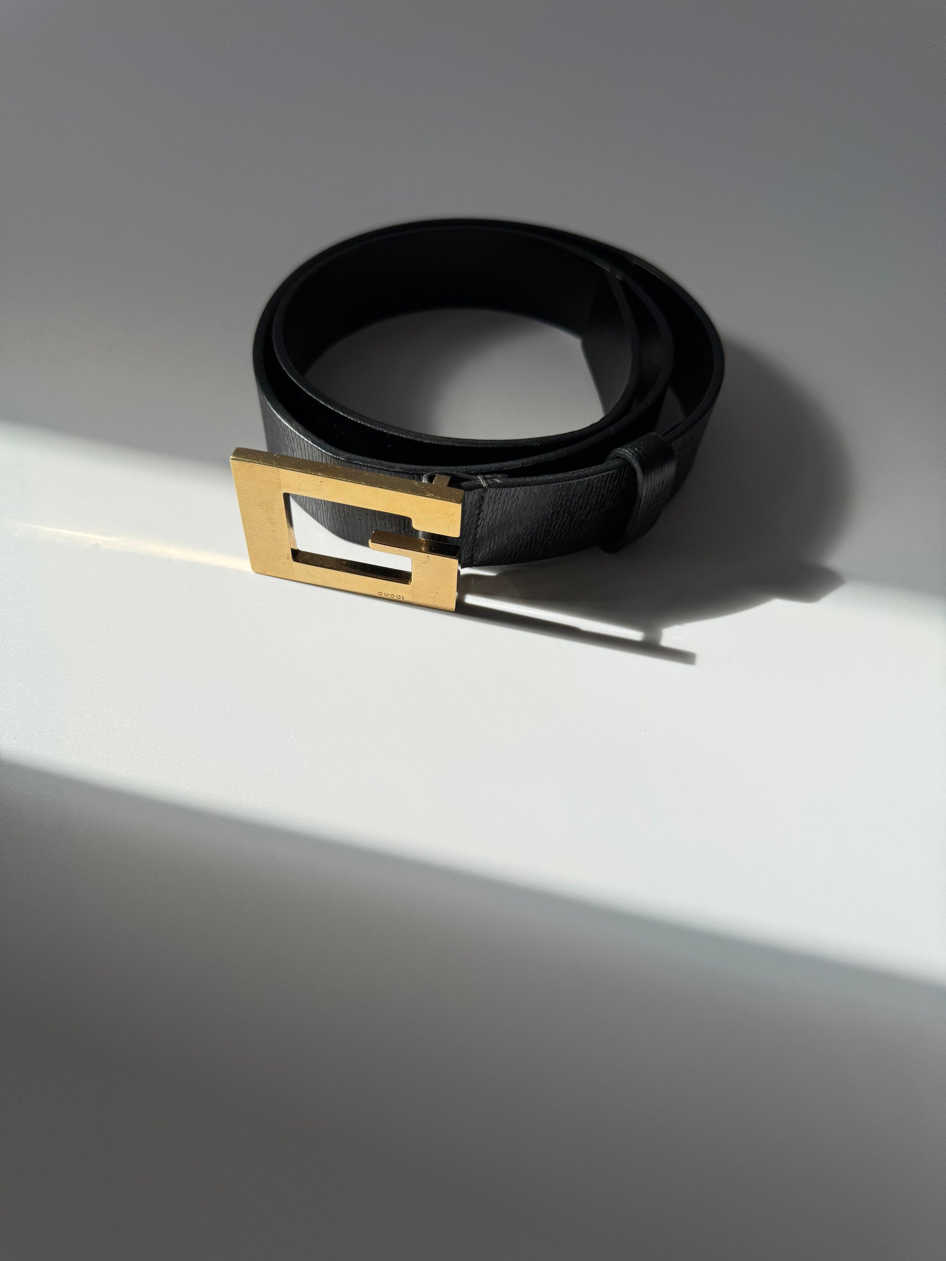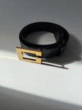 Smooth black leather belt finished with a bold gold-tone square “G” buckle — a minimalist yet striking vintage Gucci statement for denim, tailoring, or dresses.