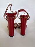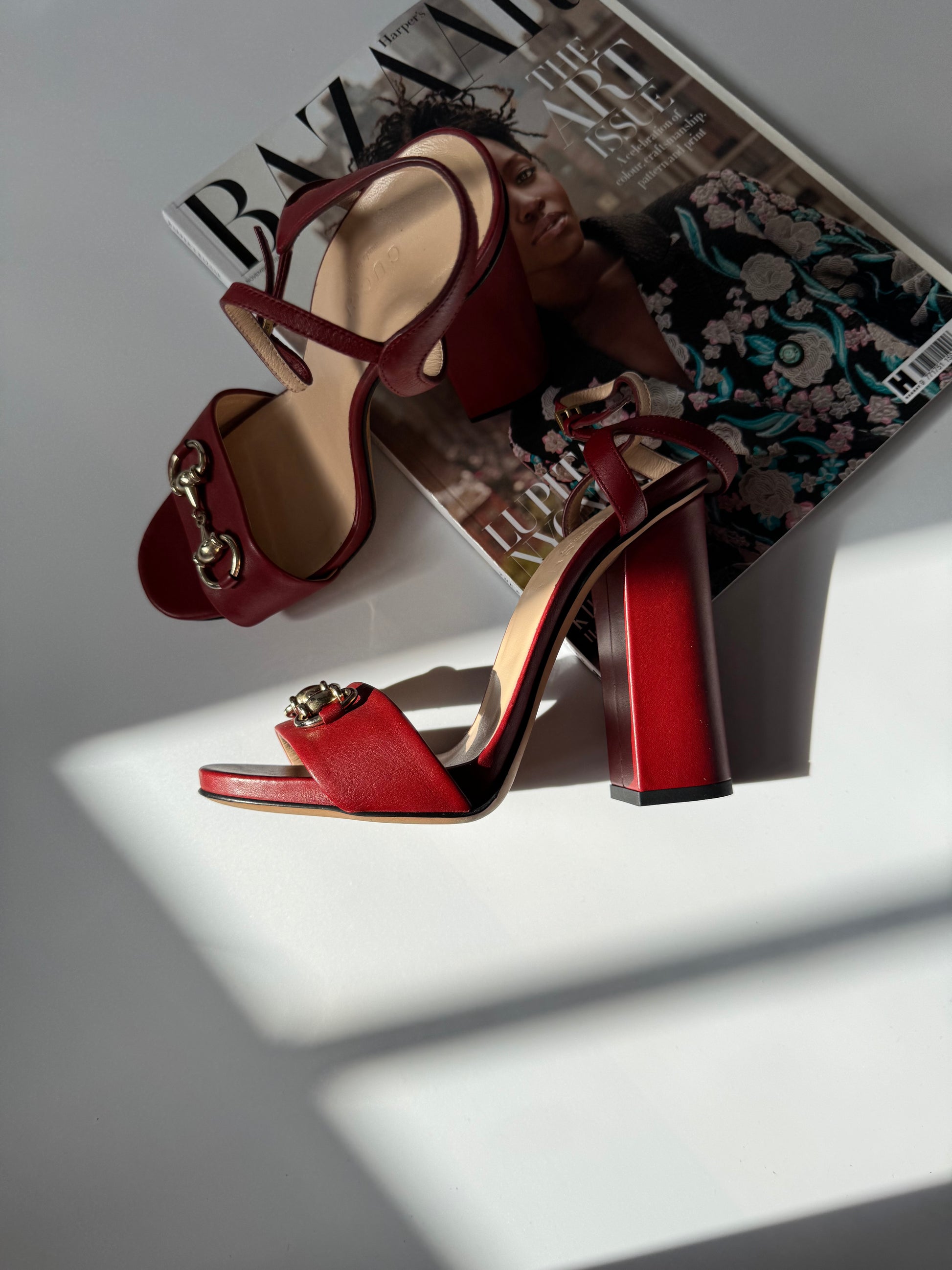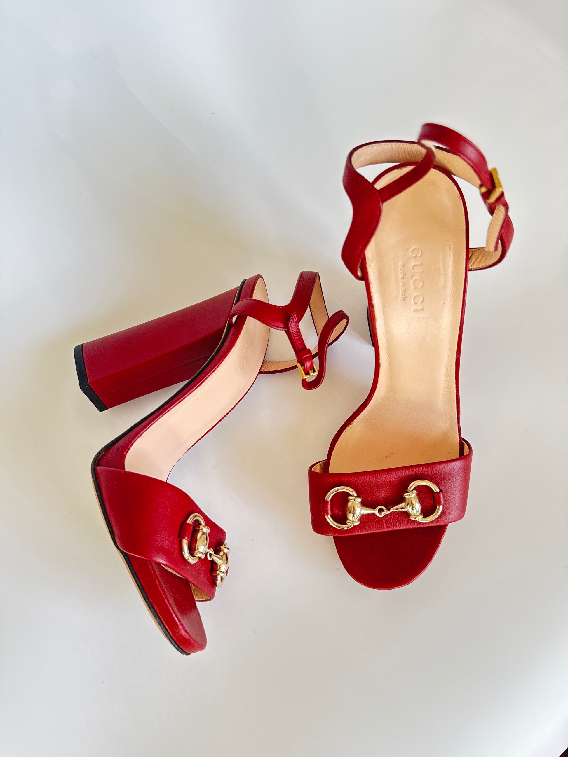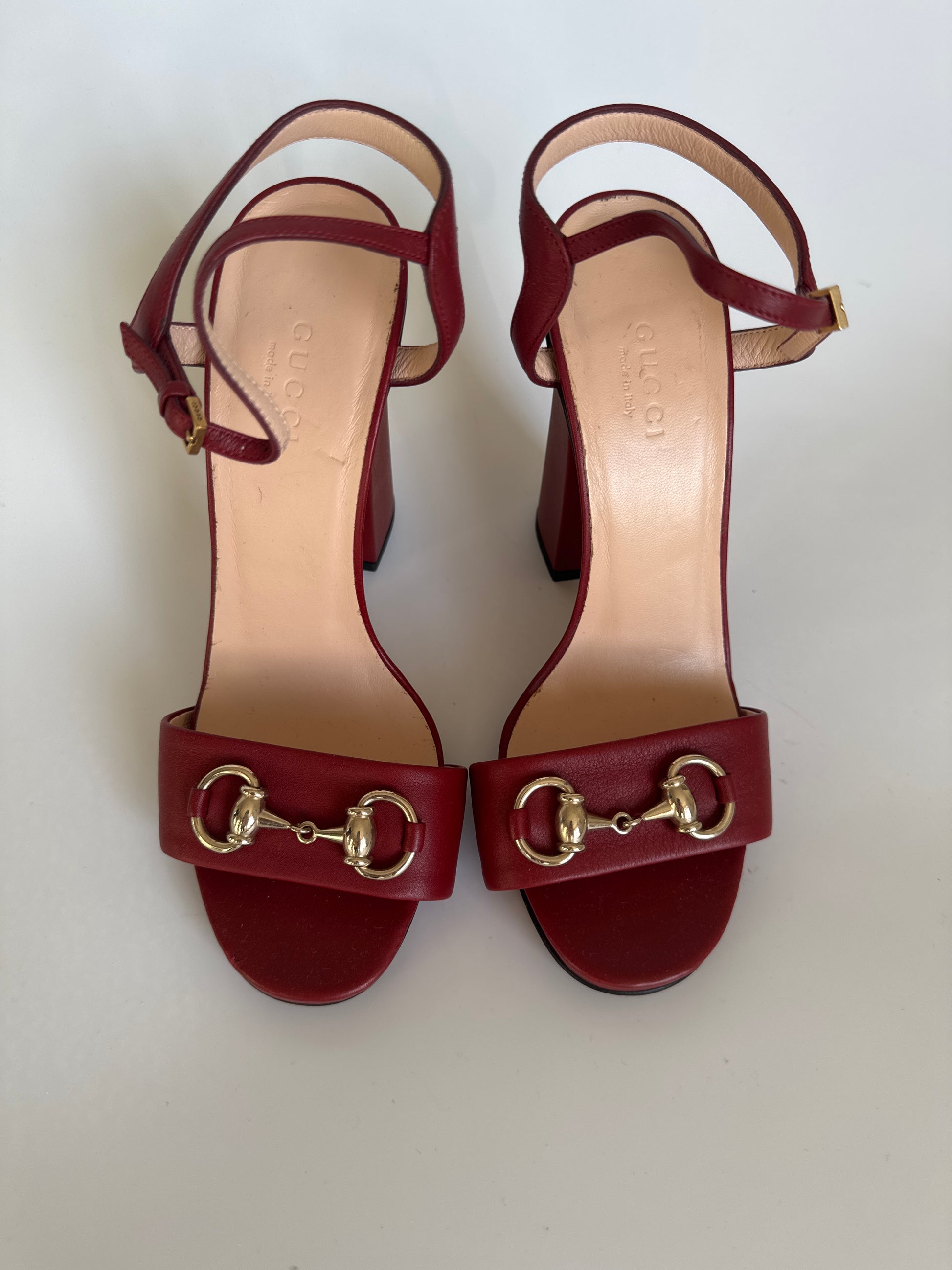 Crafted from rich burgundy leather, these Gucci sandals feature the house’s iconic gold-tone horsebit detail across the front strap. The adjustable ankle strap and mid block heel offer both elegance and comfort — perfect for summer evenings or polished daytime looks.