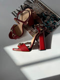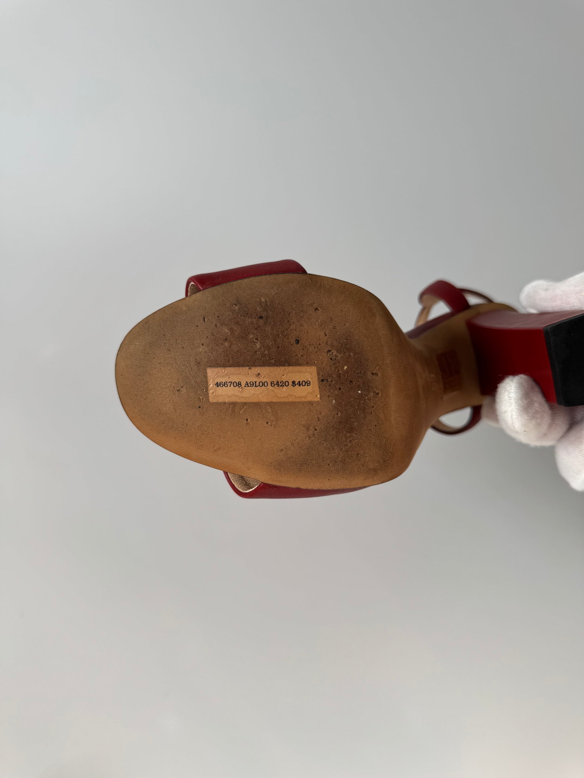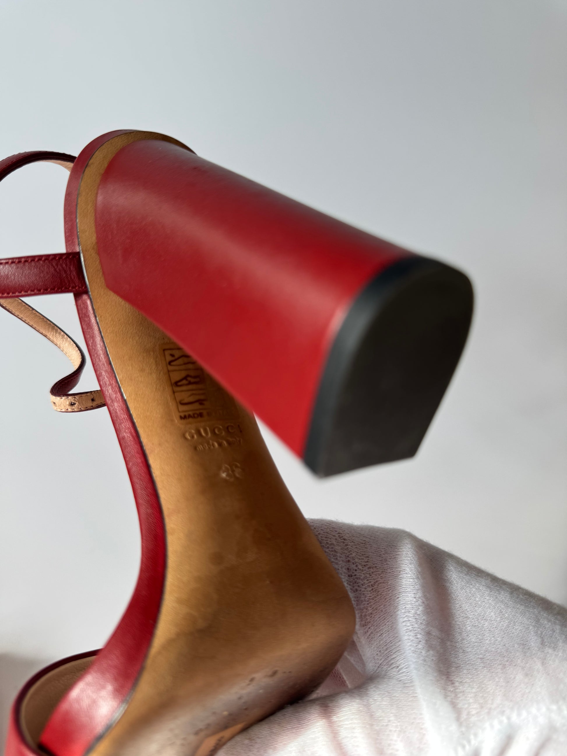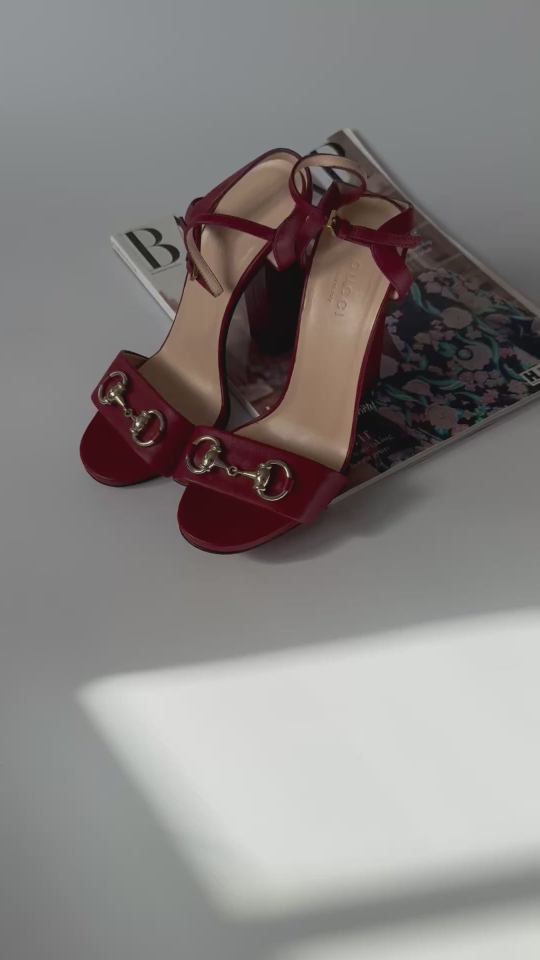 Crafted from rich burgundy leather, these Gucci sandals feature the house’s iconic gold-tone horsebit detail across the front strap. The adjustable ankle strap and mid block heel offer both elegance and comfort — perfect for summer evenings or polished daytime looks.