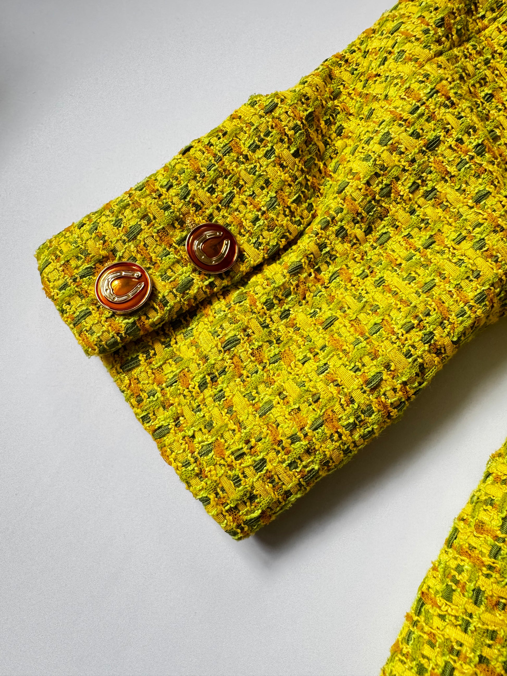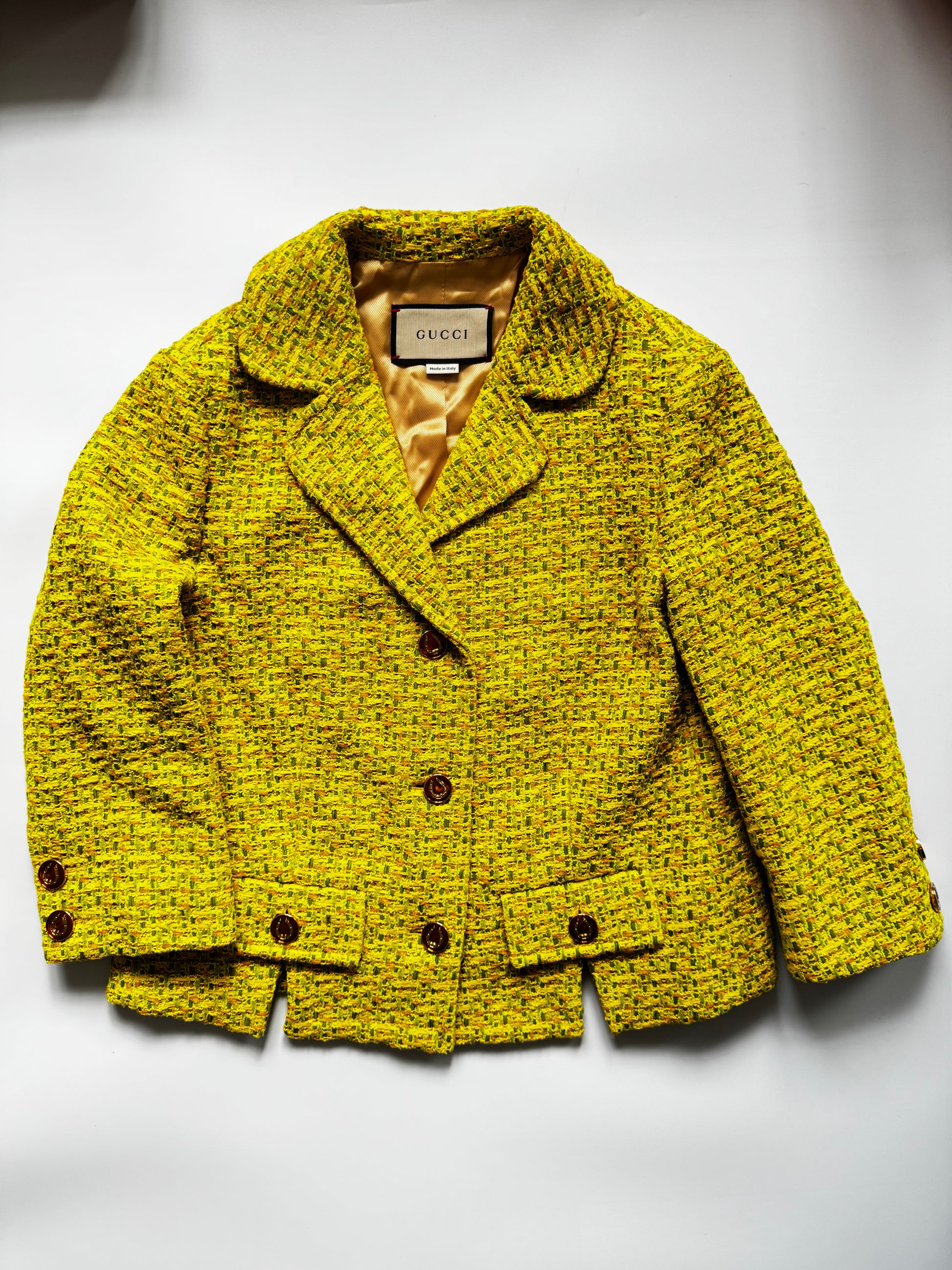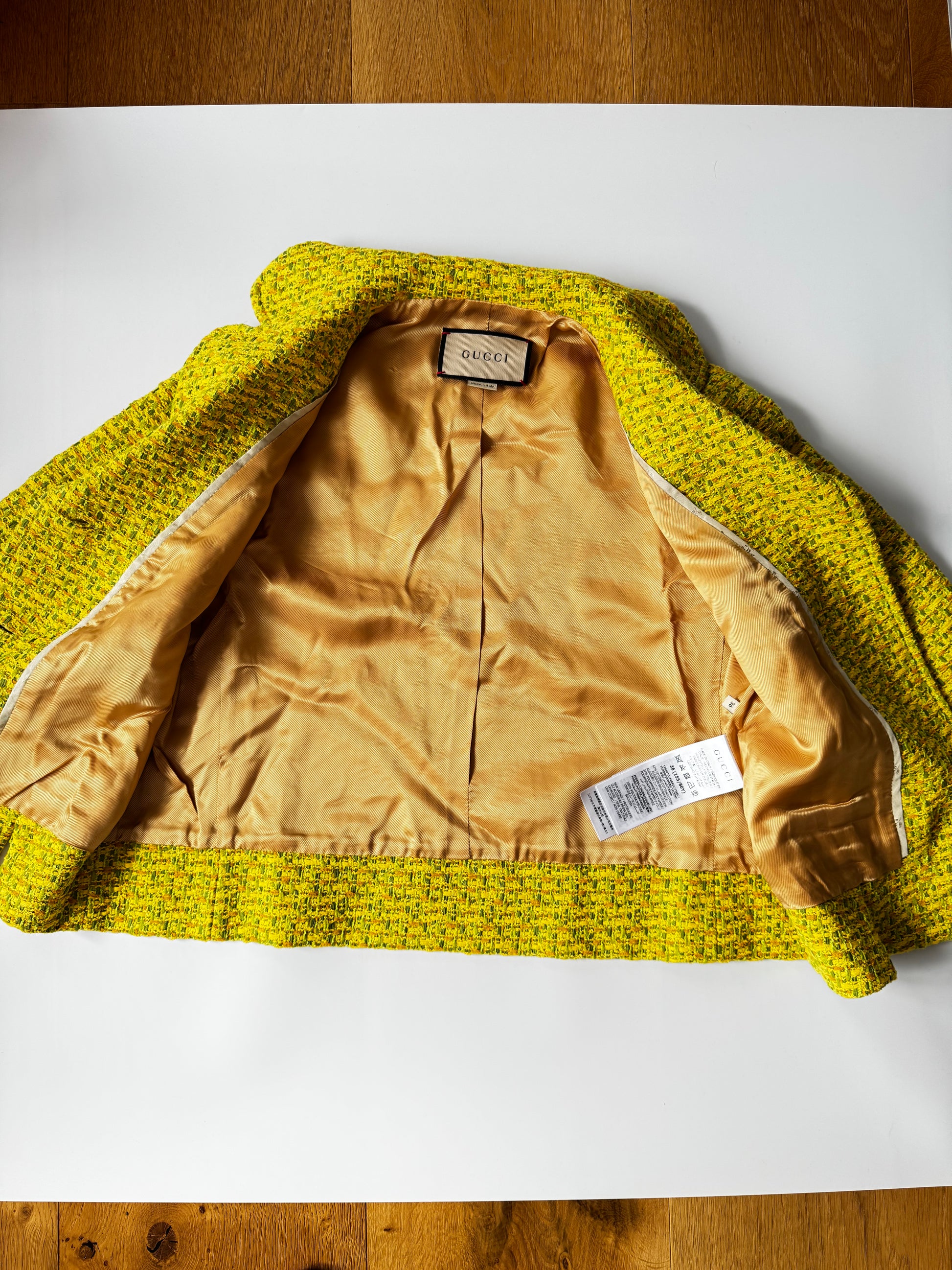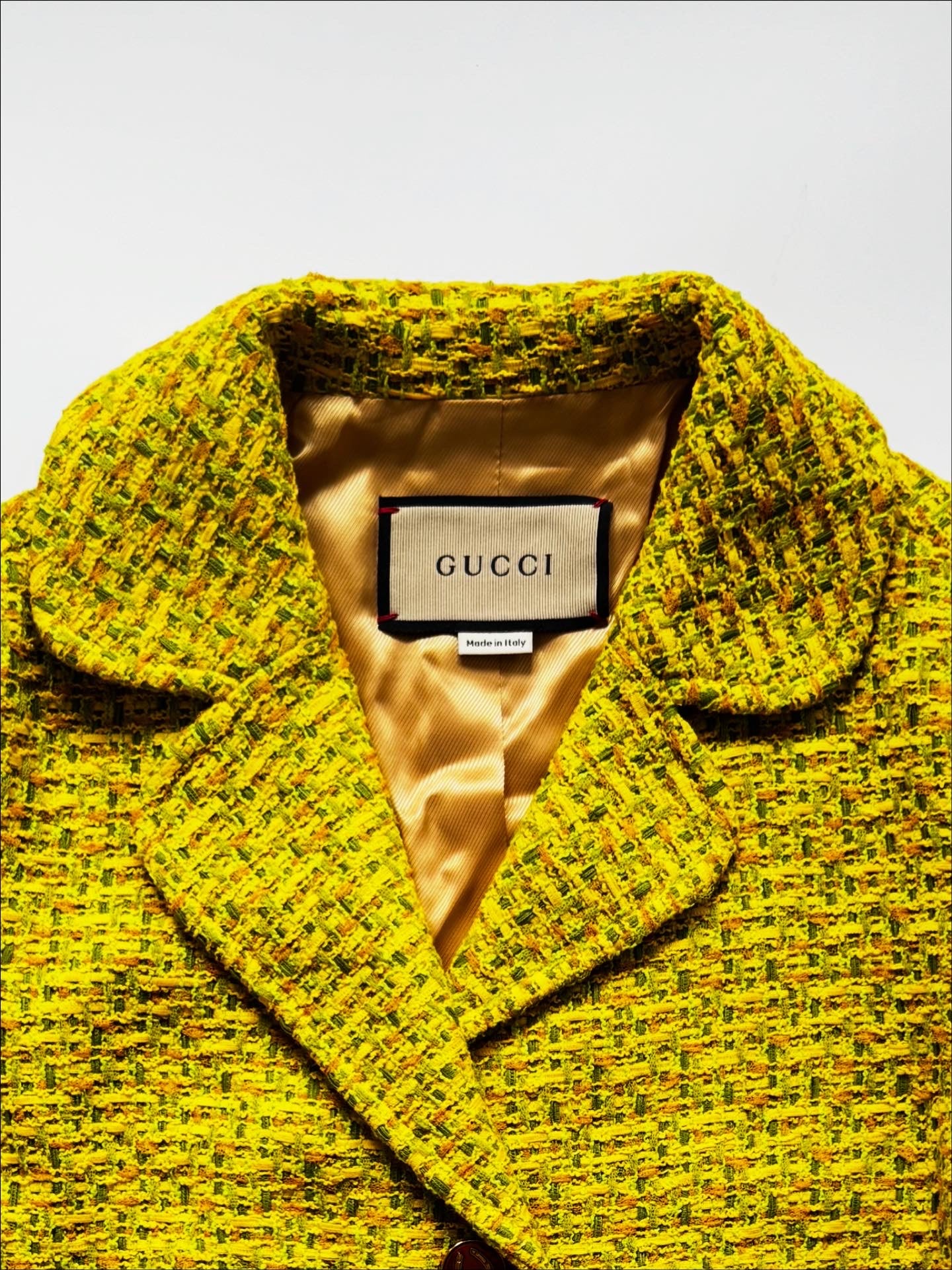 Crafted in vibrant yellow tweed with gold-tone horseshoe buttons. A chic two-piece set that embodies classic Gucci tailoring — timeless, structured, and feminine.